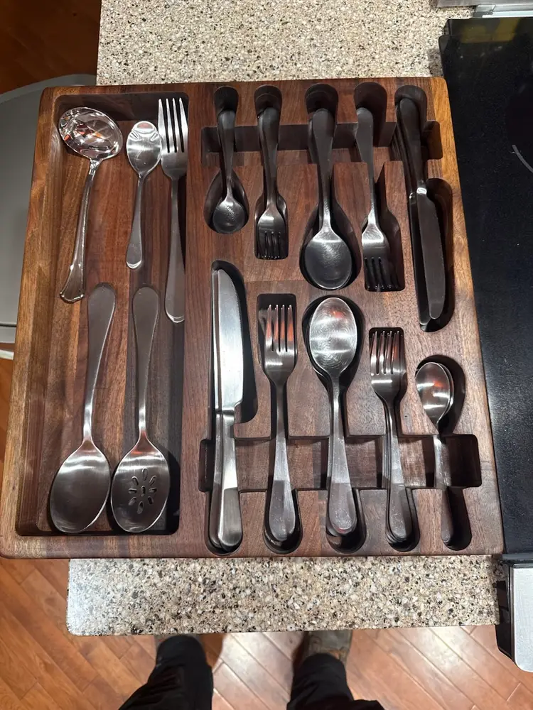 Details • Handcrafted from solid walnut • Finished with food-safe beeswax • Holds up to 24 place settings • Precision-cut utensil slots for clean organization • Durable, heirloom-quality construction