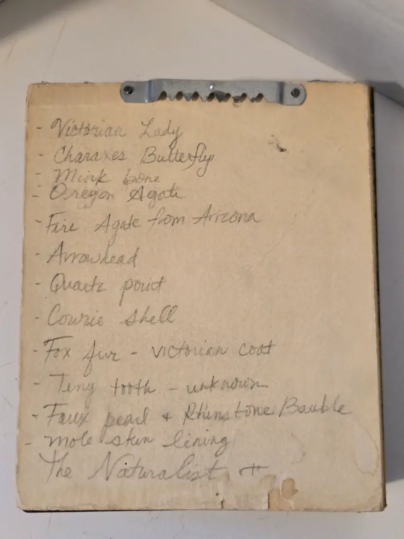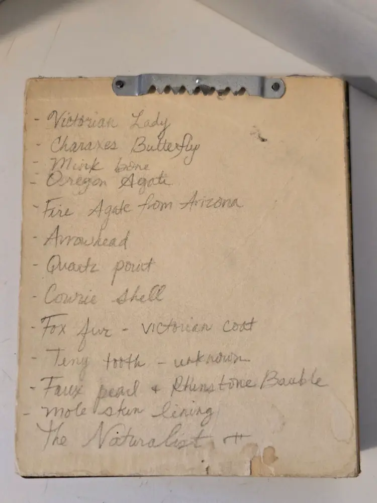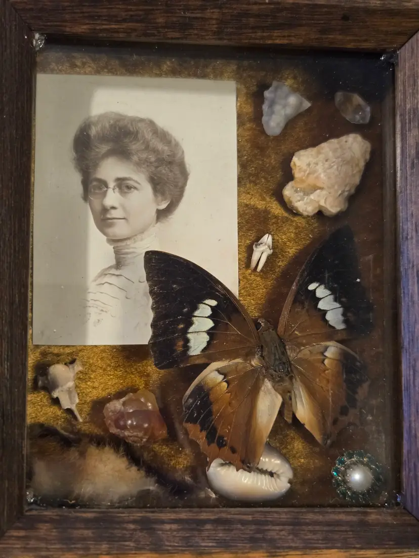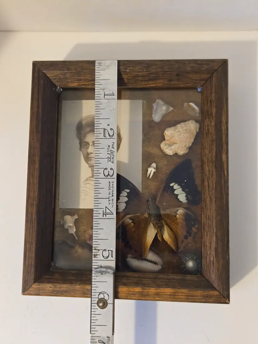 This wonderful shadowbox Vignette features a beautiful Victorian Lady, a butterfly, arrowhead and several other interesting little treasures that are all listed on the back. It measures approximately 5.9×5×.6 inches.
