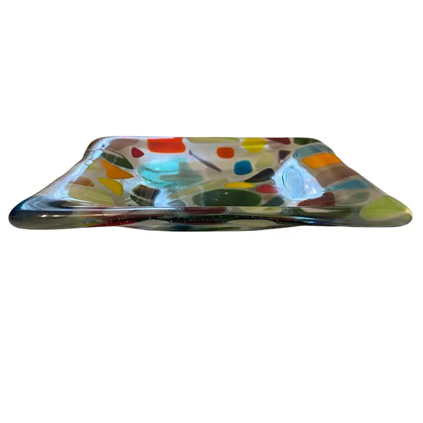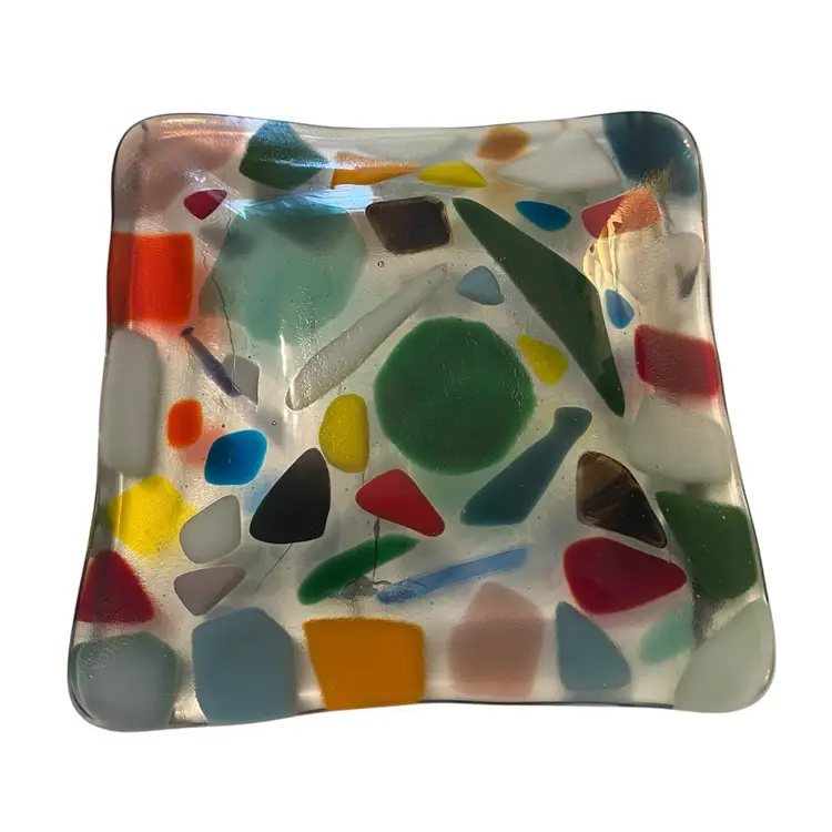This is a handmade multicolored fused glass dish with a "crazy paving" design trinket dish 6x6