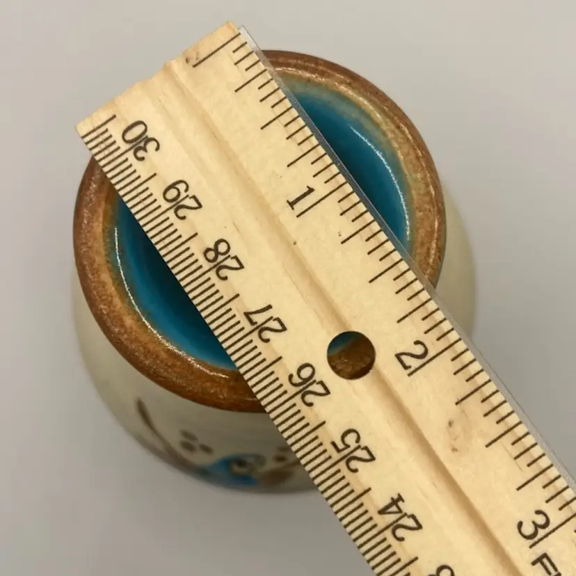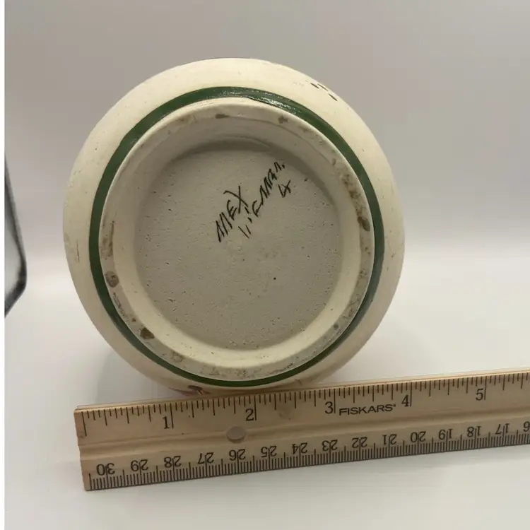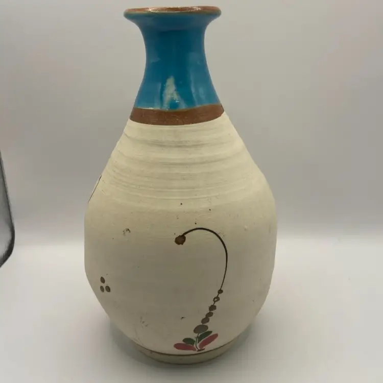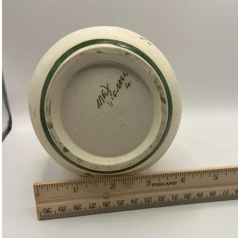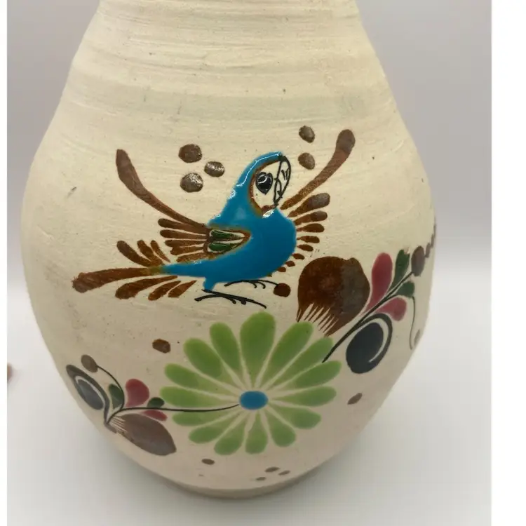 This light colored Mexico vase is a beauty. It has vibrant blue, green, and cranberry colors, among others. It really stands out.