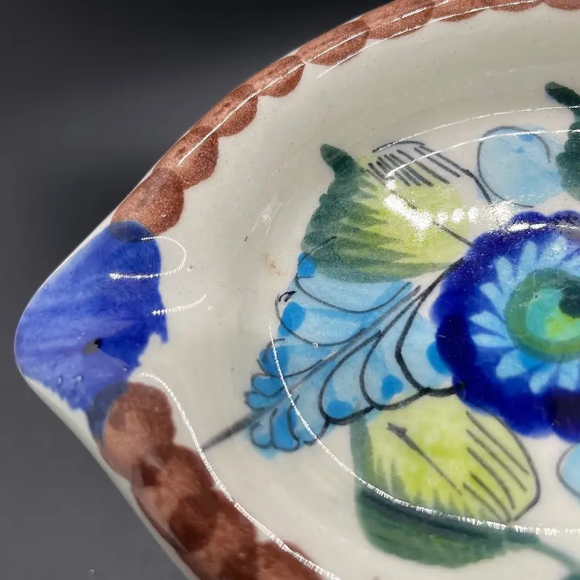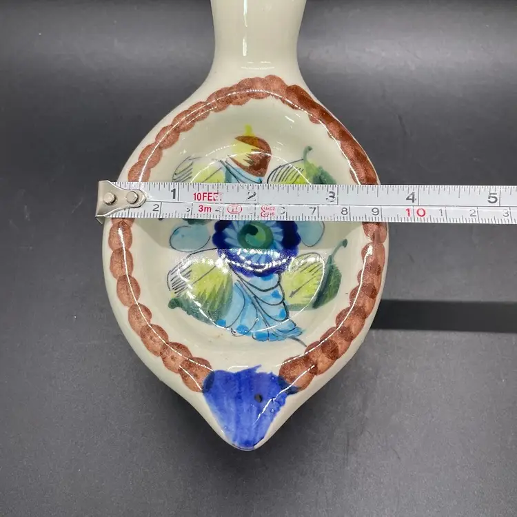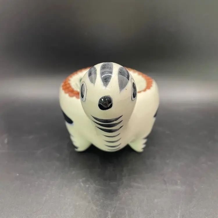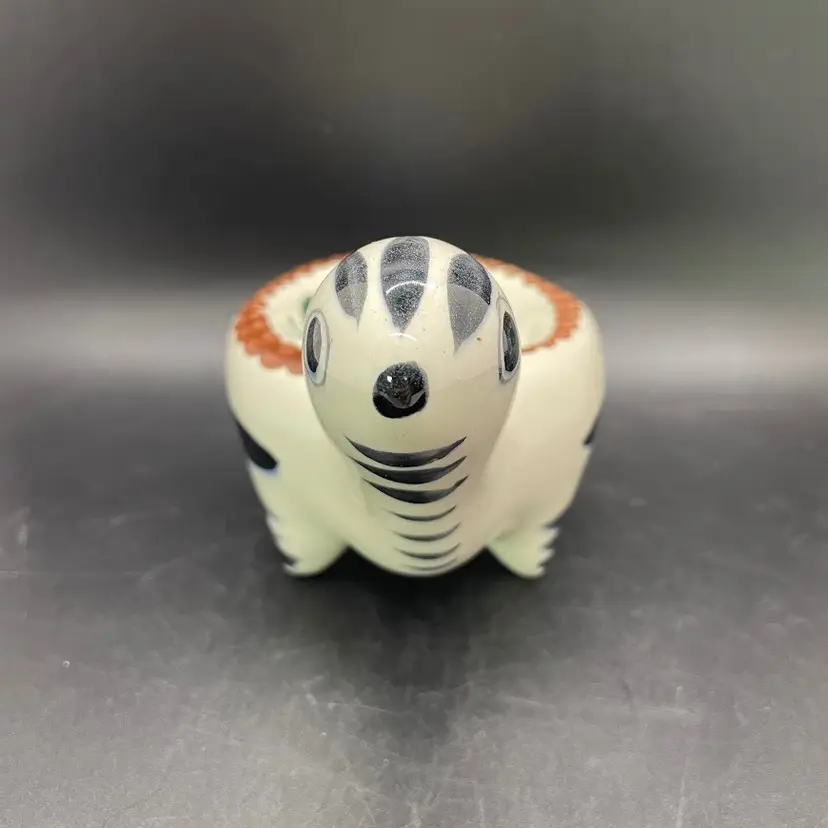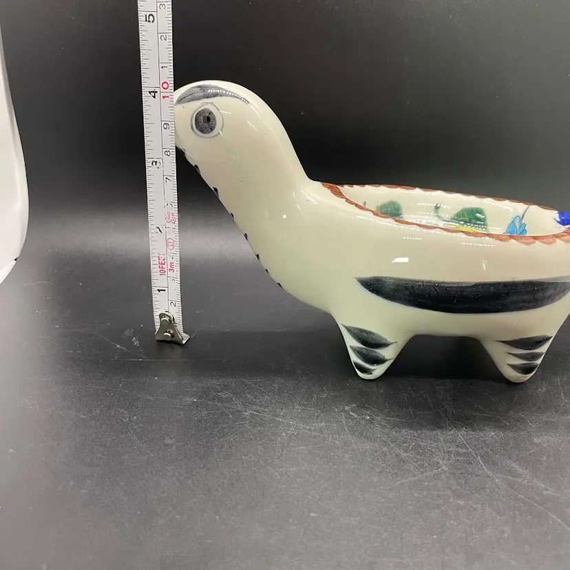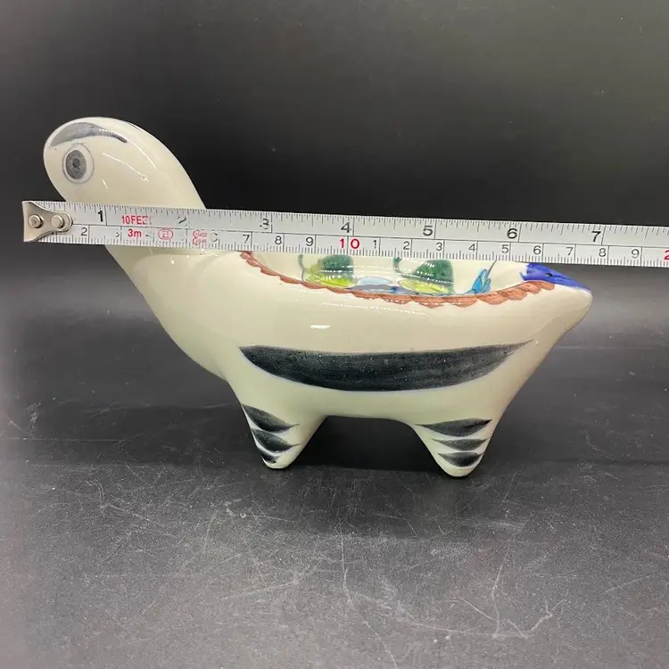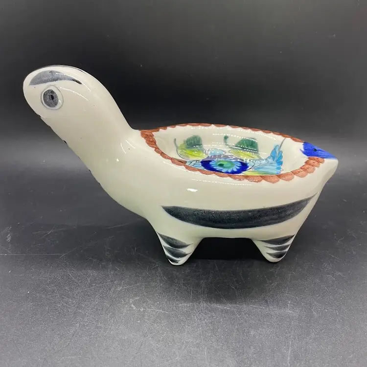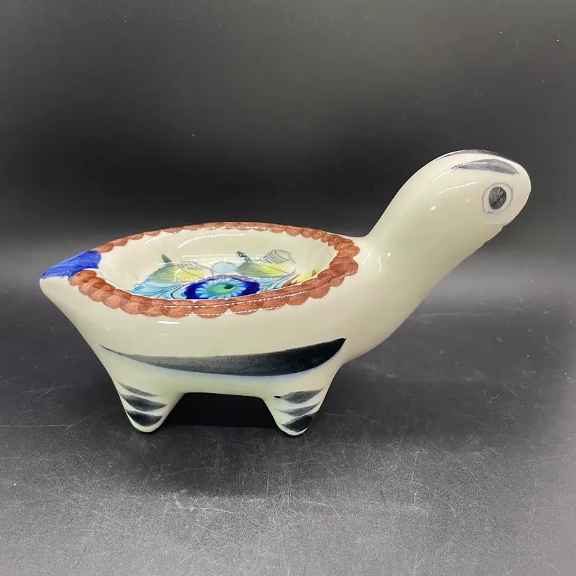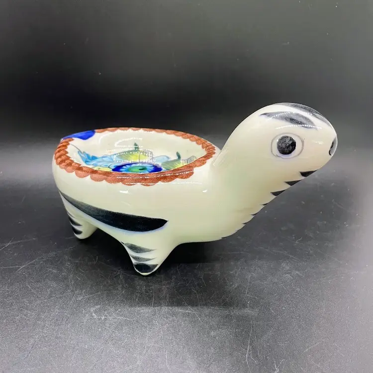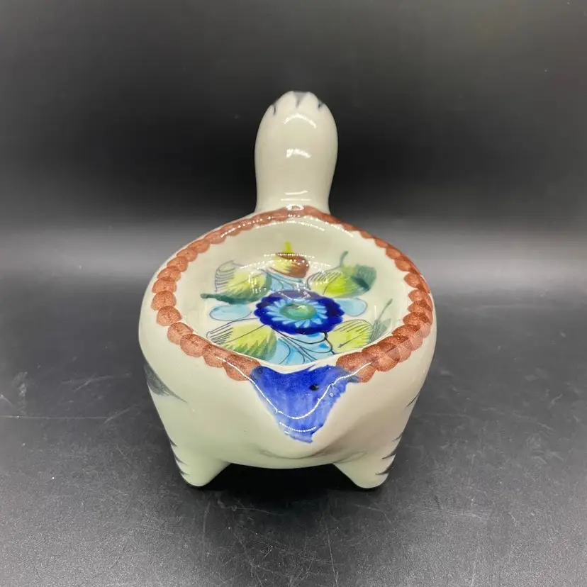 Cute Tonala Mexican Pottery Turtle Shaped Trinket Dish/ Ash Tray/ Sponge Holder/ Catchall Handmade Dish. Signed RS Mexico. No chips or cracks. Signs of light wear and use. Small stain in bowl and spot on face - not sure if these are from manufacturing or not. Light scratching in the bowl.