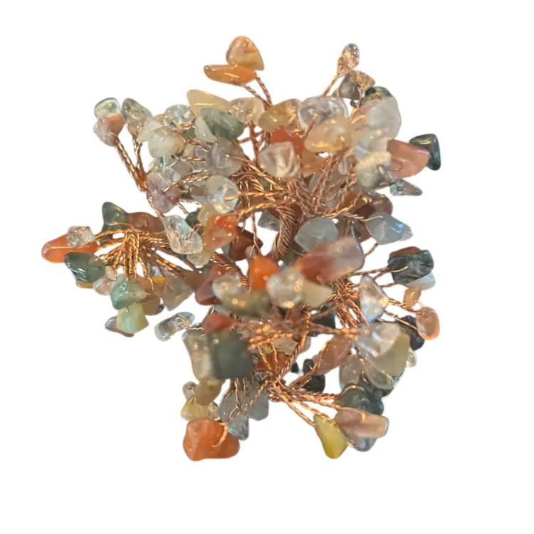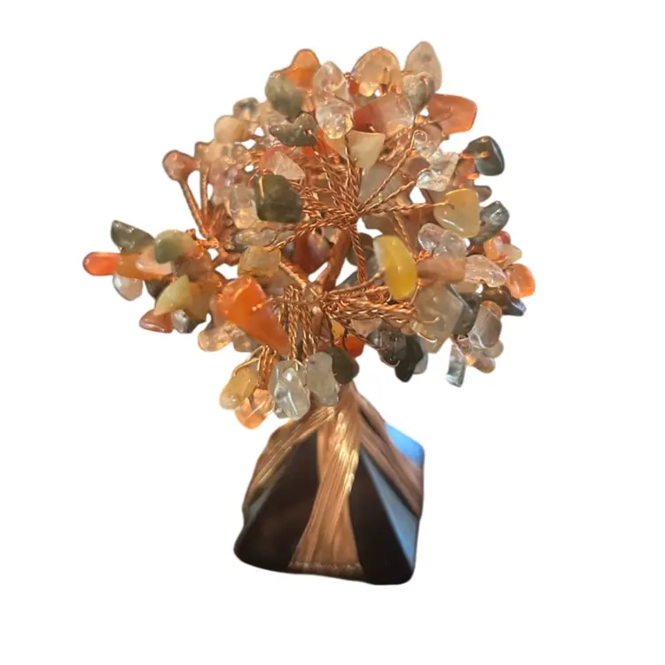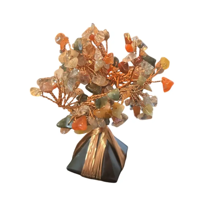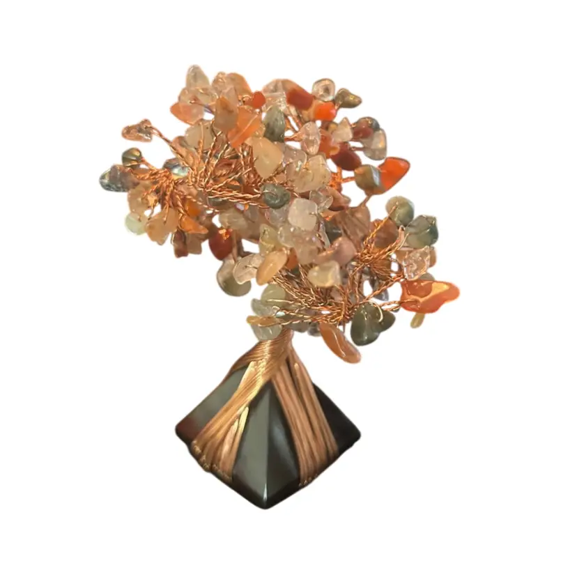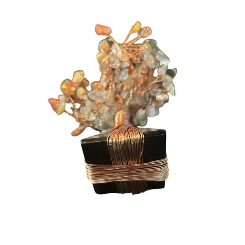 Beautiful various colorful crystal chips as leaves. Trunk and branches are crafted from wrapped copper wire. The base is made of black obsidian in a pyramid shape. It measures approximately 4” tall. (BSA5)