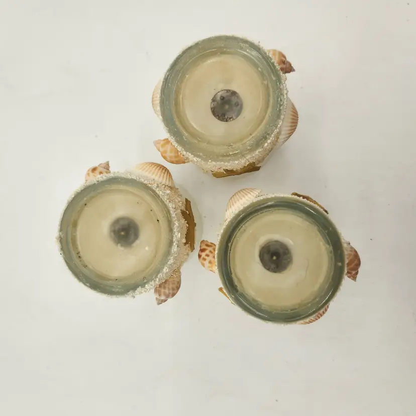These votives decorated with real seashells are perfect for your patio, mantle, bedside - anywhere you want a little bit of the beach by candlelight! Measurements: 2 1/2" tall, 2" in diameter at the rim. Excellent Condition: candles new and unused; one holder has a starfish missing part of an arm (see photo).