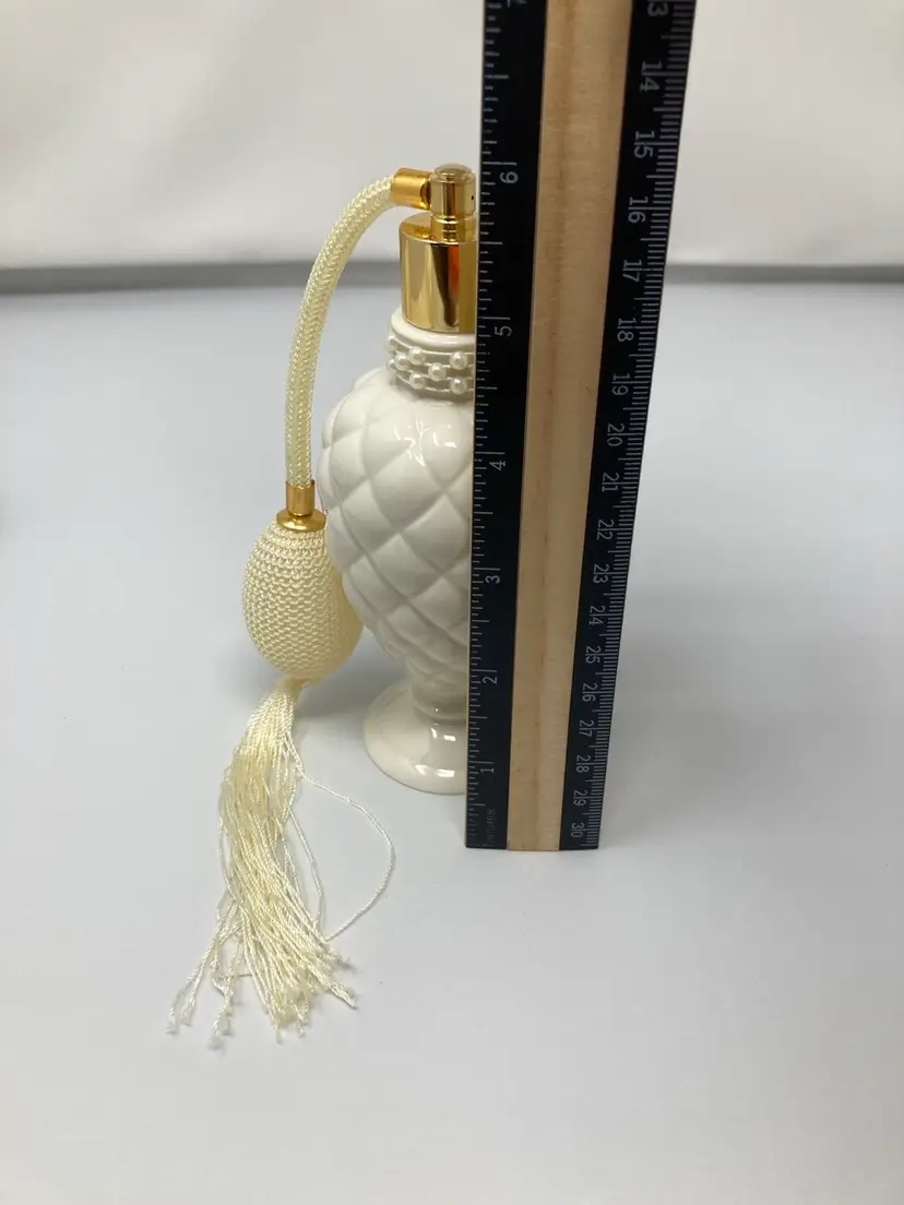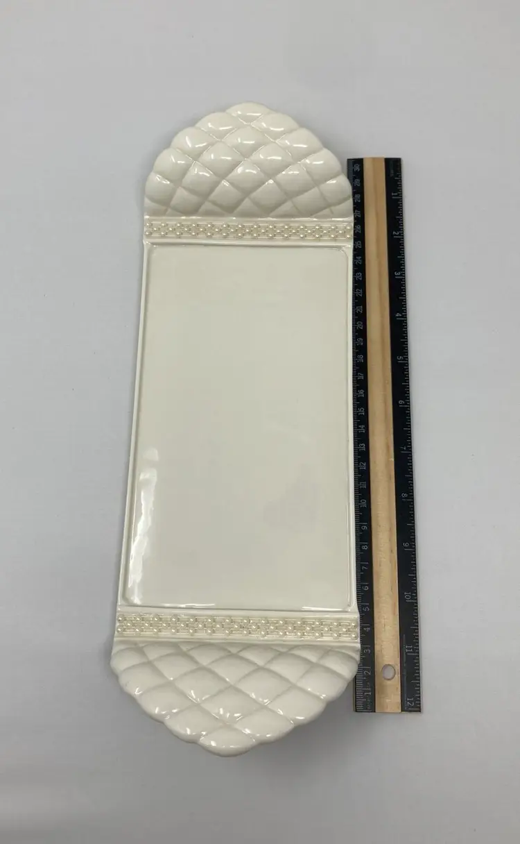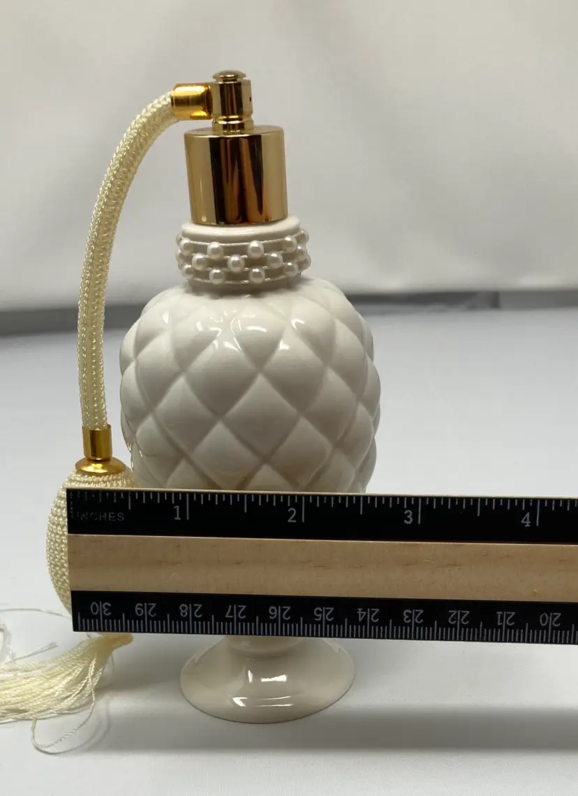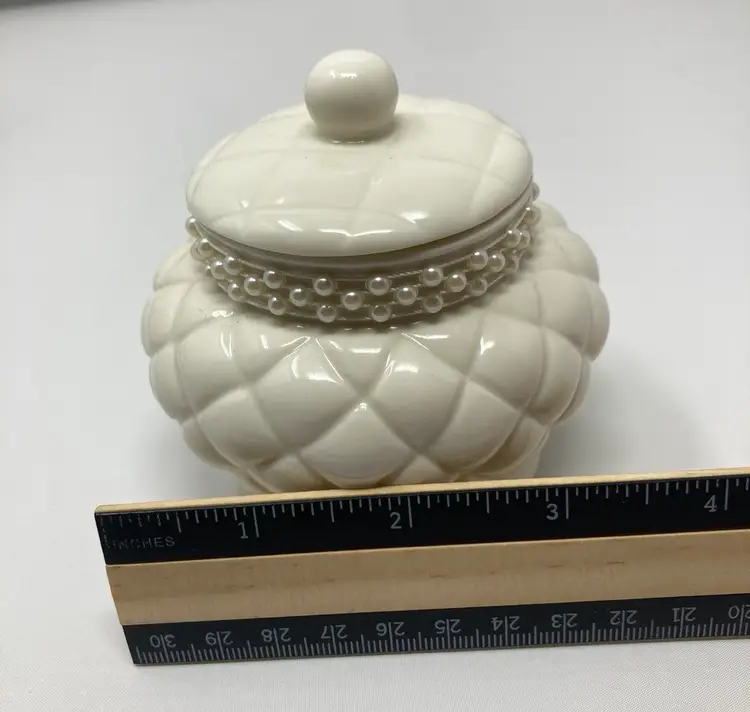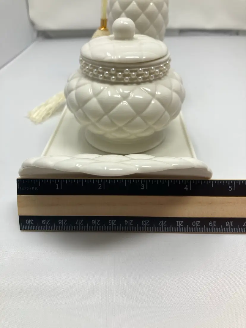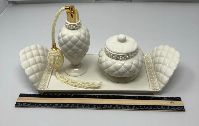Vanity Vignette! Quilted Pattern Vanity Set (Tray 12” Long 4” Wide 2 1/2” Tall Atomizer Perfume Bottle 6” Tall 2 1/2” Wide Powder Box/Trinket Dish 4” Tall 2 1/2” Wide) Miniature Quartz Clock Working (1 3/4” Tall Just Over 1 1/4” Wide) Miriam Haskell Scarf Clip (1” Wide 1 3/4” Tall Needs Work) Vintage Milk Glass Screwback Earrings (1” Diameter)