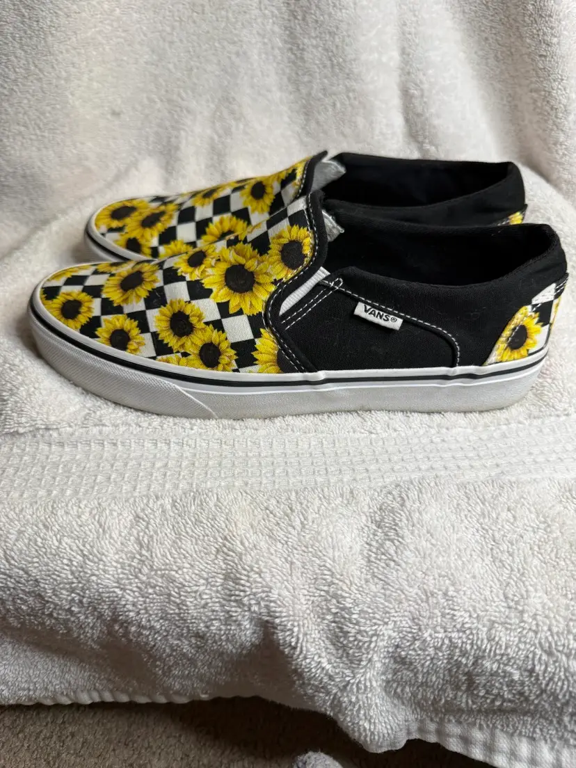 New women’s Vans checkered slip one with sunflowers. New without tags. Women’s size 8.5
