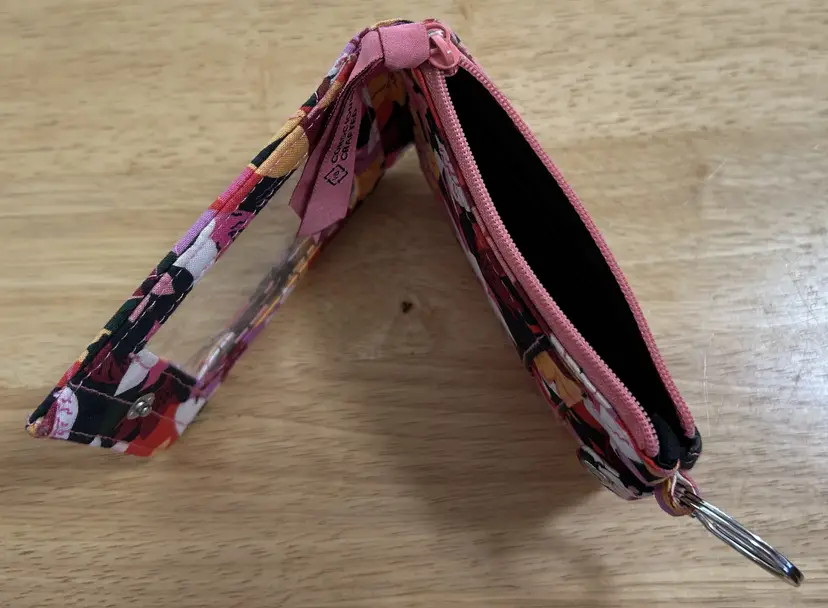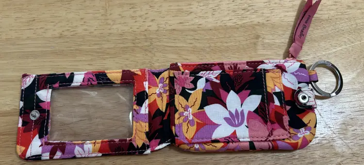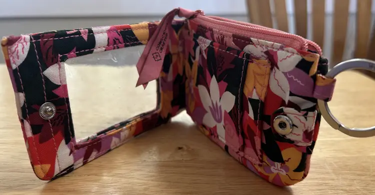 Vera Bradley Zip ID Case in a floral pattern. Made of cotton material, this wallet features a snap closure and an RFID key ring for added security. Multicolor floral design Zipper section. Snap Closure holds credit cards.