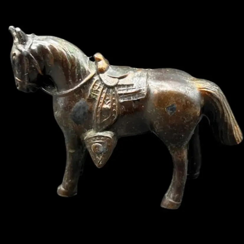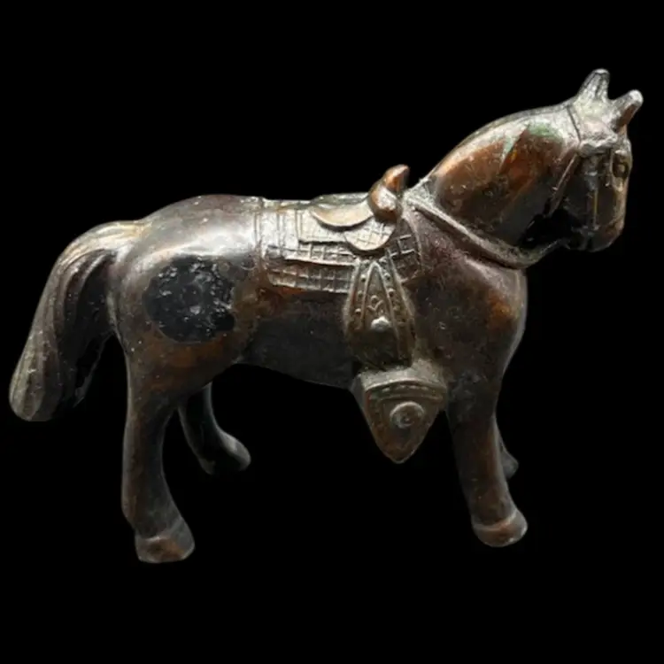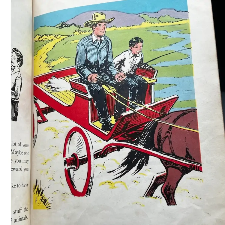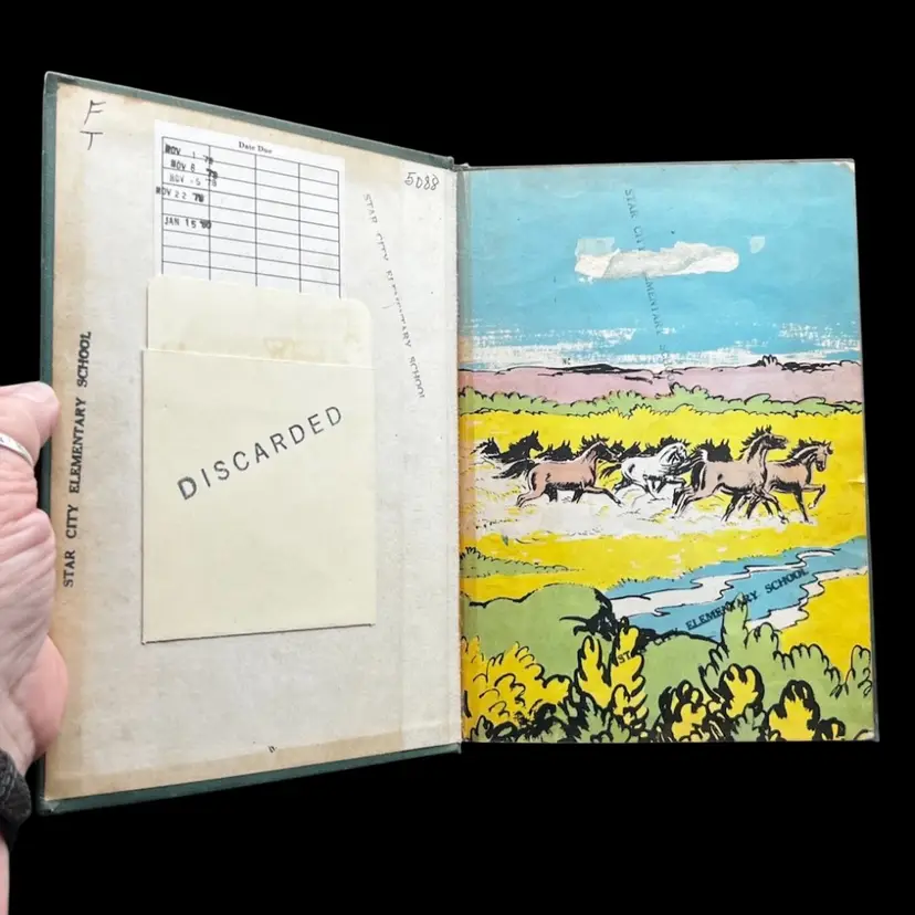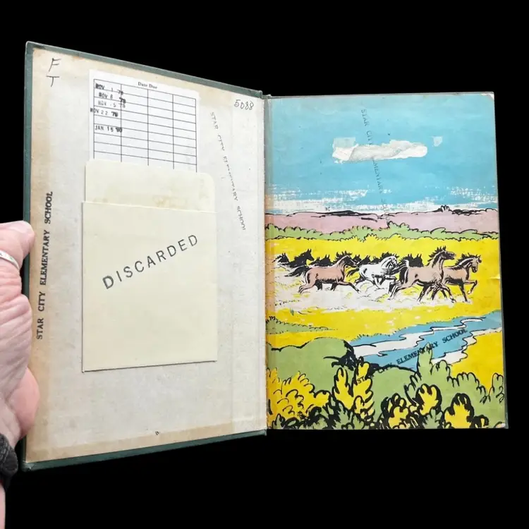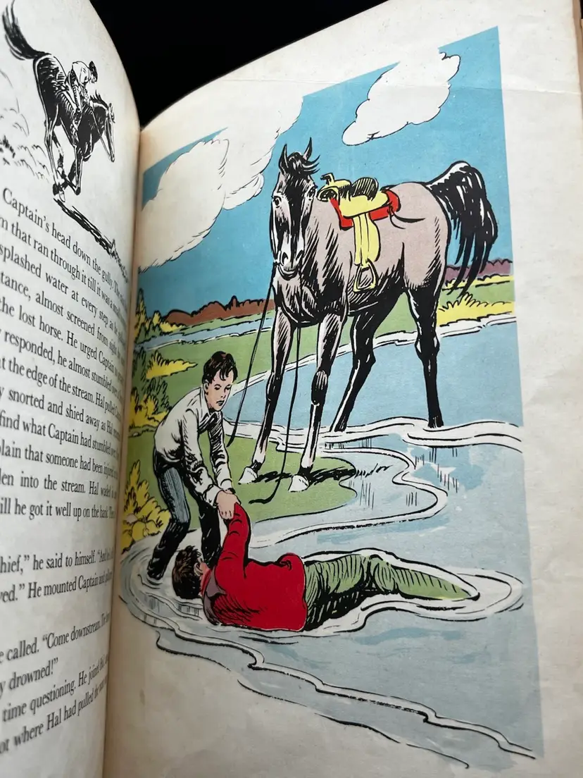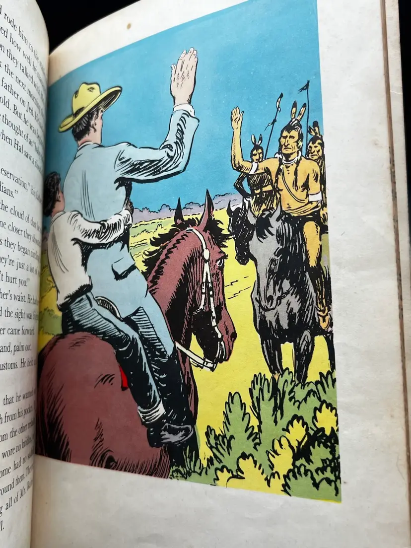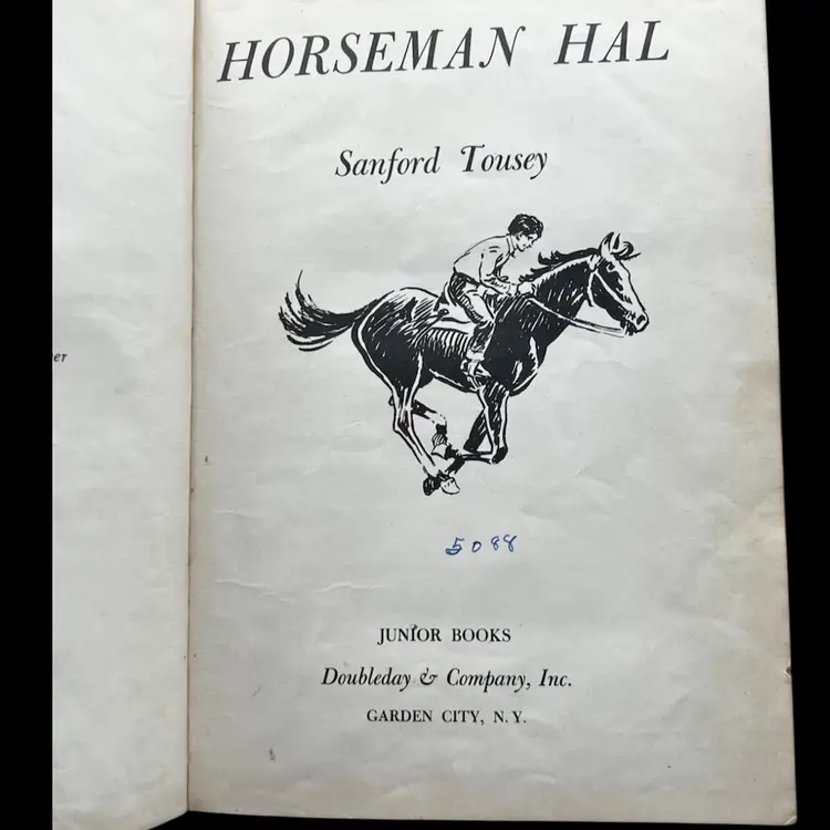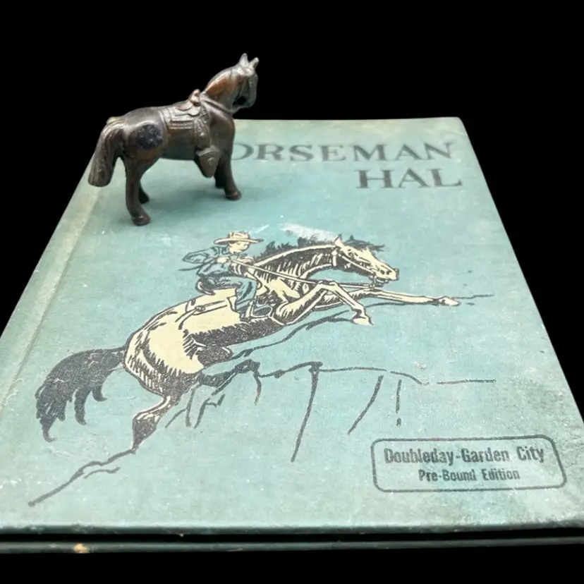 Vintage Copy Of Horseman Hal Written And Illustrated By Sanford Tousey Along With A Bronze Miniature Horse/Pony With Saddle Figurine Marked Made In Japan. The Book Shows To Be A Pre-Bound Edition, Hardcover Doubleday Publishing Copyright 1950 Some Pages Have Writing Or School Stamps As It Was A Discarded Library Book Last Checked Out In 1980 Illustrations Are Bright And Colorful.
