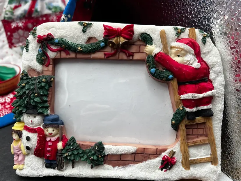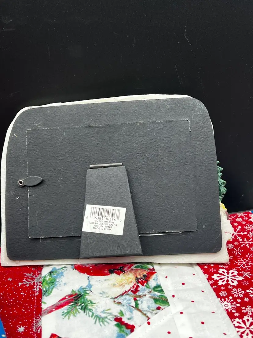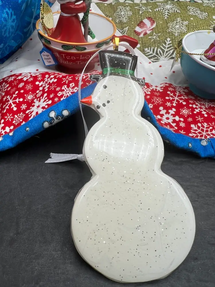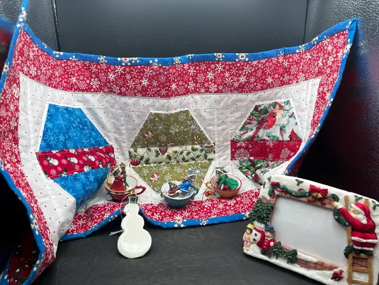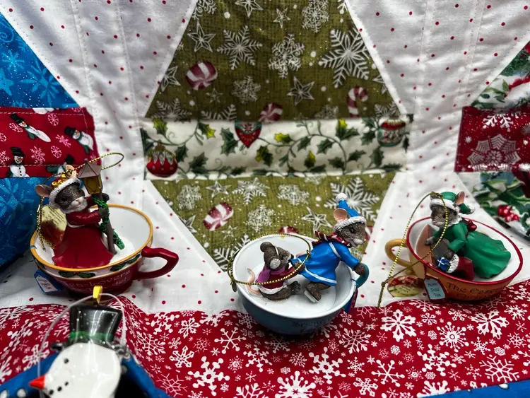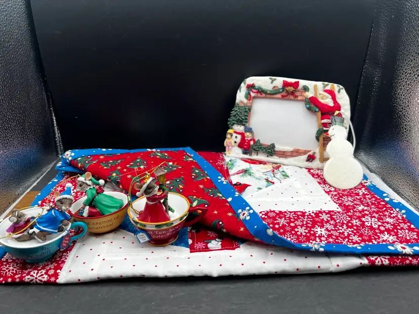 Vignette #10 Includes A Set Of 3 Vintage Bradford Exchange Charming Tails Ornaments. Anthropomorphic Mice In Teacups The Essence Of Christmas By Dean Griff, A Winter Theme Picture Frame For A 3”x5” Photo, A Handmade Winter Theme Quilted Table Runner 16 1/2” X 33” Double Sided, And A Made By Me Acrylic Pour Painted Wooden Snowman Ornament Sealed With Resin.