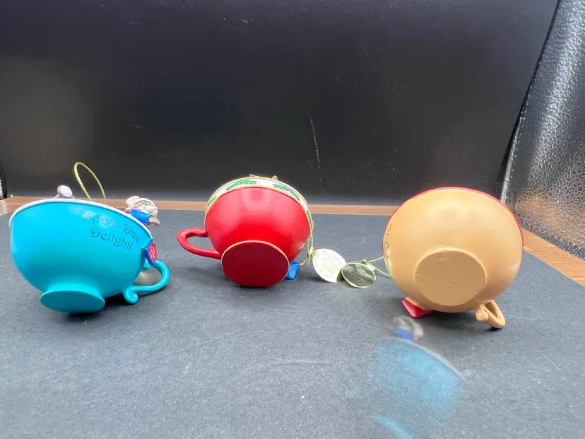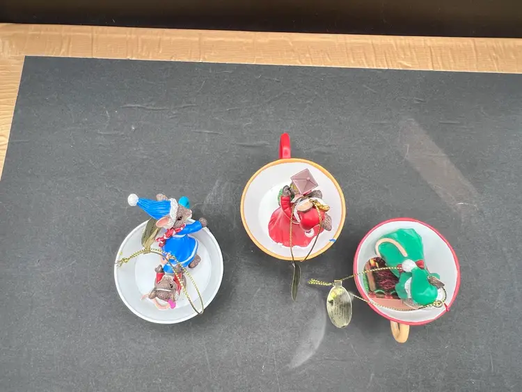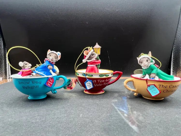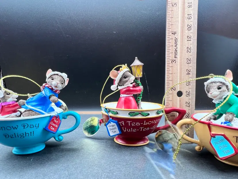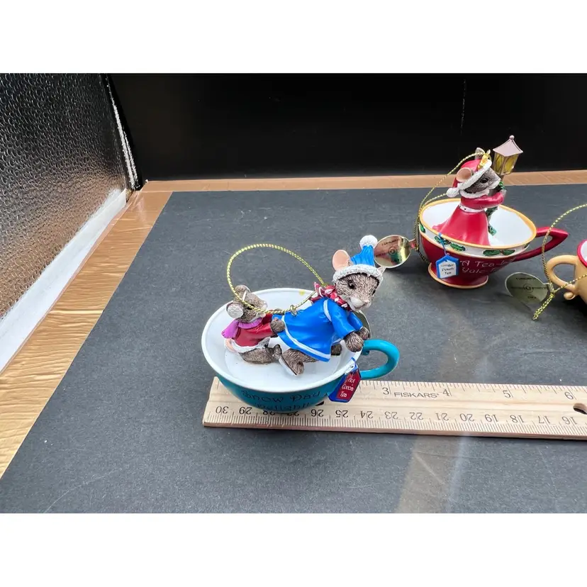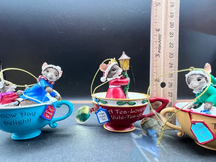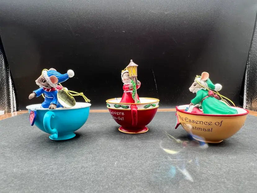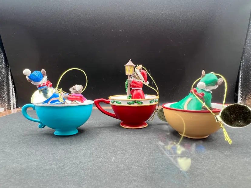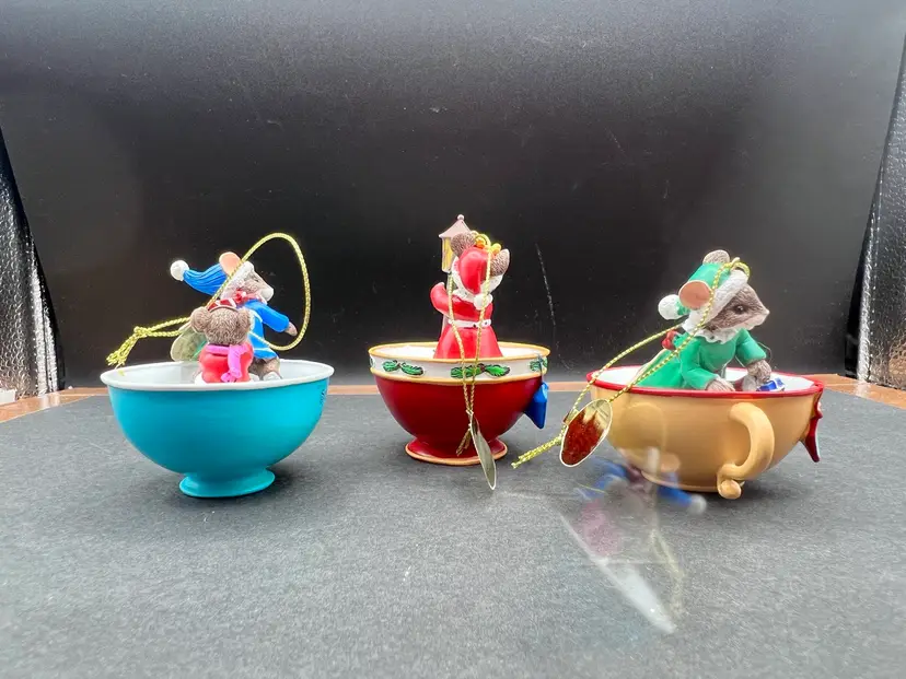 Mice ornaments are Just under 3” tall x 3 1/4” wide Made by ENESCO In good vintage condition, no chips, cracks or crazing.