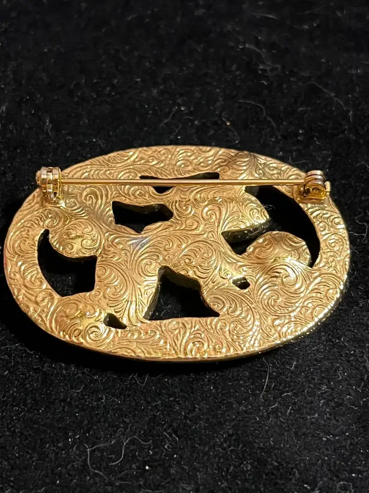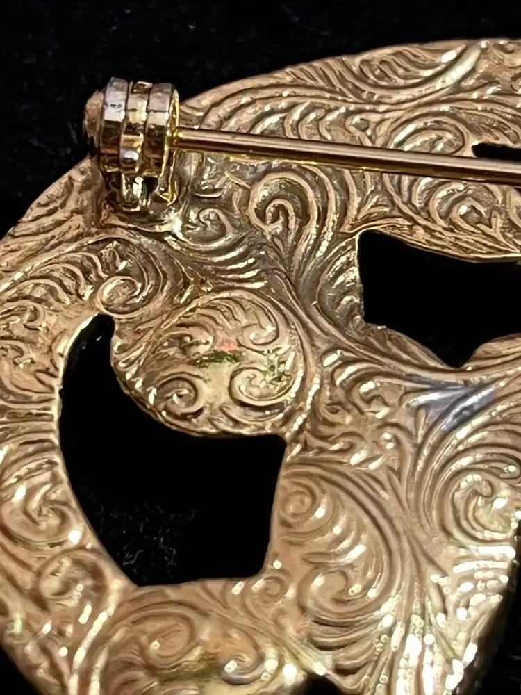 Step back into the 1960s with this gorgeous, substantial costume brooch. This isn't a modern replica—it features the weight and craftsmanship typical of mid-century estate jewelry. The piece showcases a beautiful mix of milk-white and toasted-caramel marquise cabochons, likely high-quality thermoset plastic or Lucite, which give off a soft, waxy glow. The gold-tone setting is incredibly detailed with a "granulated" texture on the front and a classic Florentine scroll finish on the back. The Details: • Era: 1960s / 1970s • Style: Mid-Century Modern / Classic Elegance • Construction: Features a secure safety C-clasp and a beautifully textured back (a sign of true vintage quality). • Condition: Excellent vintage condition with a tiny bit of natural patina (verdigris) in the crevices, adding to its authentic character. • Versatility: Perfect for a blazer lapel, cinching a scarf, or adding a touch of "Grandma Core" chic to a denim jacket.