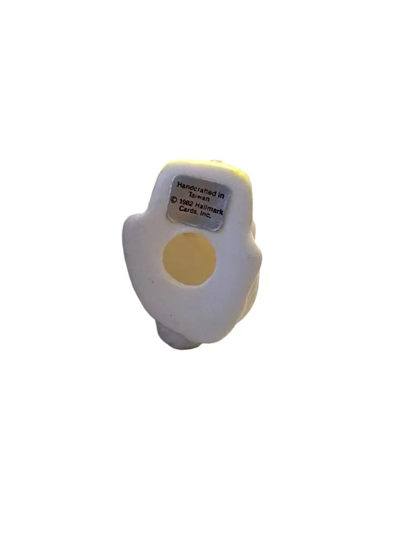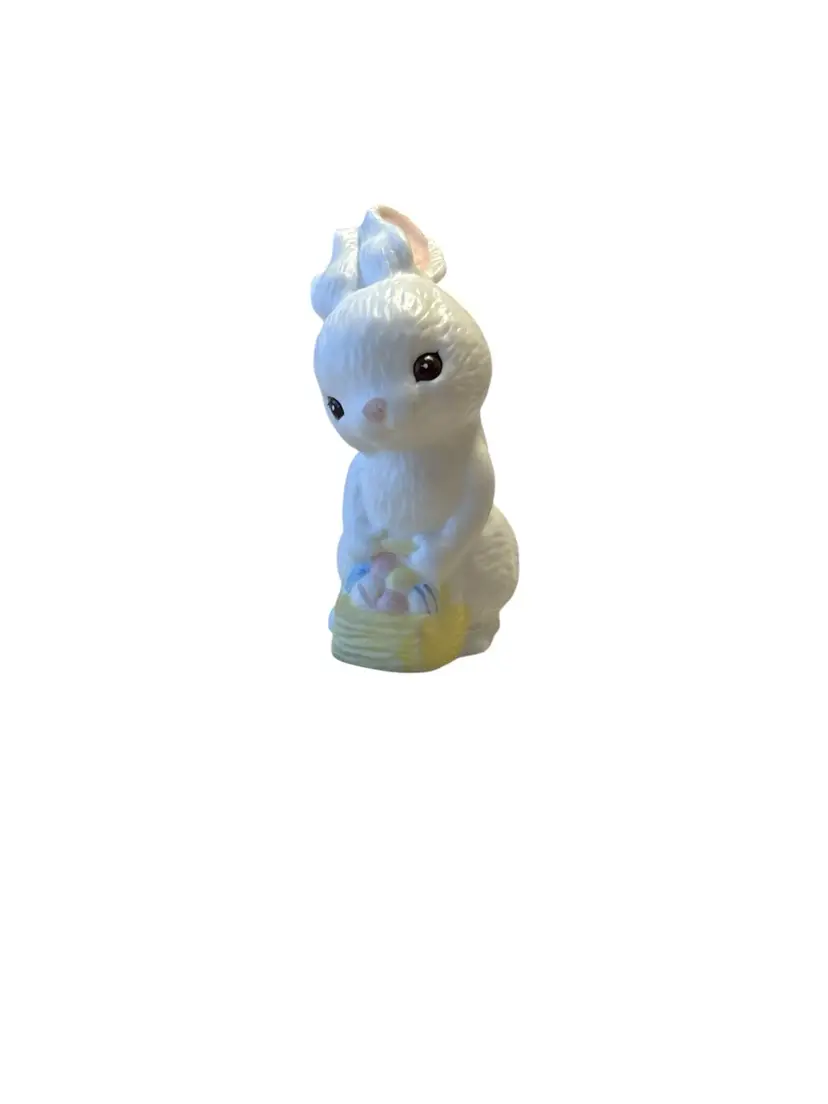 The figurine is white with a textured surface designed to resemble fur. It depicts a bunny holding a small yellow basket filled with colorful eggs. The piece is made of ceramic with a matte finish and measures approximately 2.25 inches tall. It was handcrafted in Taiwan for Hallmark.