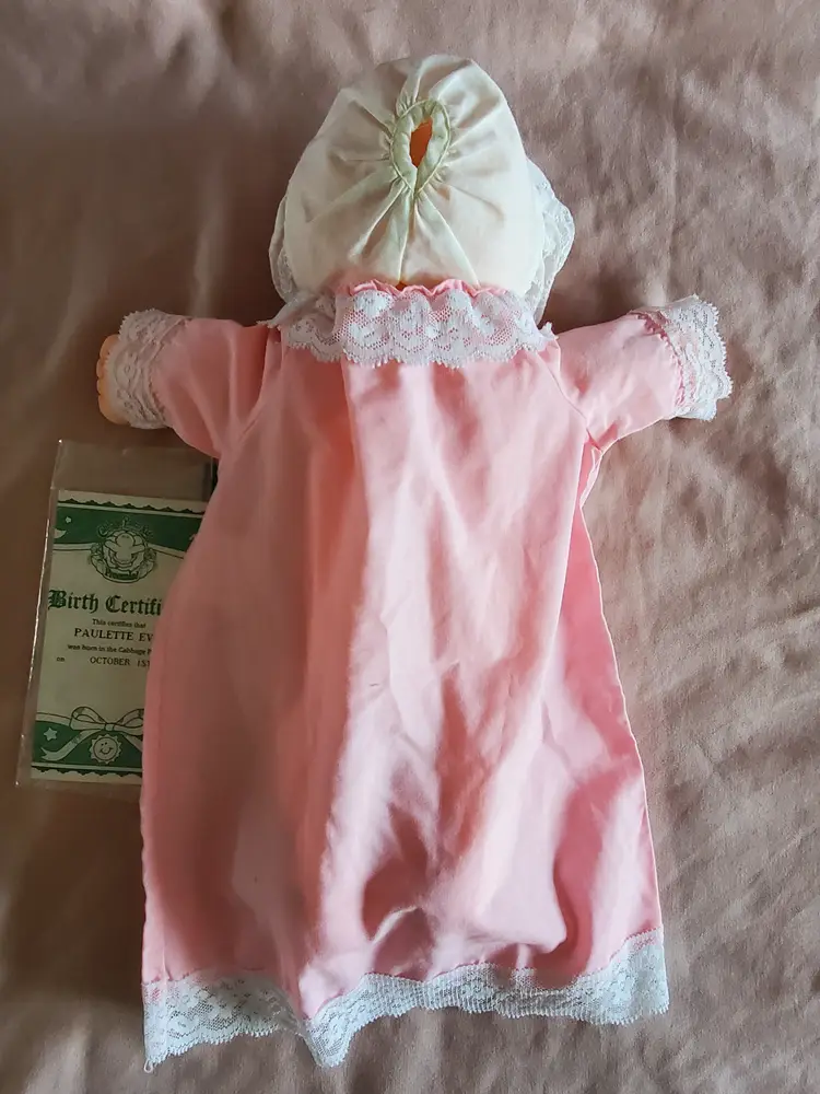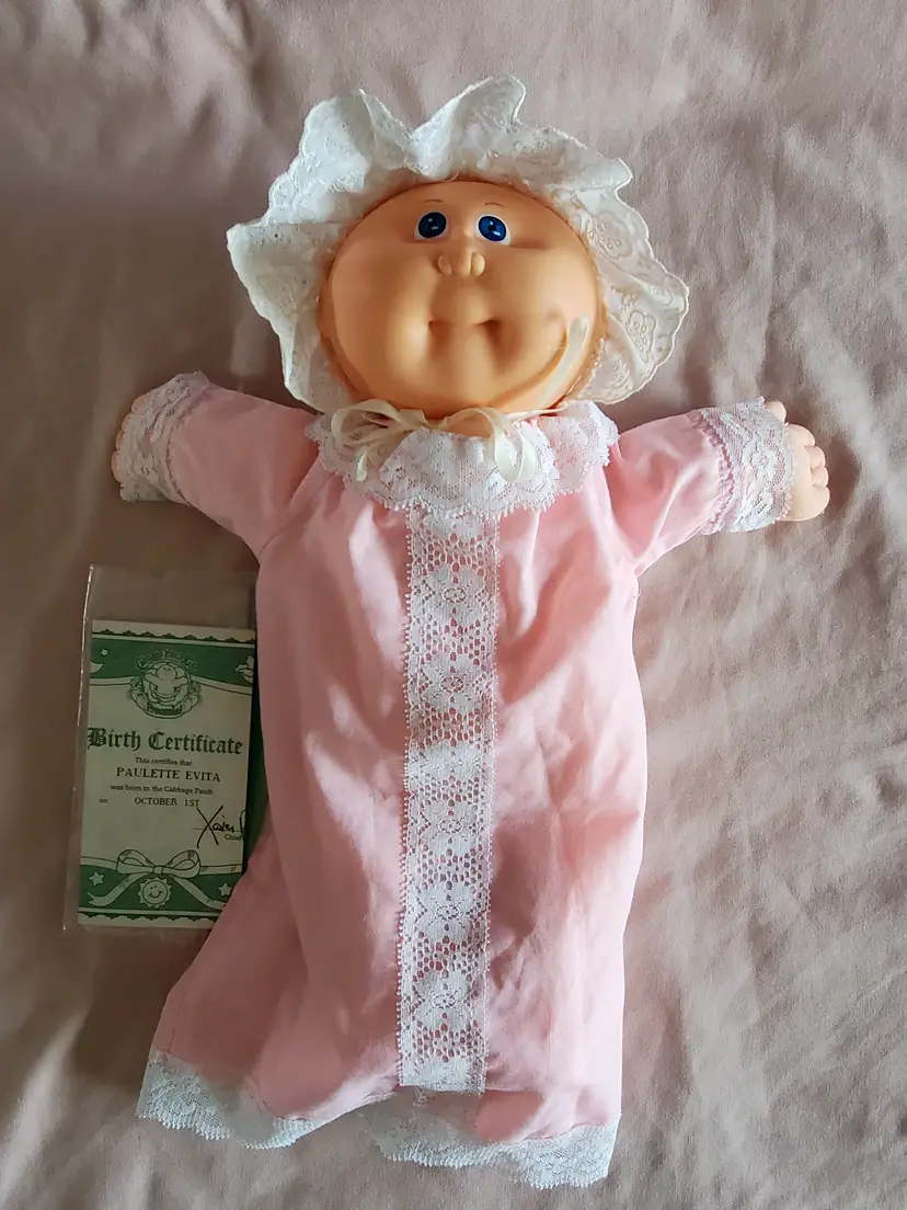 1985 Cabbage Patch Kids Preemie Paulette Evita has blue eyes and comes with her Birth Certificate (HM 1) in GUC (Her body tag is faded). She would be a great addition to your collection!