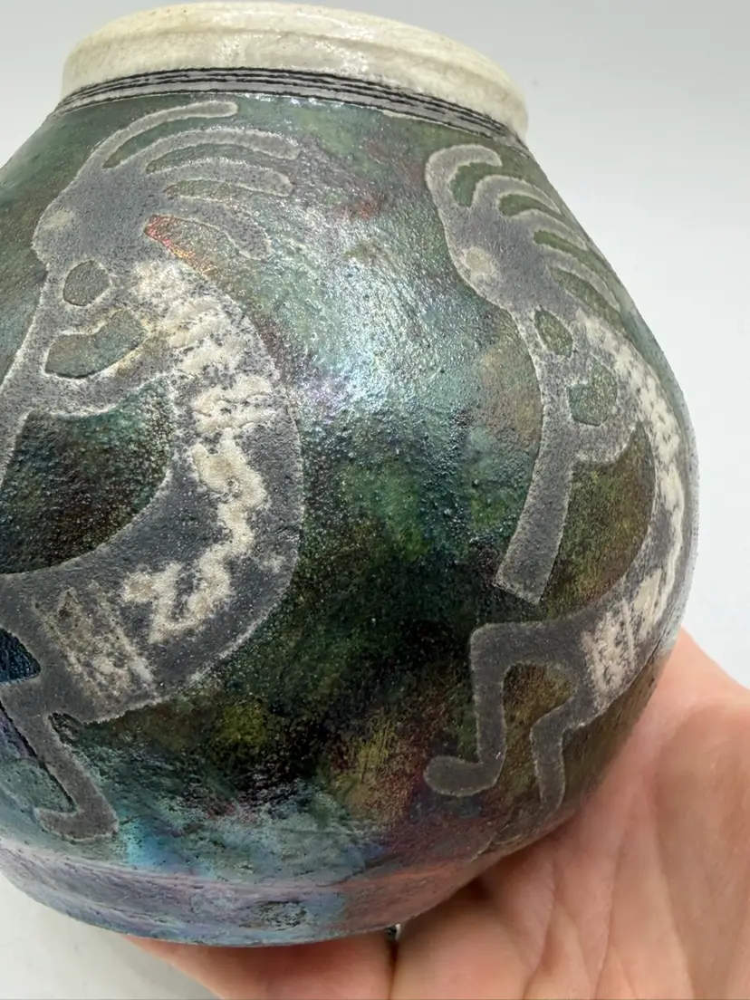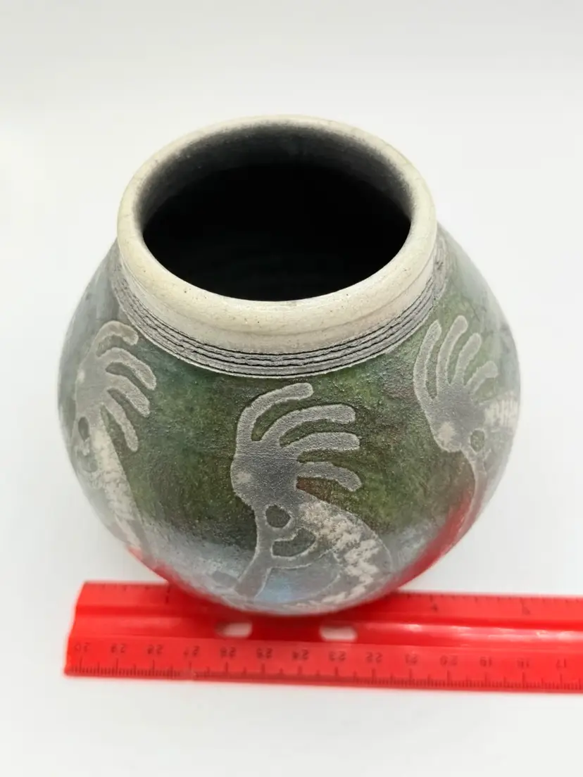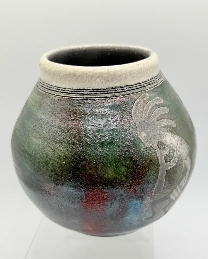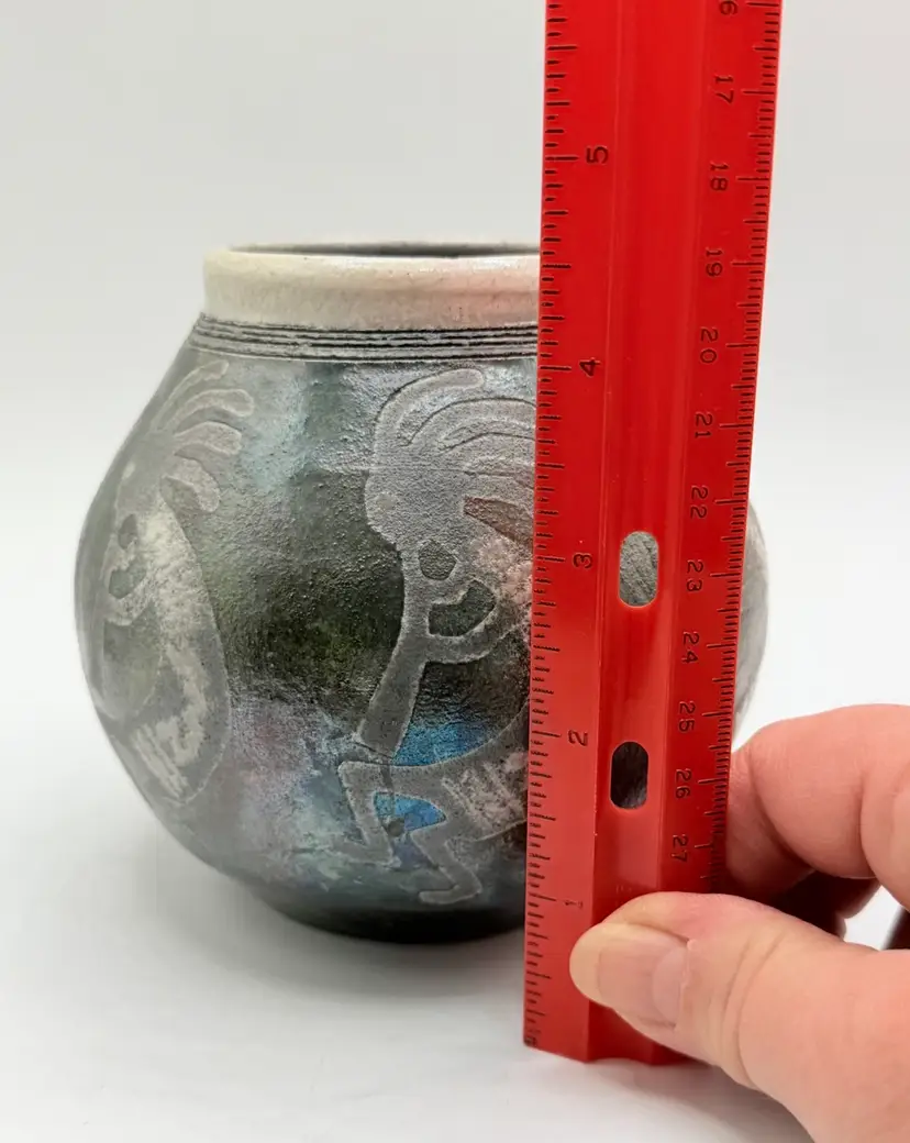 The 2004 Ben Diller Raku Pottery Kokopelli Trio Southwest Signed Vase is a handmade Native American inspired pottery piece with an iridescent finish. This unique vase features a Kokopelli design, a traditional symbol in Native American culture. The Southwestern style and tribal affiliation of Raku add a touch of authenticity and artistry to this collectible item. Signed by the artist, this vase is a special addition to any collection of Native American pottery.