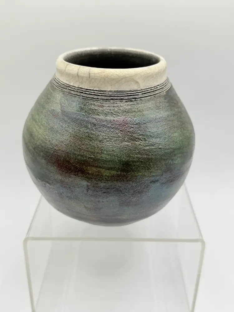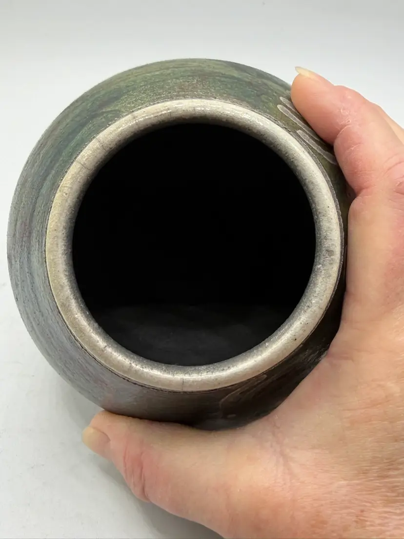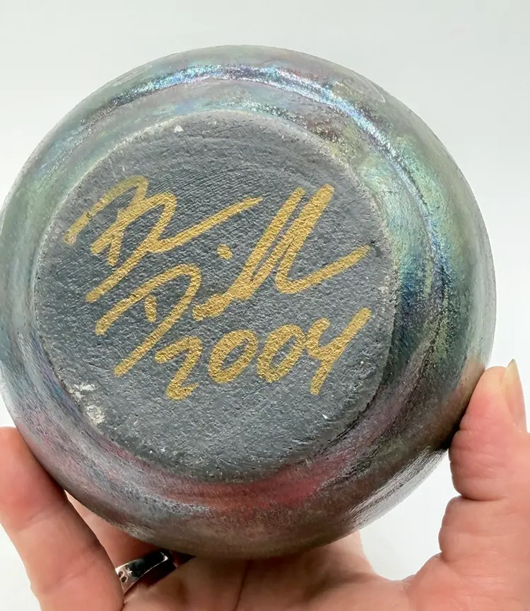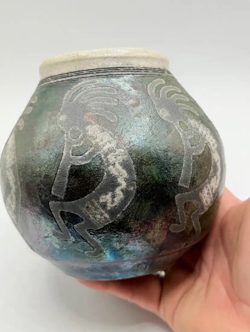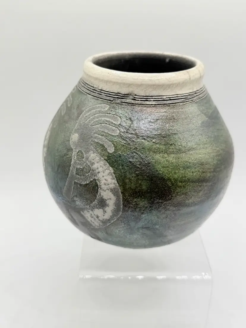 The 2004 Ben Diller Raku Pottery Kokopelli Trio Southwest Signed Vase is a handmade Native American inspired pottery piece with an iridescent finish. This unique vase features a Kokopelli design, a traditional symbol in Native American culture. The Southwestern style and tribal affiliation of Raku add a touch of authenticity and artistry to this collectible item. Signed by the artist, this vase is a special addition to any collection of Native American pottery.