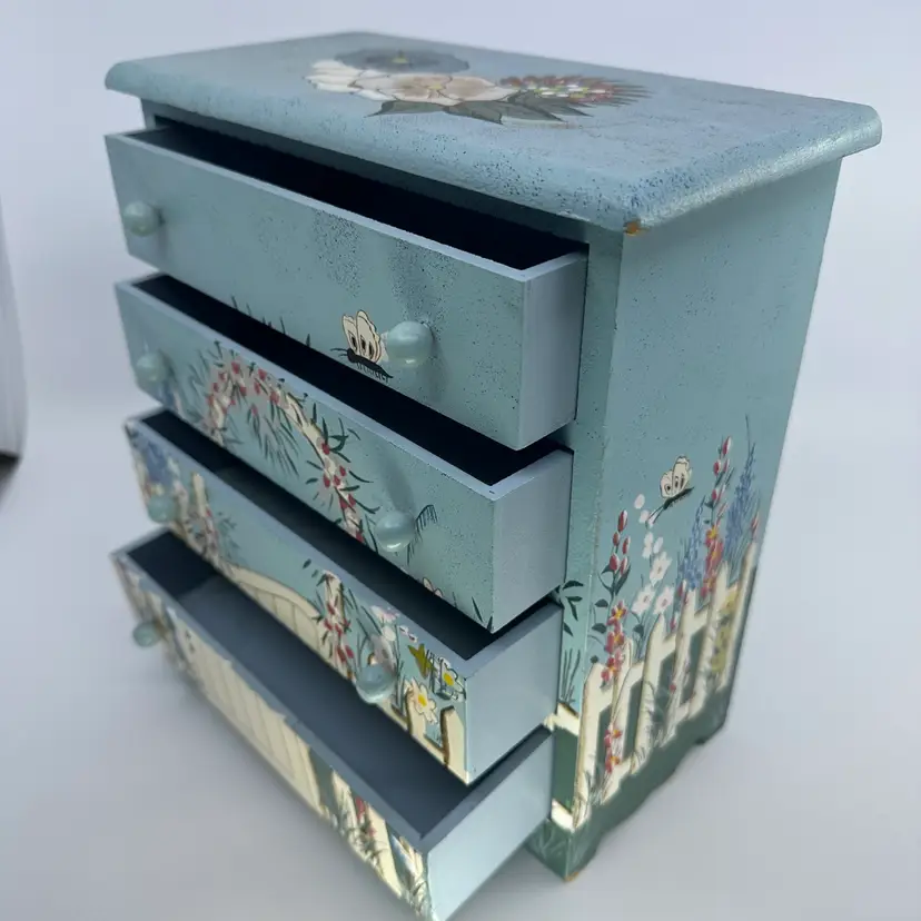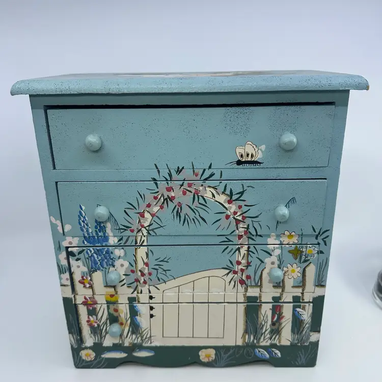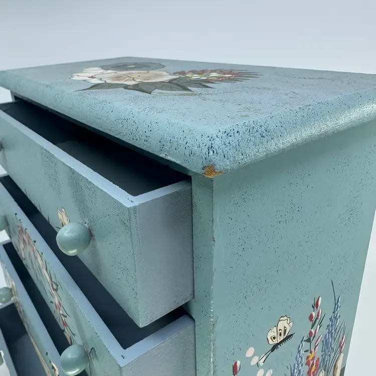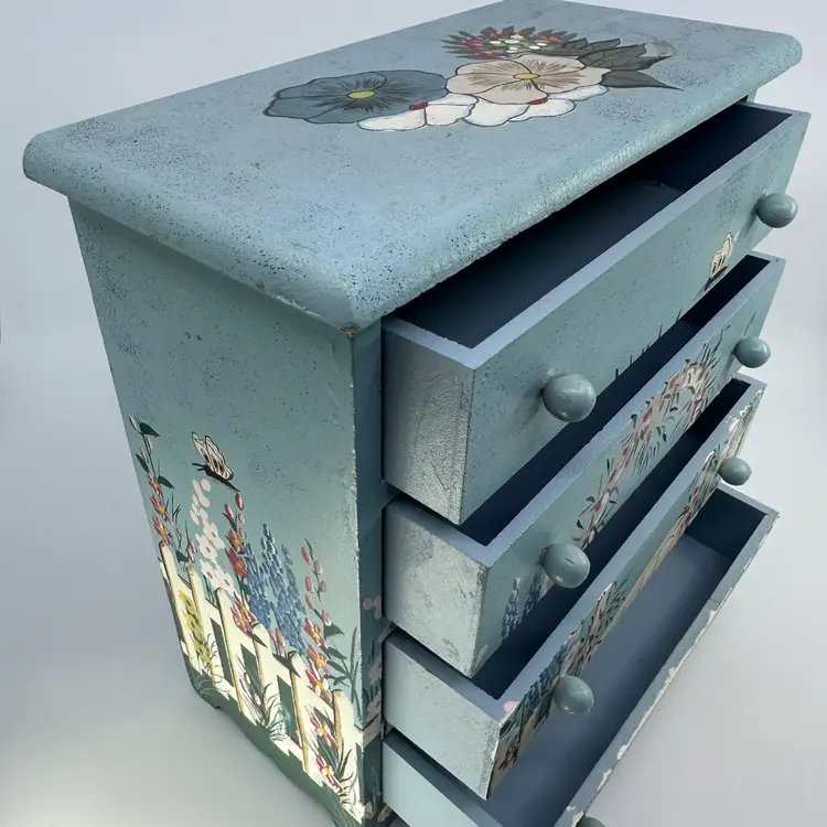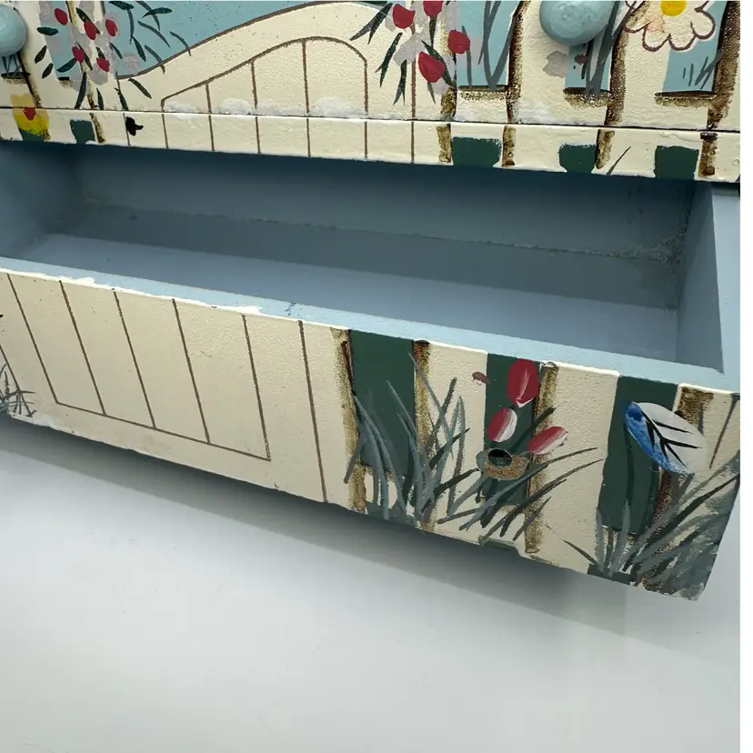 Approx 10.5” tall x 10” across x 4.5” deep. Has a little wear to the corner and the bottom drawer is missing a handle. ( see last 3 pics)