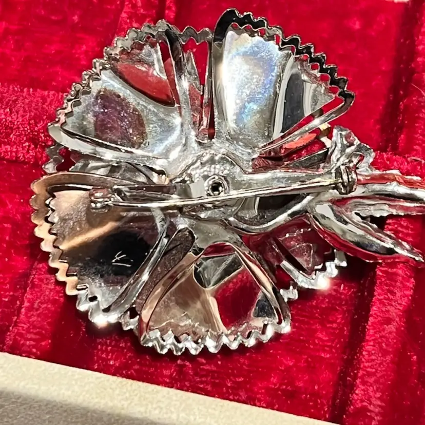 Vintage 60s/70s silver-tone metal 3D flower brooch with an aurora borealis rhinestone center