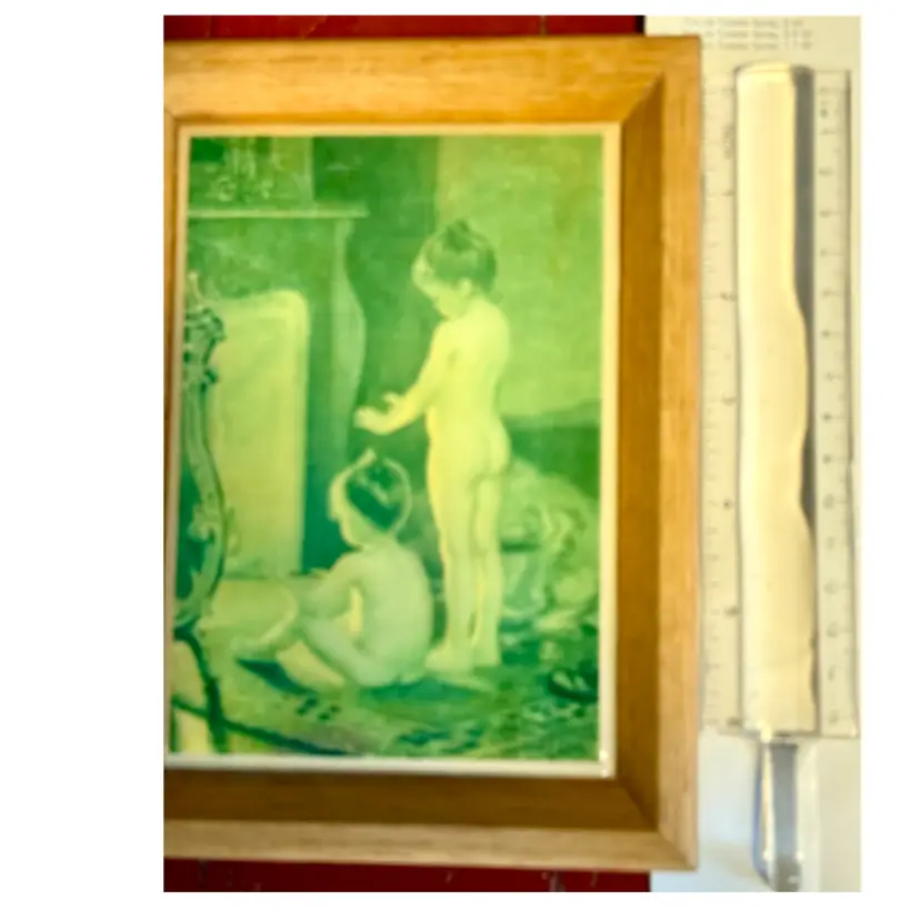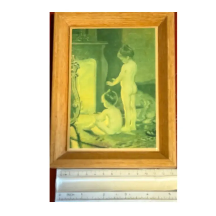 This is a vintage framed ceramic tile print of the famous 1890 painting After the Bath by Canadian artist Paul Peel. The original oil painting depicts two young children warming themselves by a fire. The printed tile is housed in an oak wood frame The manufacturer is Kimberly Enterprises.