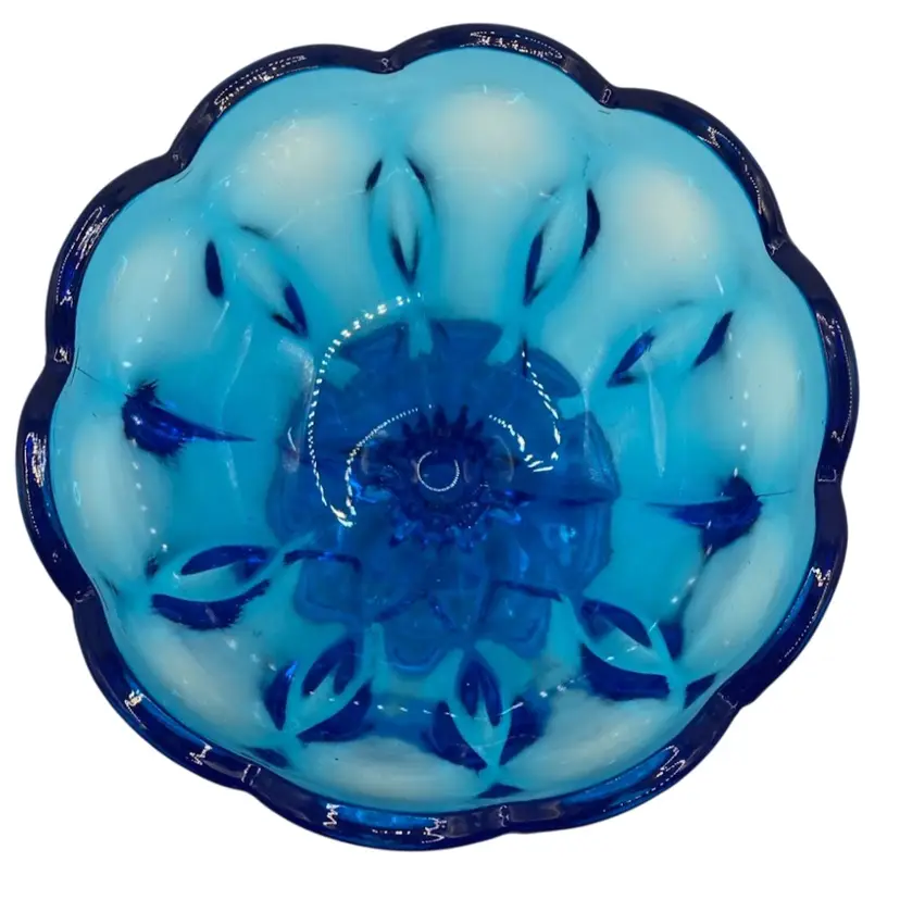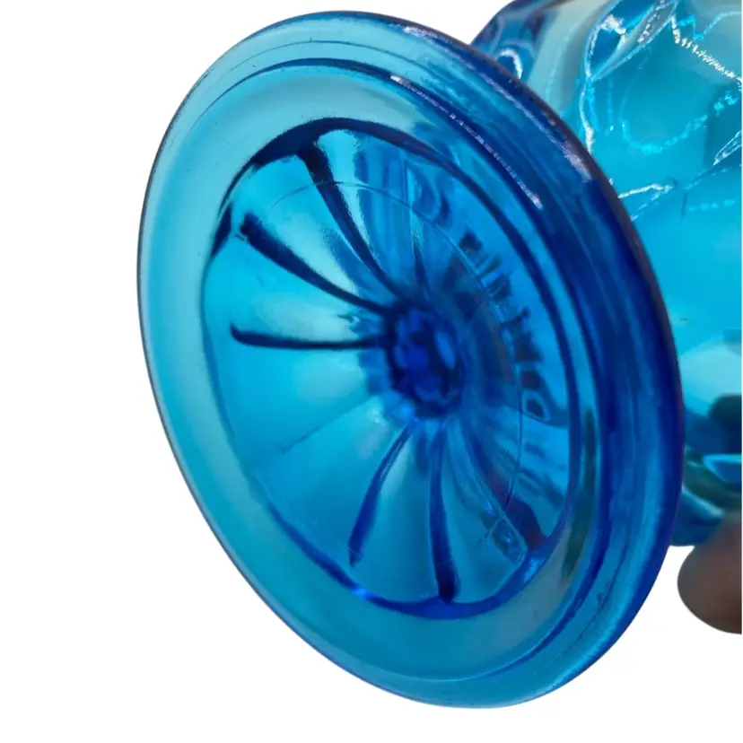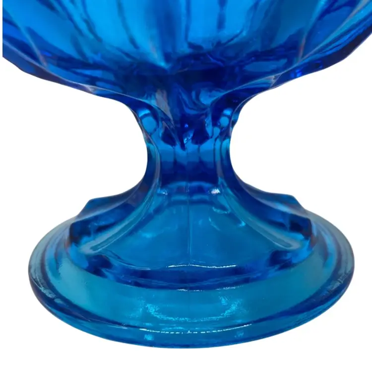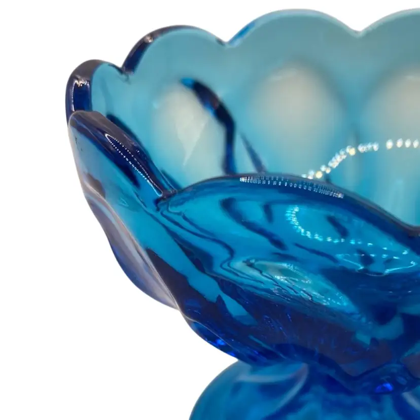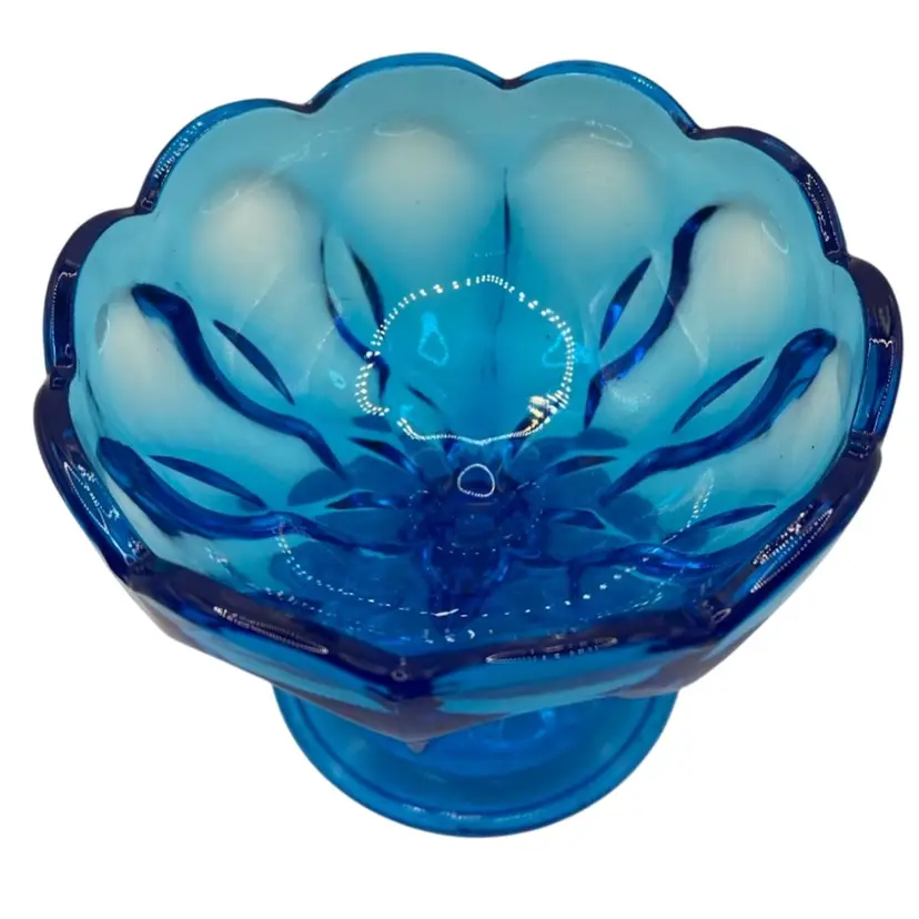 Add a pop of color to your collection with this vintage Anchor Hocking compote/dessert dish. Measuring 4.5 inches in diameter and 4 inches in height, this round dish is made of pressed glass and features a large thumbprint design on the sides and a scalloped rim. The laser blue color and glossy finish make it a standout piece. The Fairfield compote is a late 20th century original, manufactured in the United States. It is in excellent condition and would make a great addition to any collection. Use it to serve desserts or as a decorative piece.