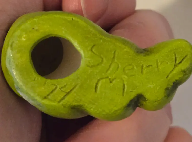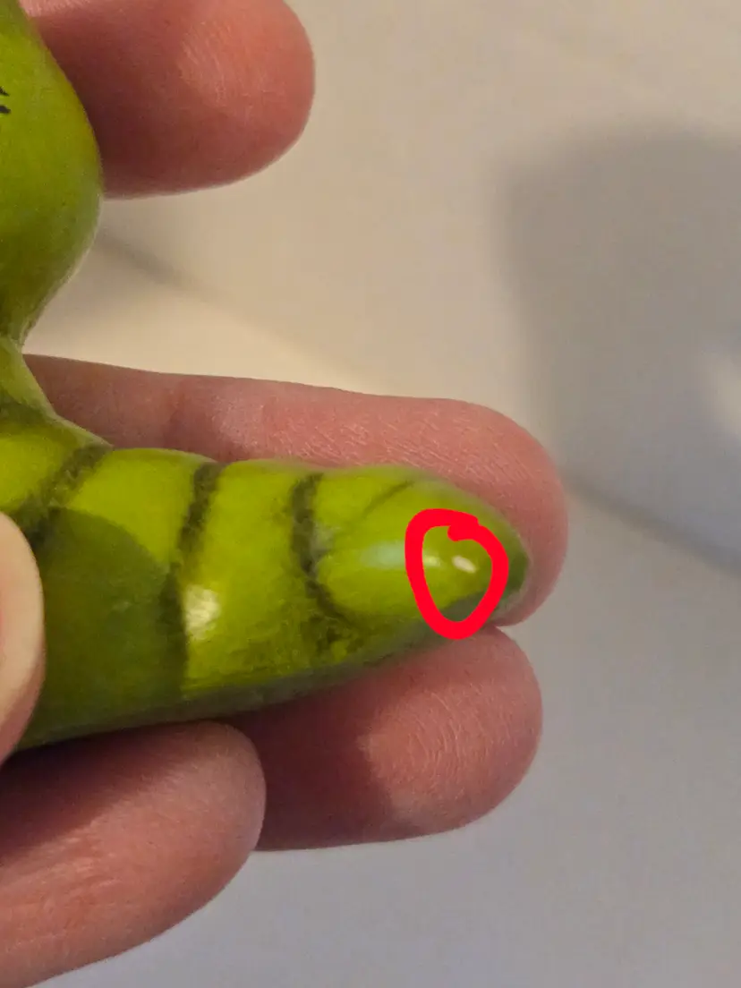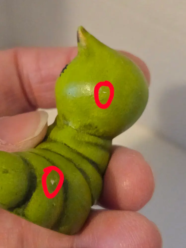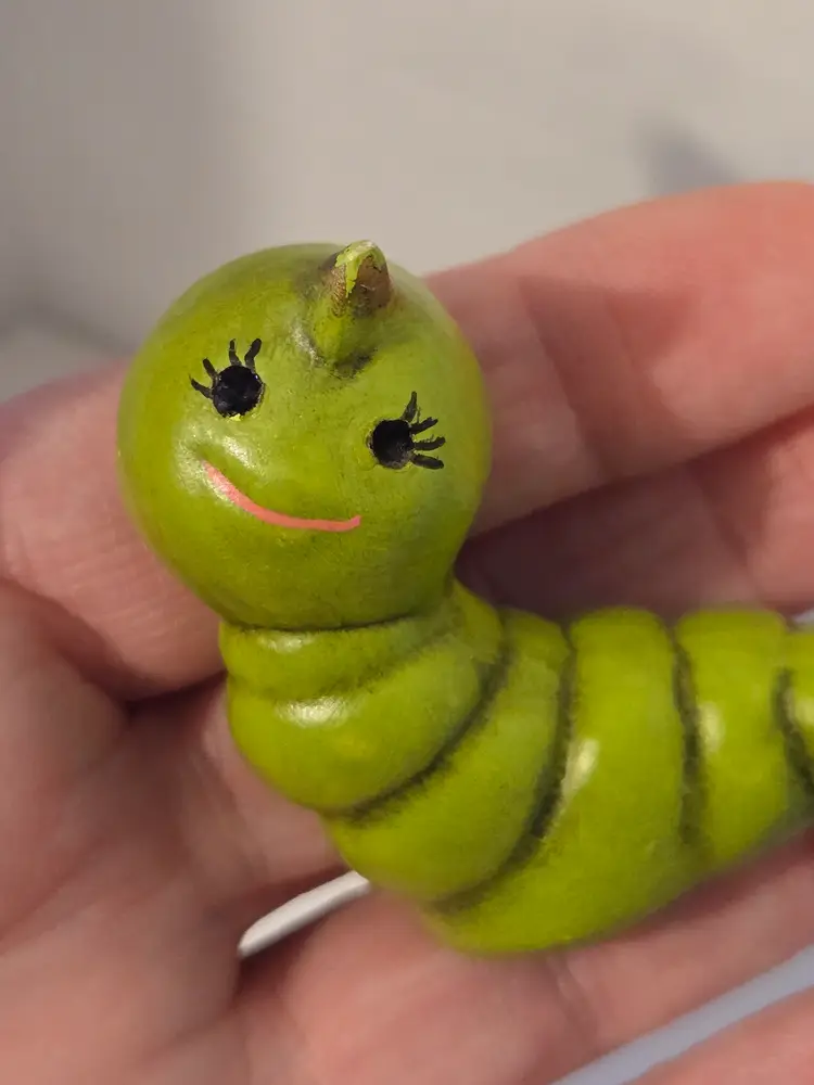 This charming little critter measures approximately 1.8×1.8×1 inch. It is signed Sherry M '74 on the bottom. There are a few small glaze chips, please see photos.