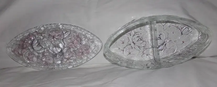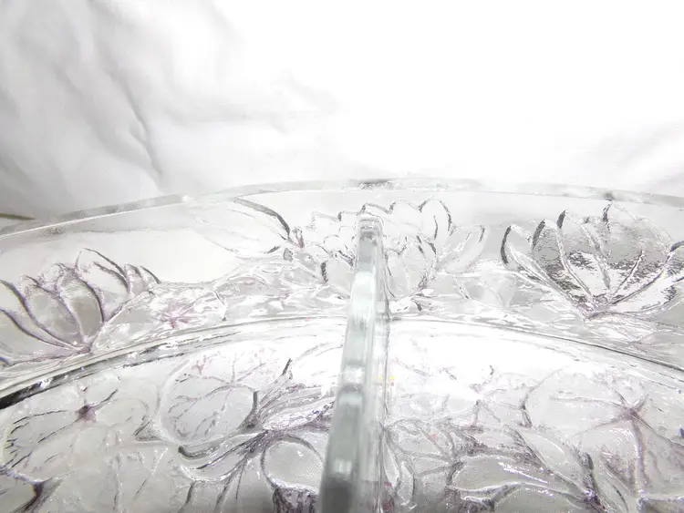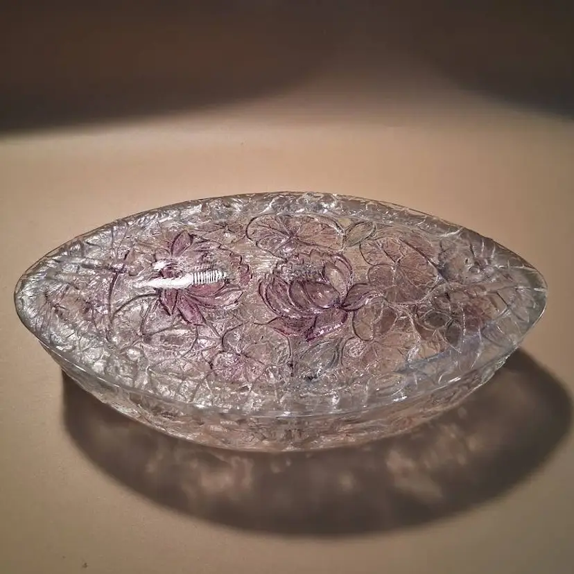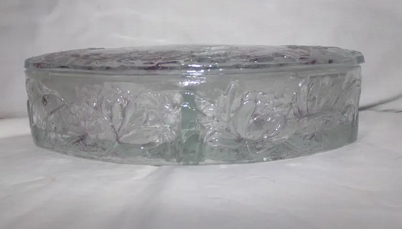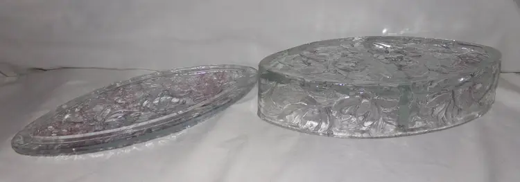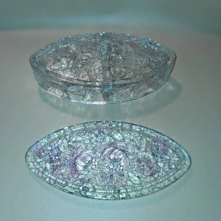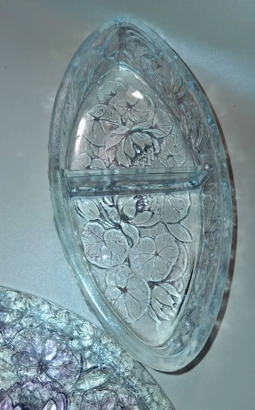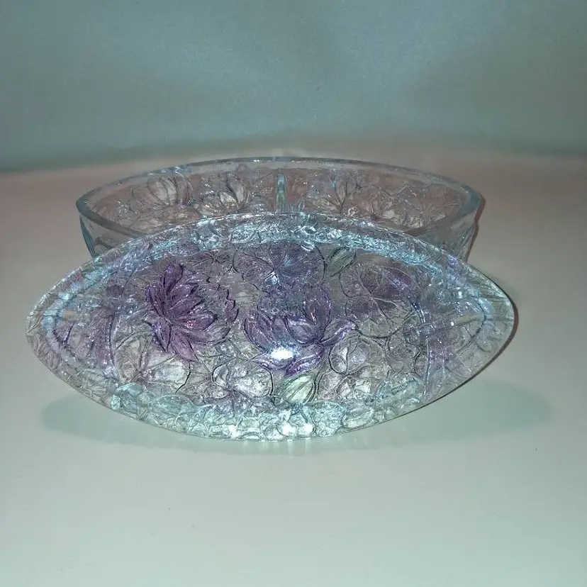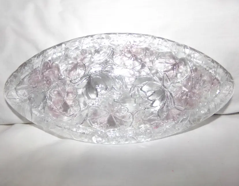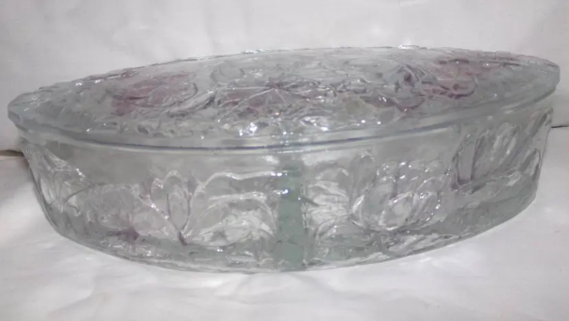 Approximately 8.5” long x 4.125” wide x 2.3” @tallest part. Lightly stained with purple hues, or as Consolidated called it, 'washed', in certain areas. It is crystal, so weighs 2.4 lbs unpacked! Condition is great-some flea bites on rim edges, as seen and expected, from years of use.