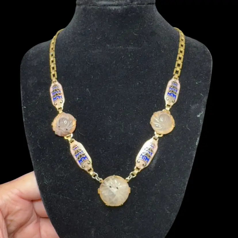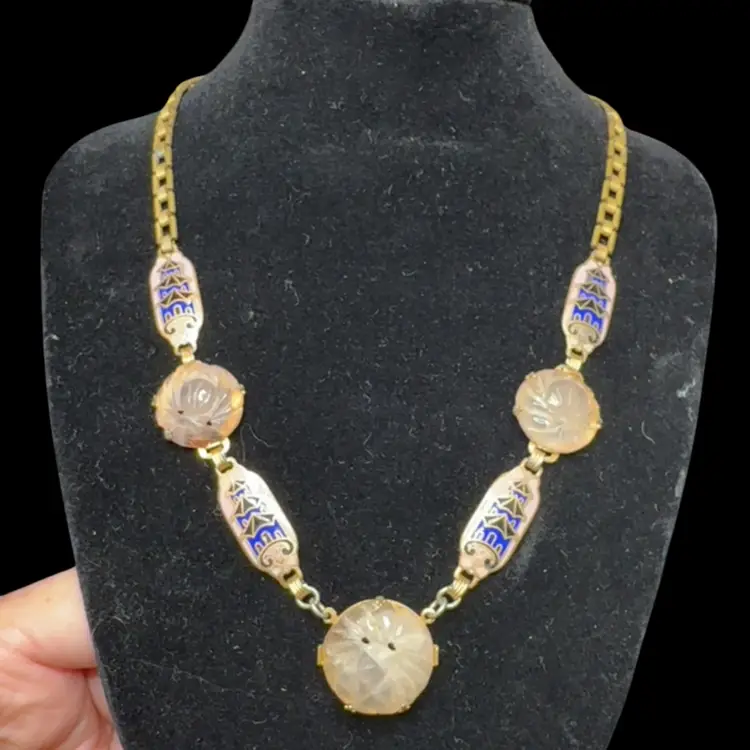 Vintage Art Deco Brass Egyptian Revival Enamel Pink Carved Stone Choker Necklace 16”