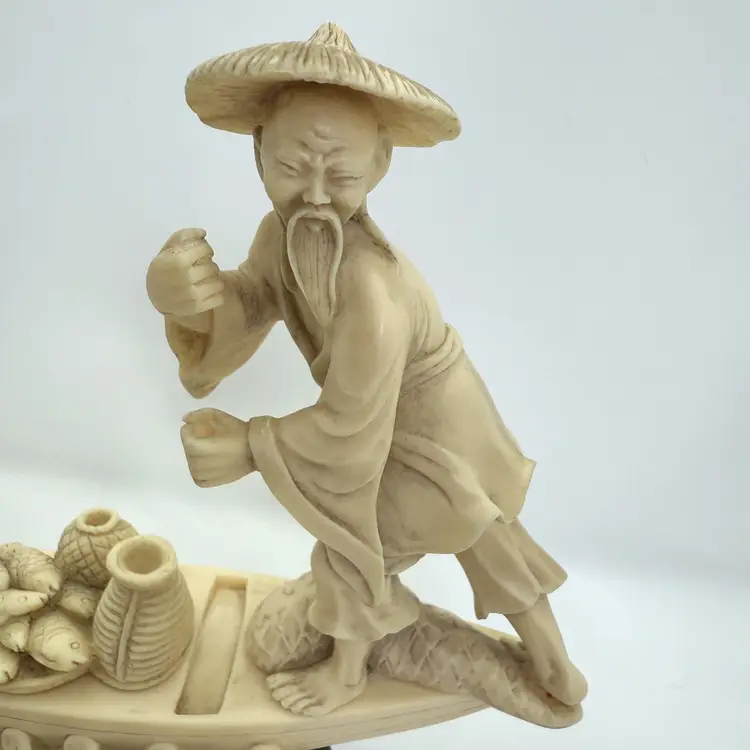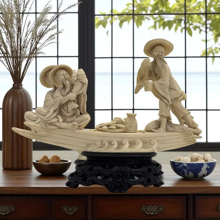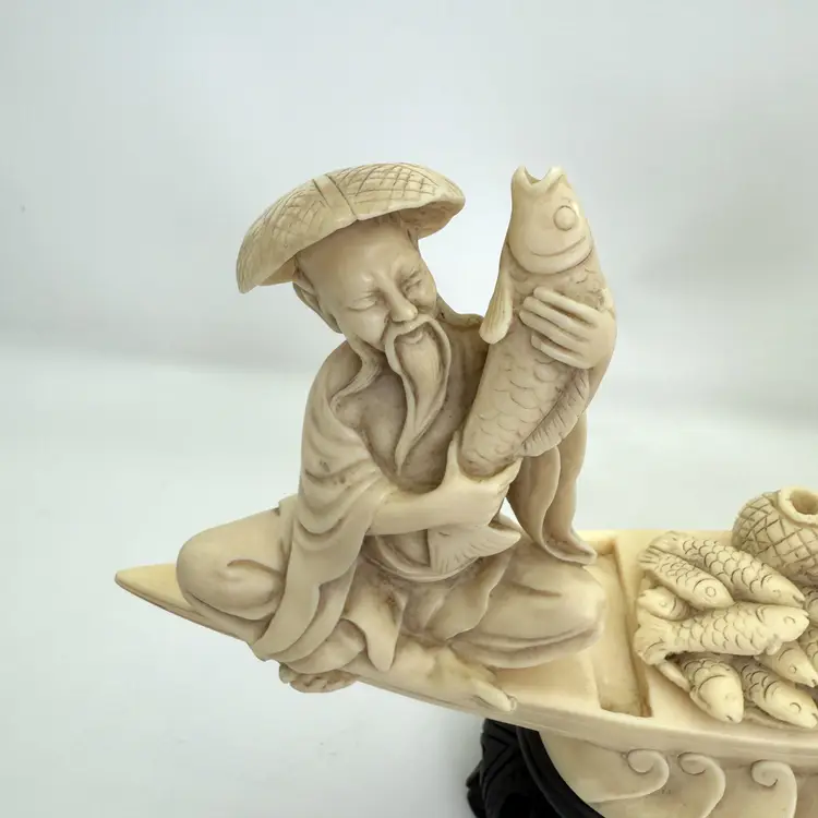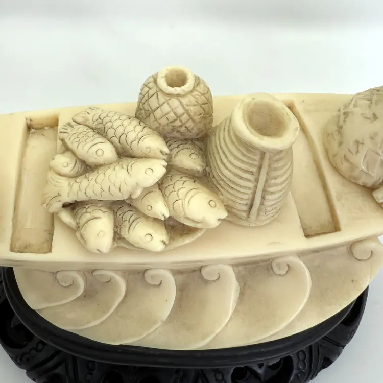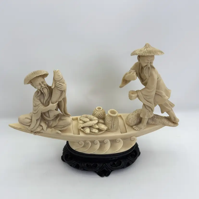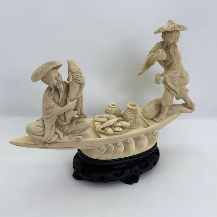 Capture the spirit of perseverance and abundance with this hand-detailed resin figurine. Two fishermen in traditional robes work a long boat, one proudly holding his catch while baskets of fish fill the deck. The scene rests on a carved black wood base and features an impressed Asian character seal on the underside.