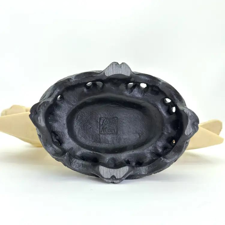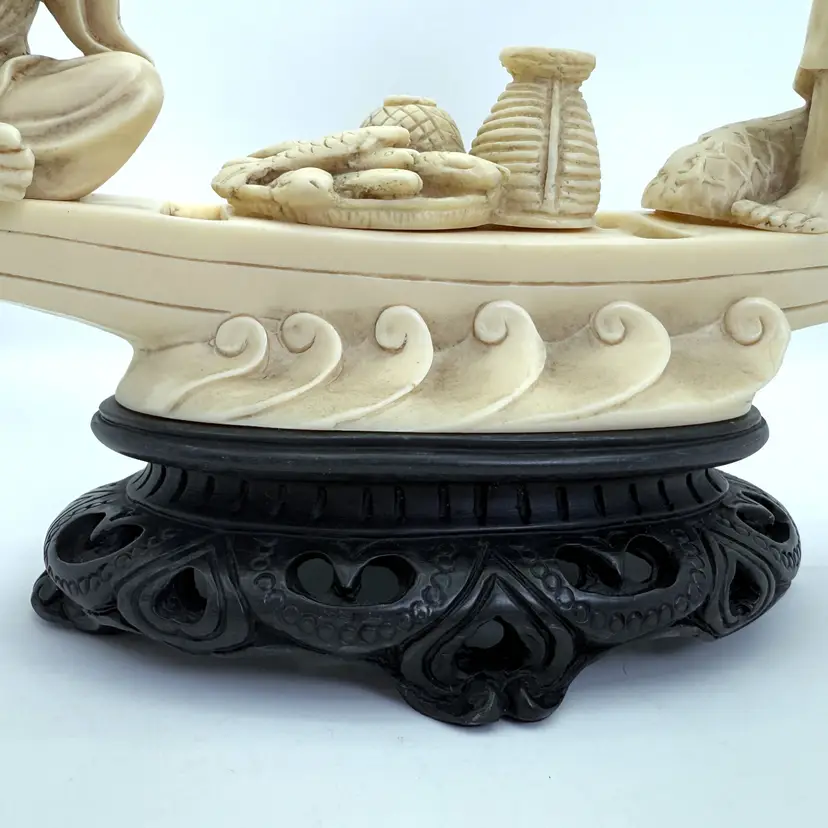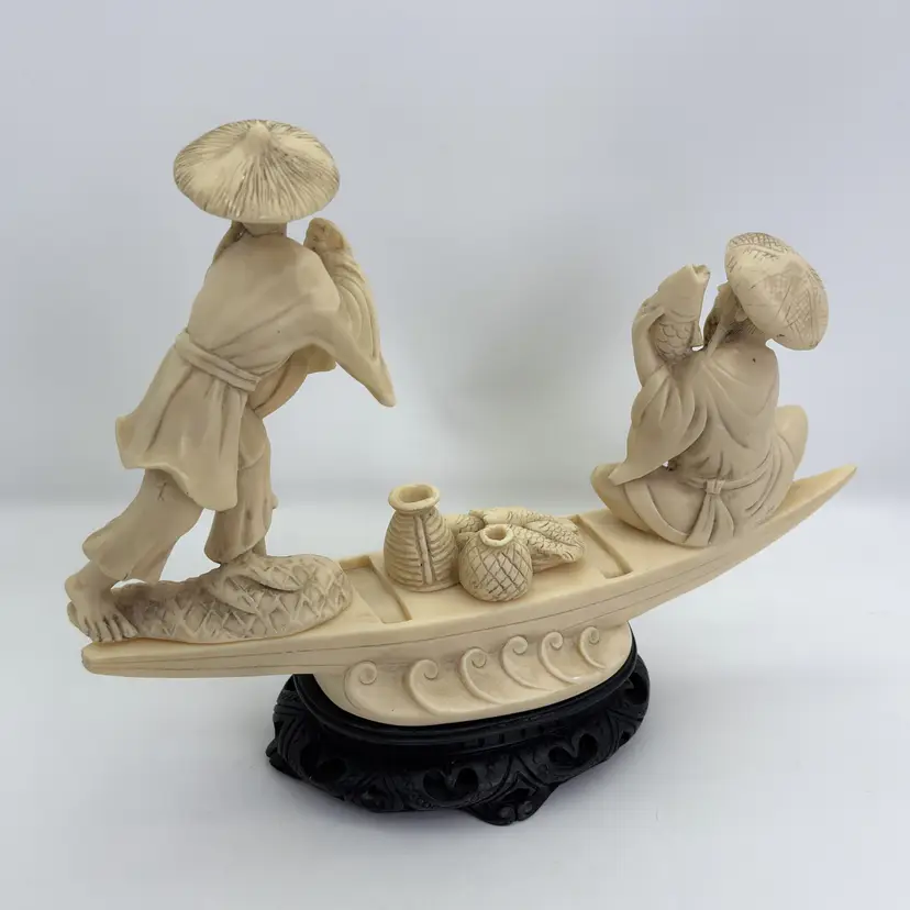 DETAILS: • Manufacturer: Unknown (signed with impressed Asian character mark) • Design: Two fishermen in traditional dress on a long boat with catch and baskets • Markings: Impressed Asian character seal mark on underside of base • Origin: China or Japan • Date/Era: c 1970s–1980s • Materials: Resin (figures and boat), carved wood (black pedestal base) • Color(s): Ivory/cream with black base • Dimensions: Length: 10", Width: 4", Height: 8.25", Weight: 1 lb 15 oz • Condition: Very good vintage condition overall; missing oar from standing fisherman’s hands, no other visible damage or cracks.