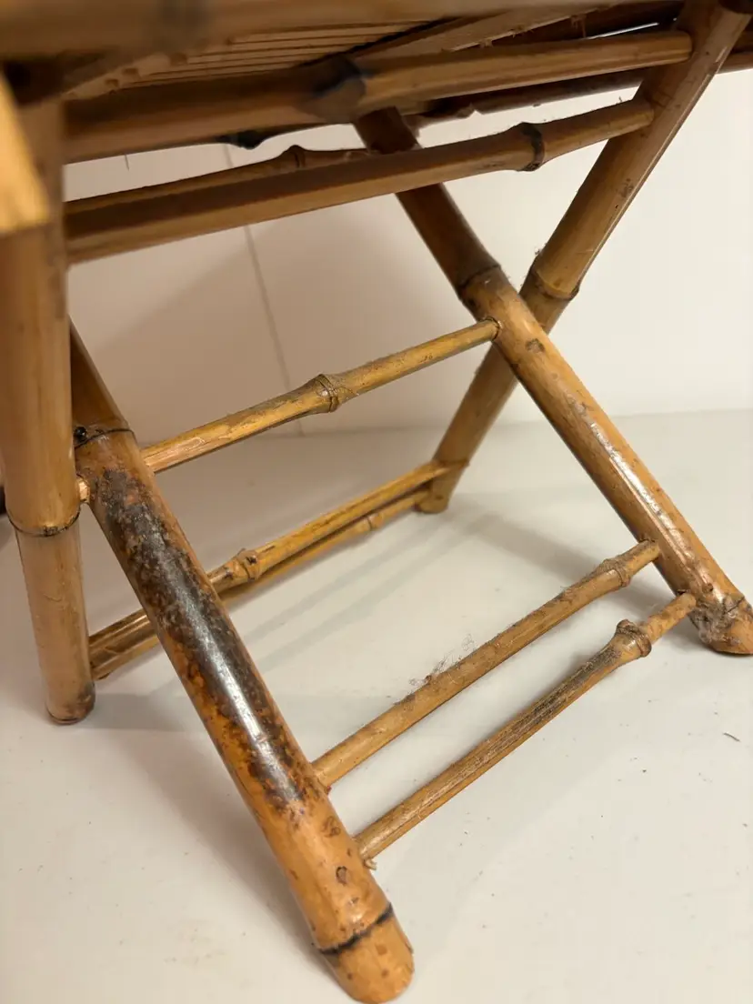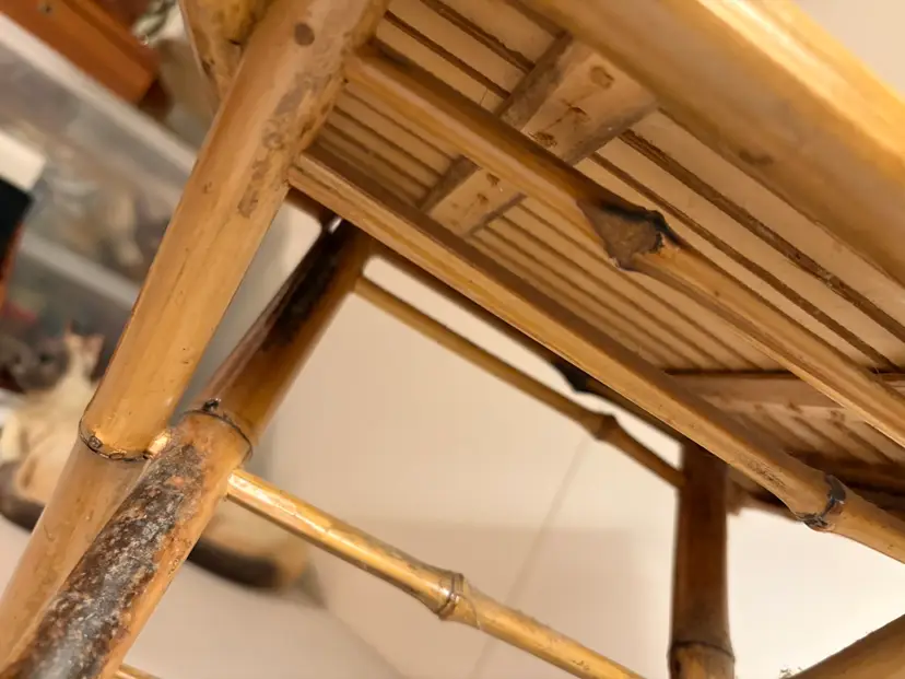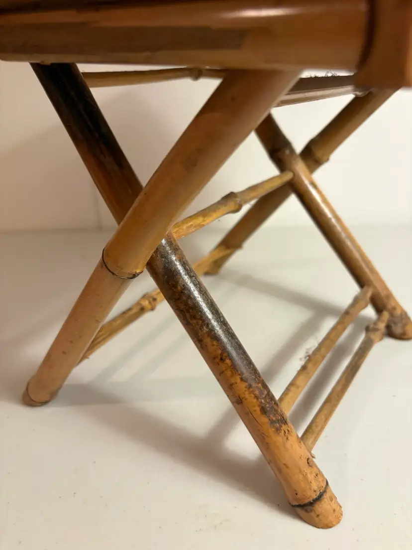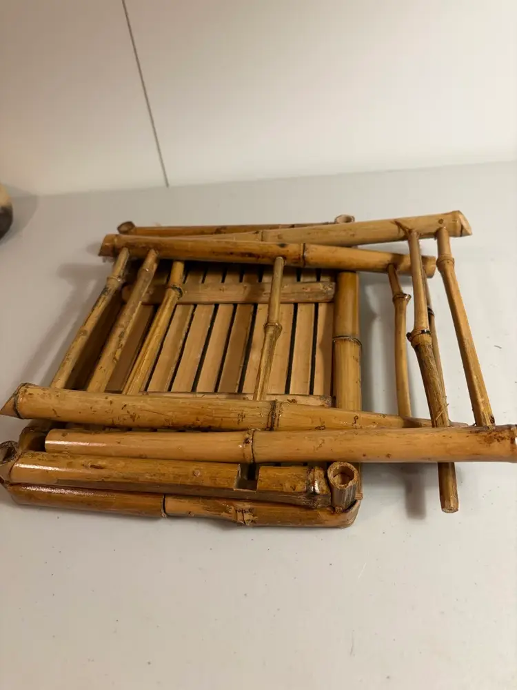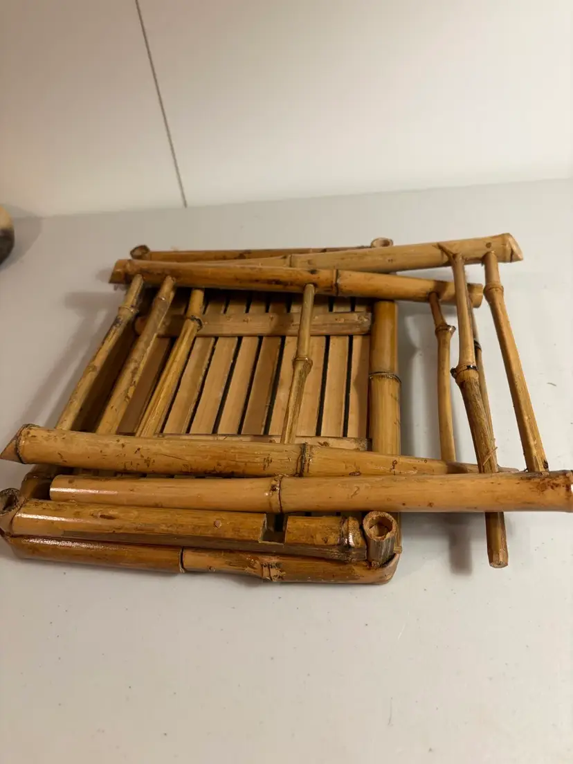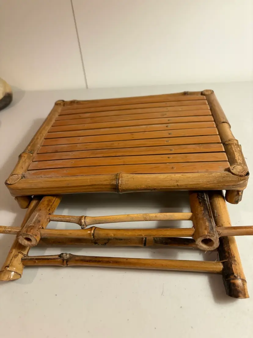 This bamboo stool is fun to use as a plant stand or riser. It measures 9” tall, the top is 10” by 8”.
