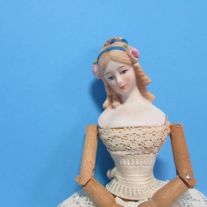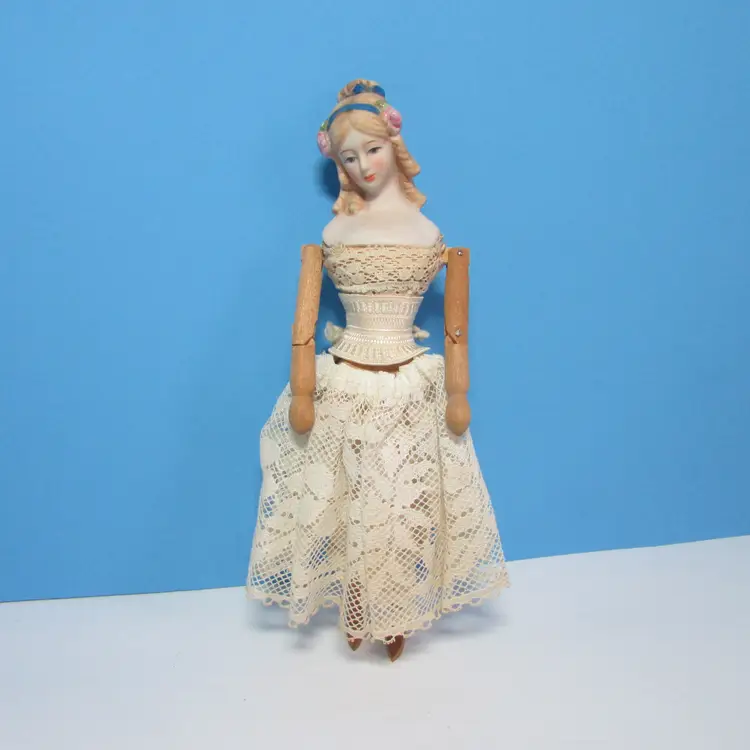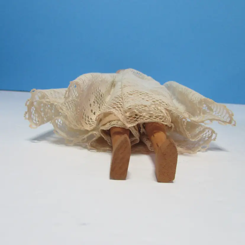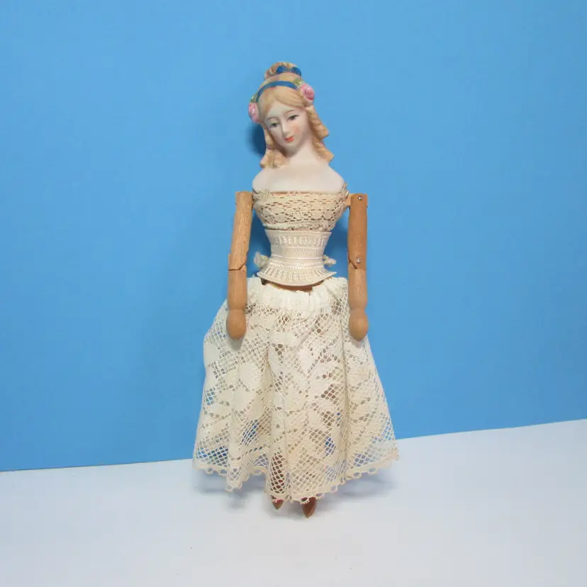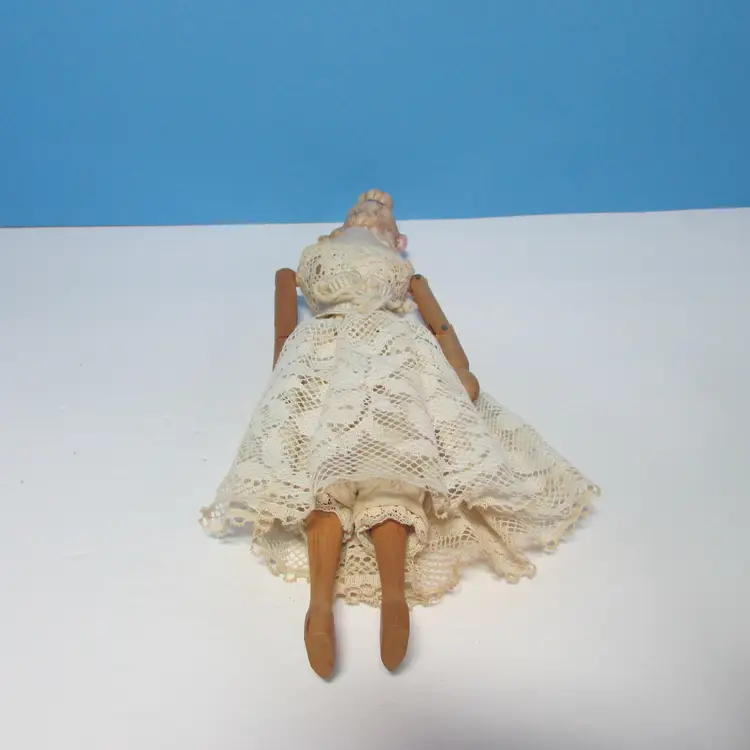 This lovely doll has some wear, she is missing her dress, but still has her undergarments. Still nice to display as is, she is about 9 1/2" tall. This is shipped from a smoke free home. Thanks for looking!