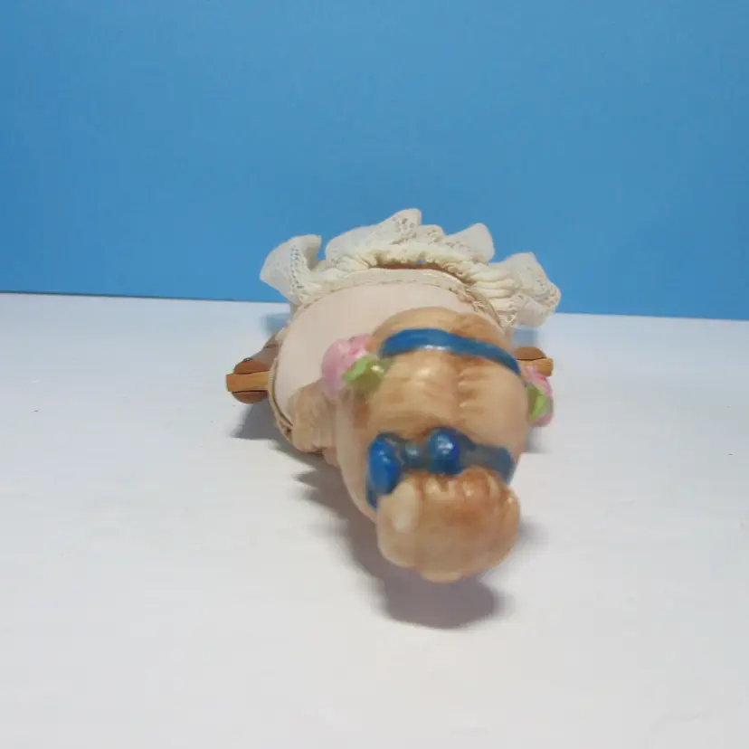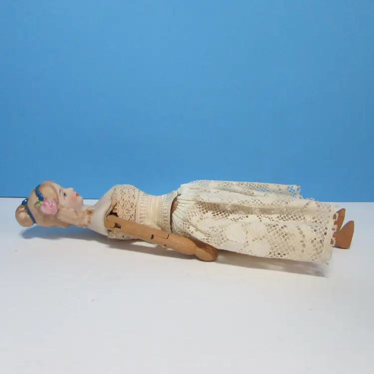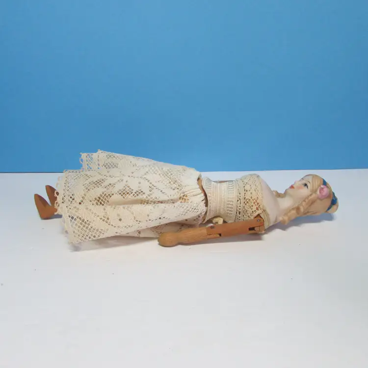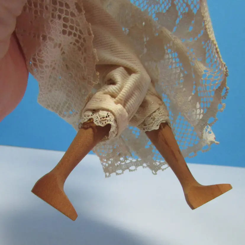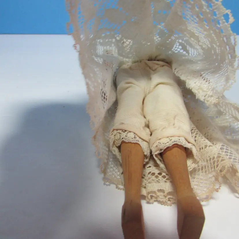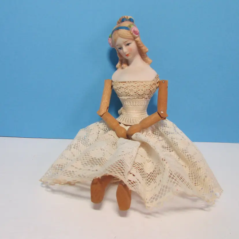 This lovely doll has some wear, she is missing her dress, but still has her undergarments. Still nice to display as is, she is about 9 1/2" tall. This is shipped from a smoke free home. Thanks for looking!