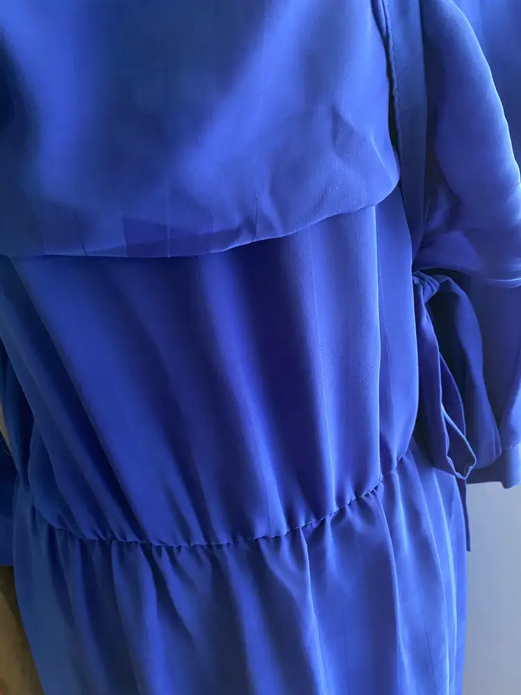 Has side tie towards waist, left side is open from shoulder towards tie. Top of dress is 2 layers - see photo 8. Waist is Elastic. Fabric is not stretchy.