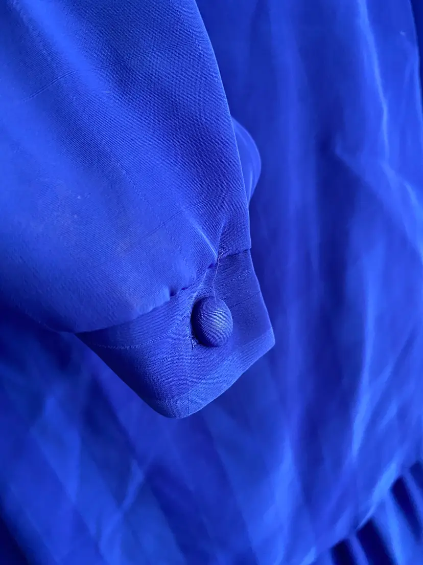 Brand/Maker- Alison Peters Size- Not labeled, Please see measurements below, Size aligns with a modern Large Color- Blue Condition description- No rips or tears. Buttons intact on sleeves. Fabric- Label cut out but consistent with polyester Made in- U.S.A.
