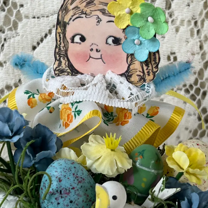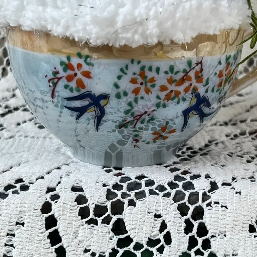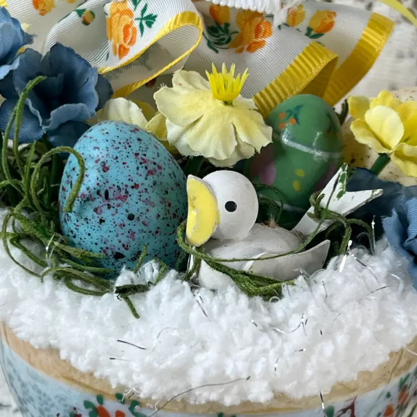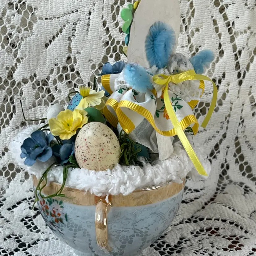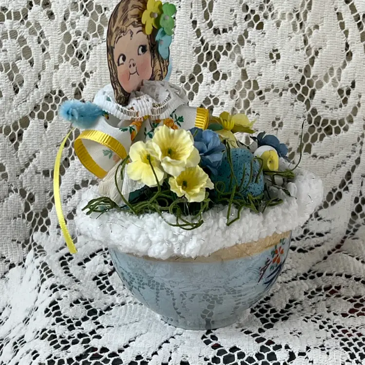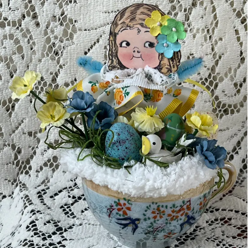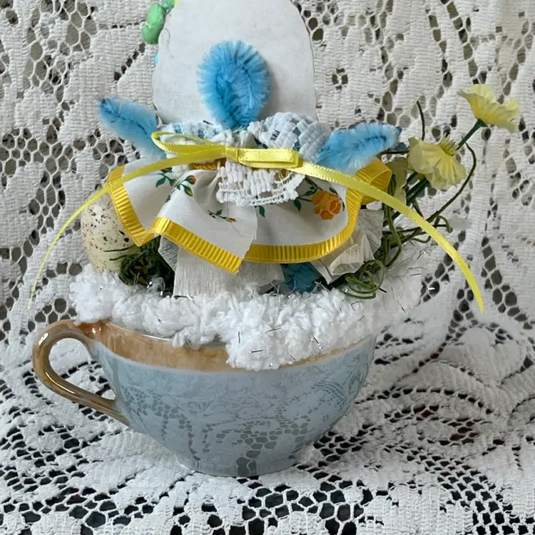 004 Vintage Blue Luster, Teacup Easter/Spring Assemblage 6" X 6"