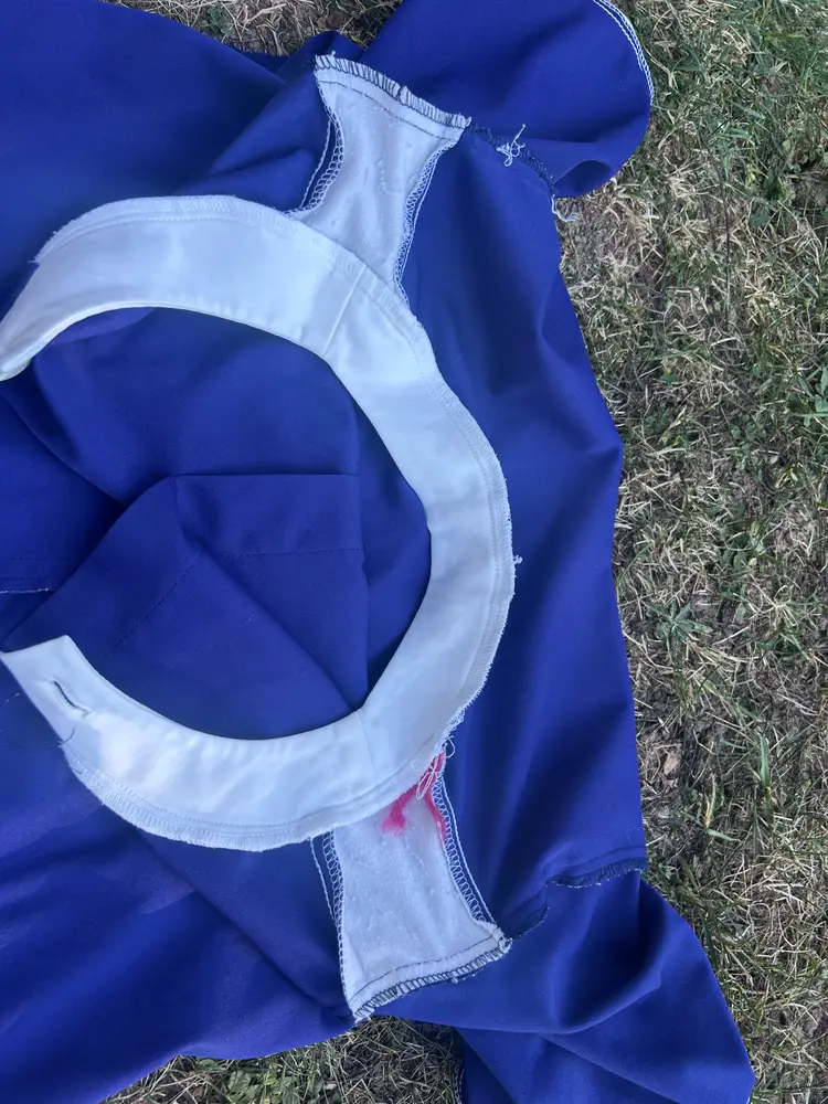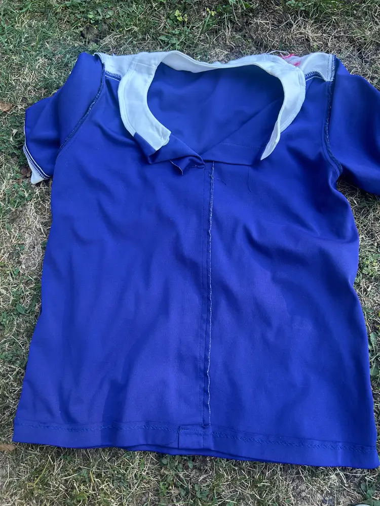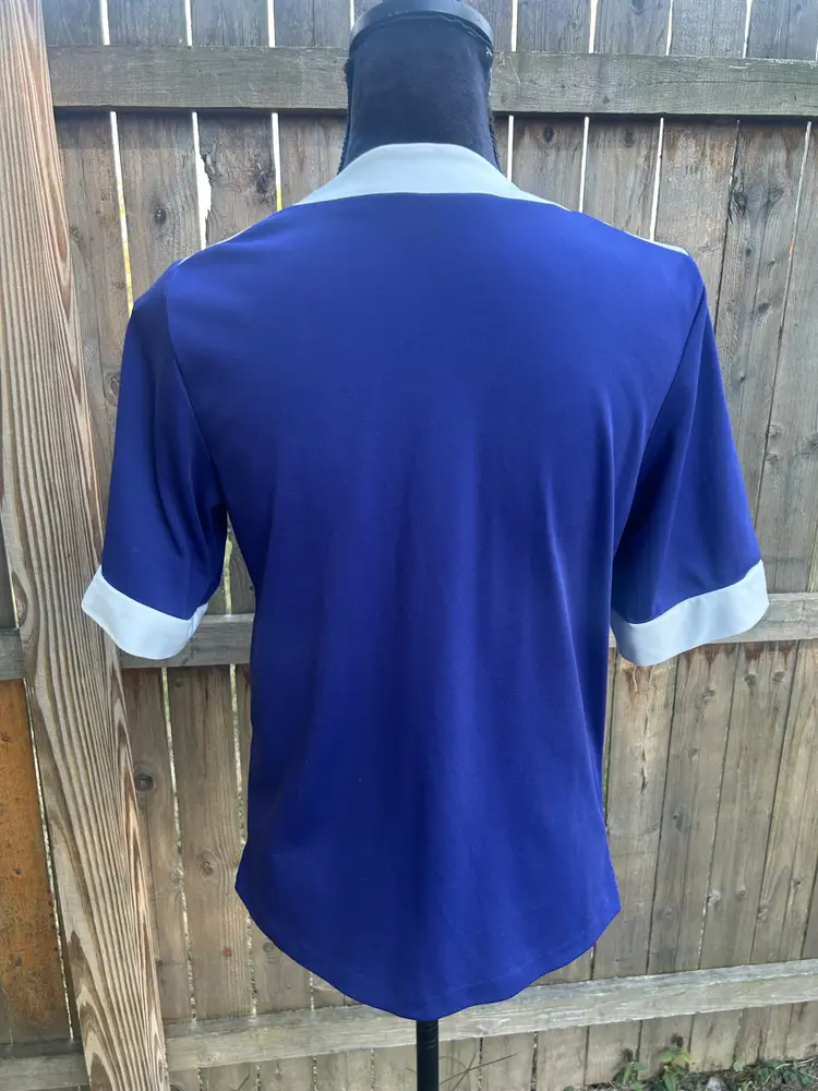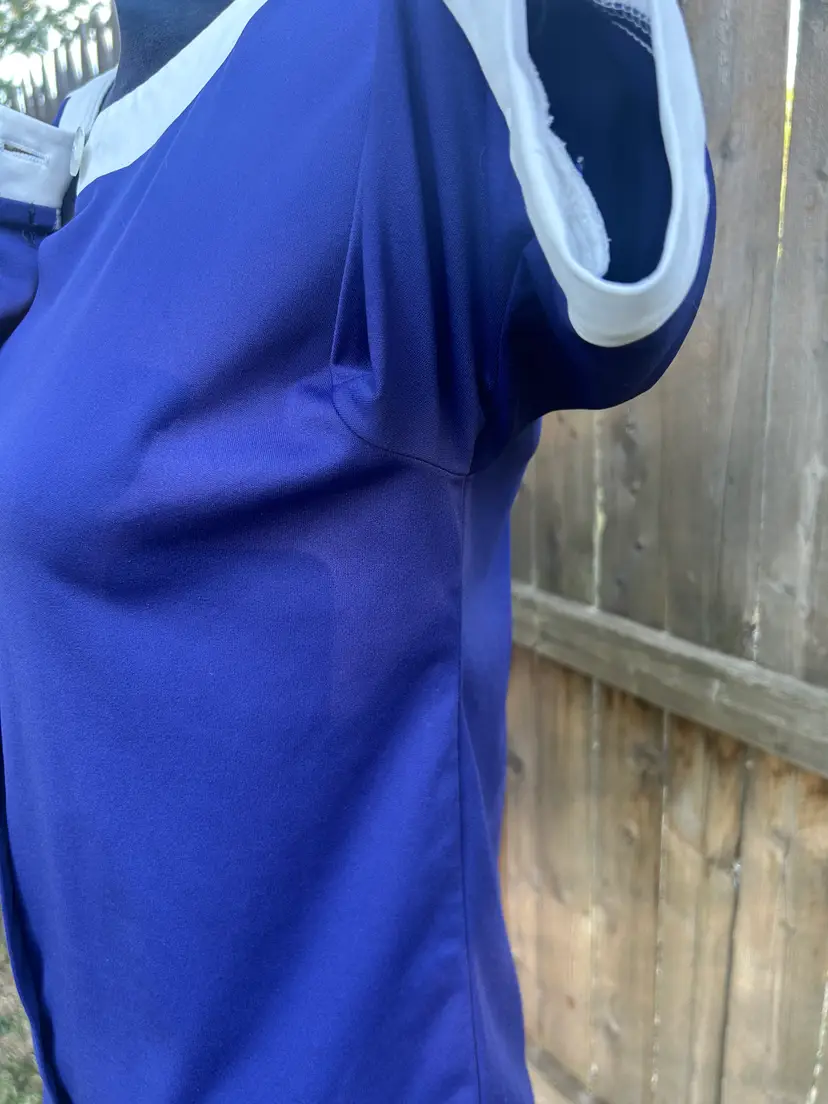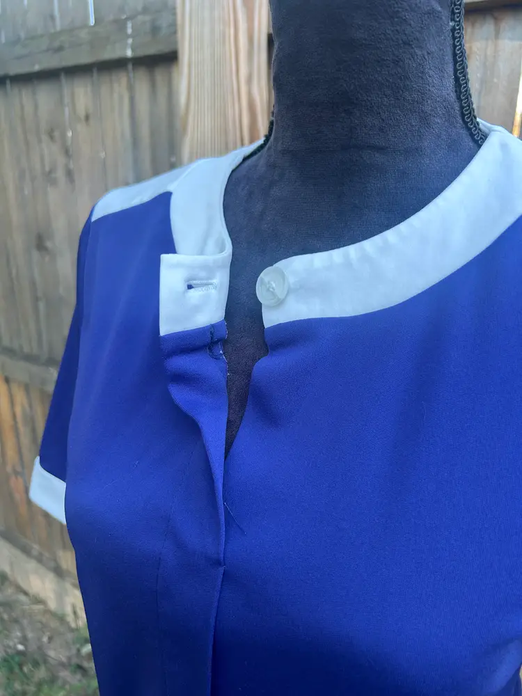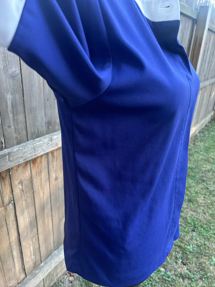 Brand/Maker- None listed Size- No labels present Please see measurements below - would be approx a modern Medium Color- Blue, white Condition description- No rips, stains or tears. Fabric- None listed but consistent with Polyester