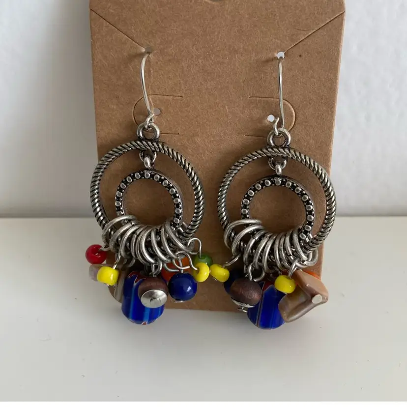 Vintage Bohemian glass, wood, shell and millefiori beaded drop earrings. They measure 7/8” across and drop 2 1/8” down. Artisan crafted.