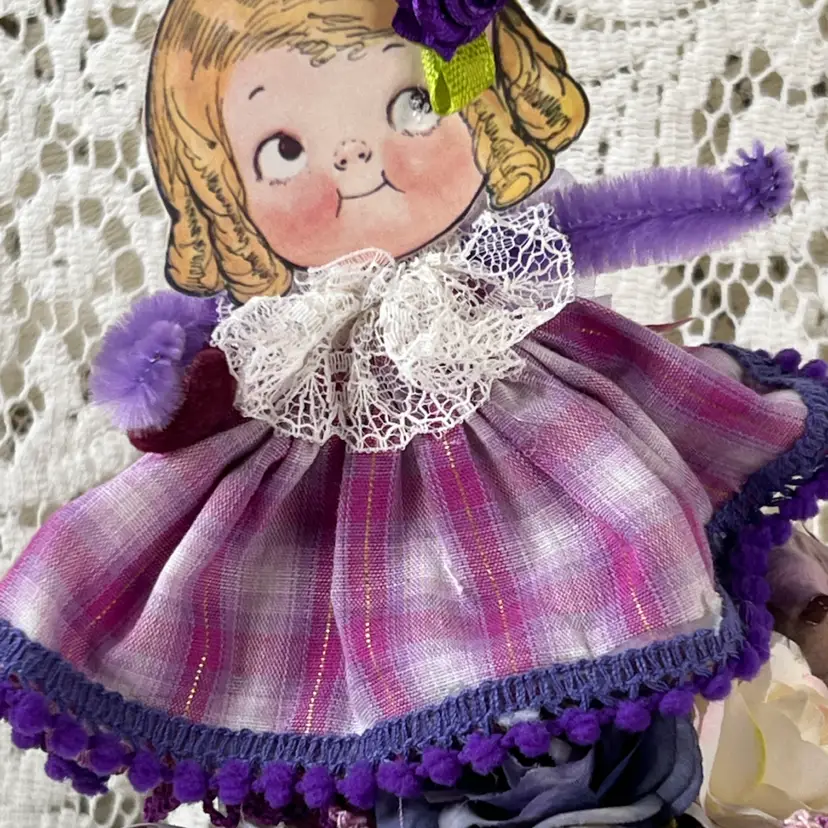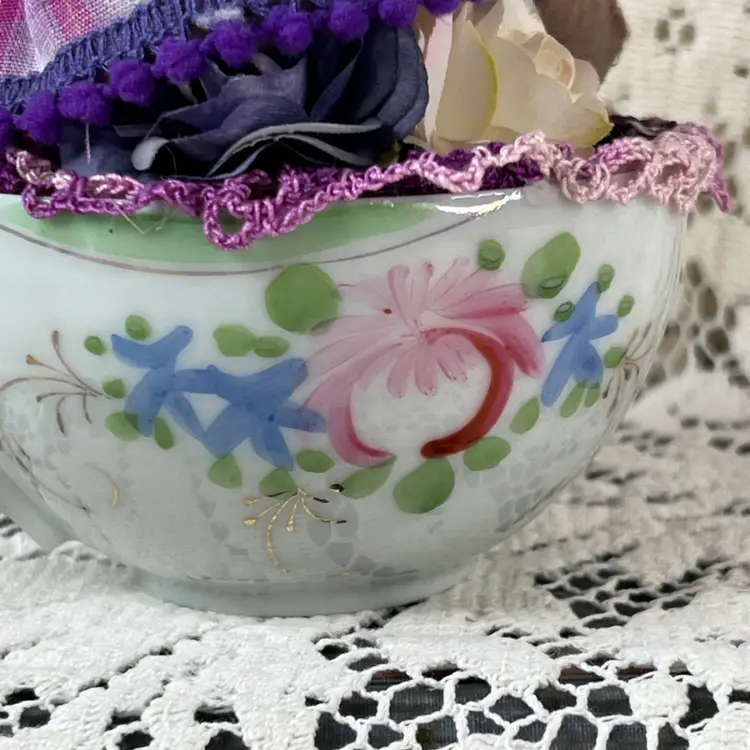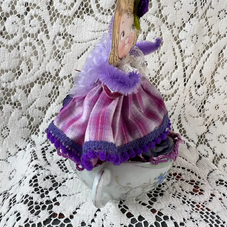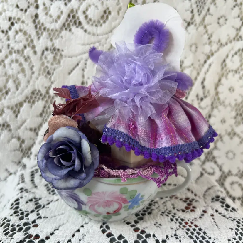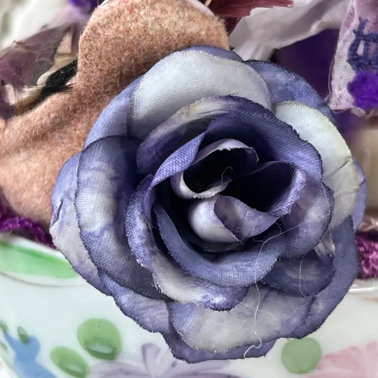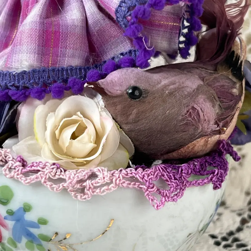 002 Vintage Bone China Teacup Assemblage Purple Bird 6.25" X 6"