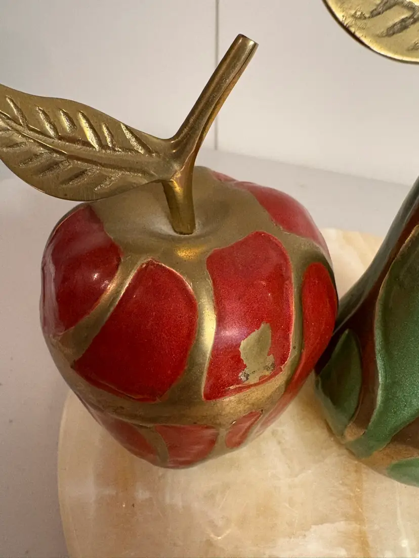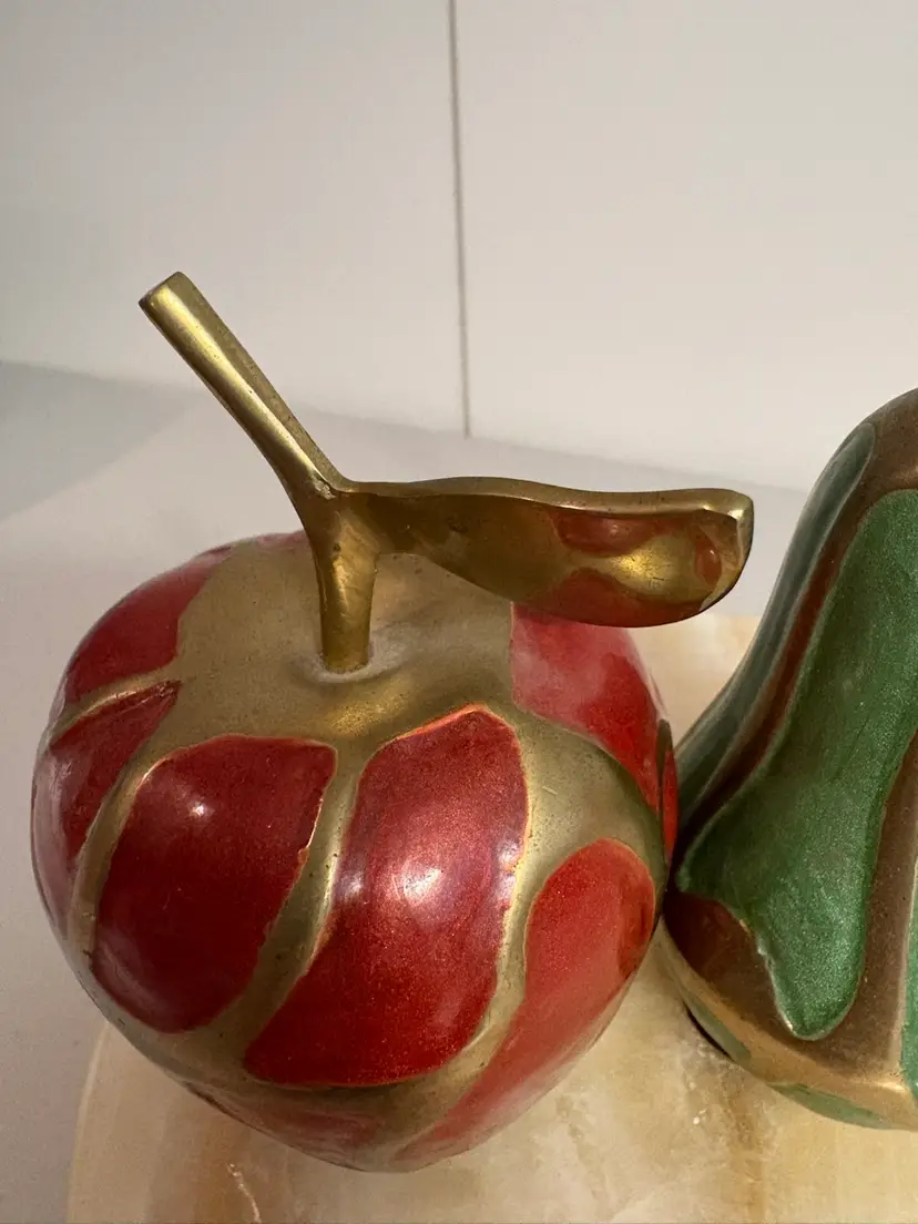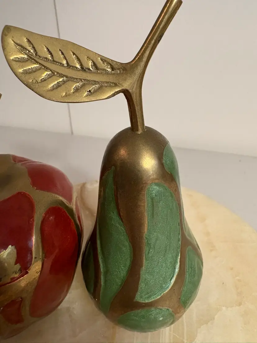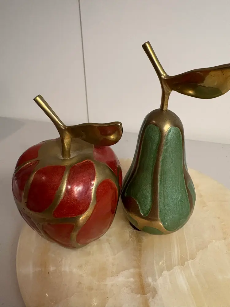 This product is a set of vintage brass and enamel pear and apple paperweights/figurines. Made from brass and featuring intricate enamel detailing, these paperweights are a unique and decorative addition to any collection. While not handmade, they still hold a charm and craftsmanship that makes them desirable for collectors of metalware and vintage items.