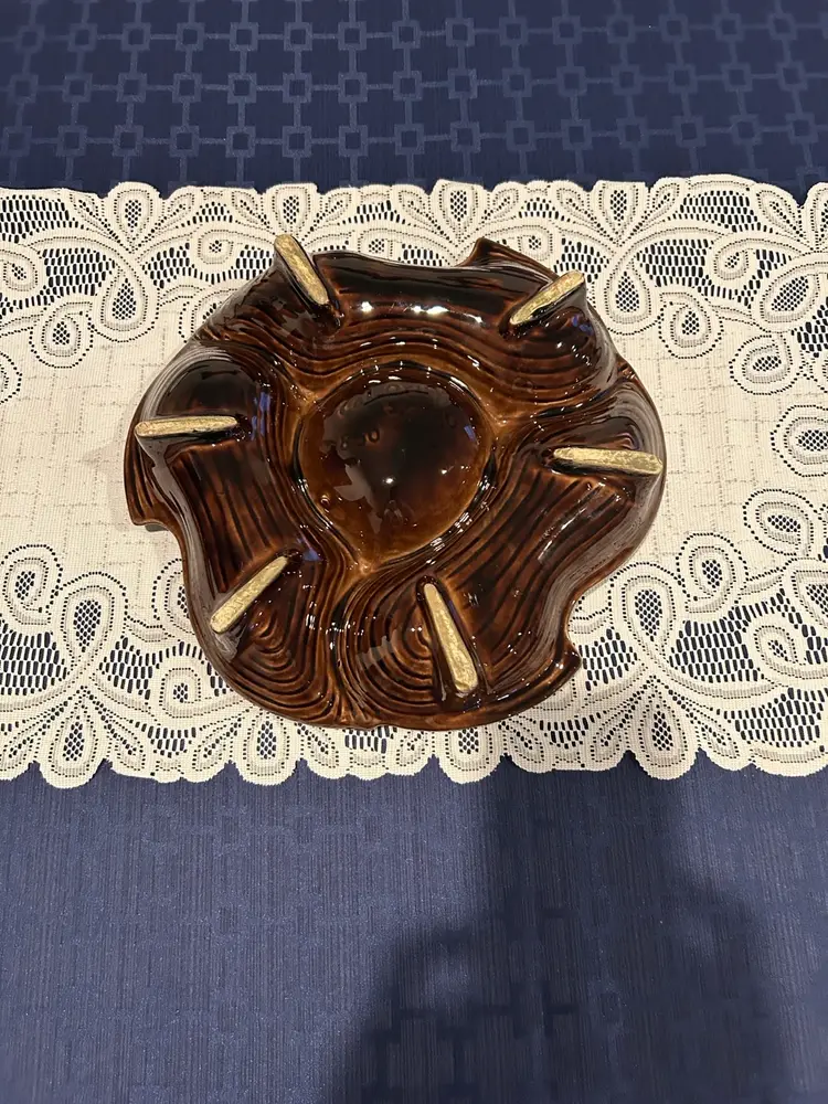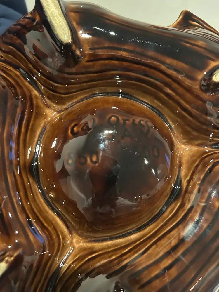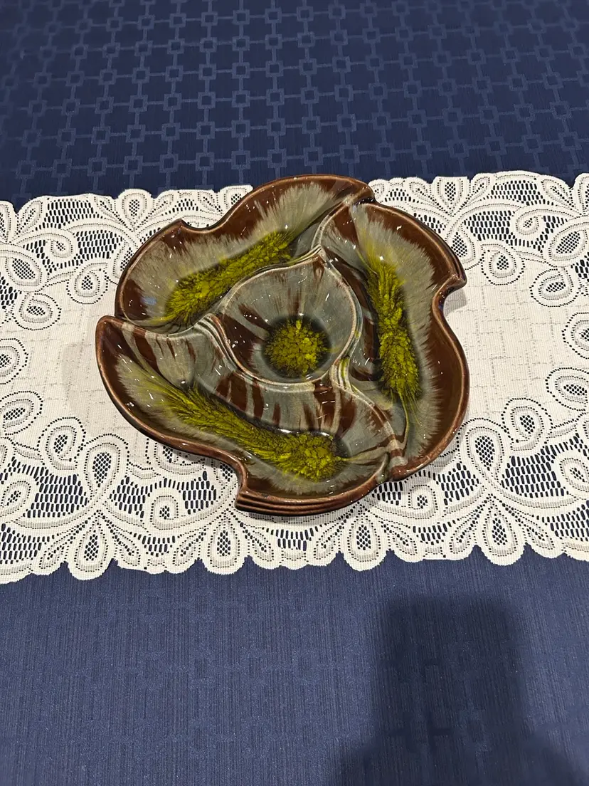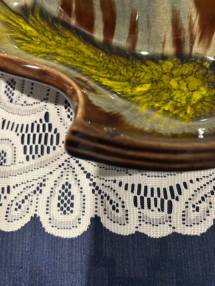 Unique California Original ceramic dish with artistic design. Features brown, green, and cream colors. Perfect for serving or decor. Wt 2.8 #. One small chip see pic