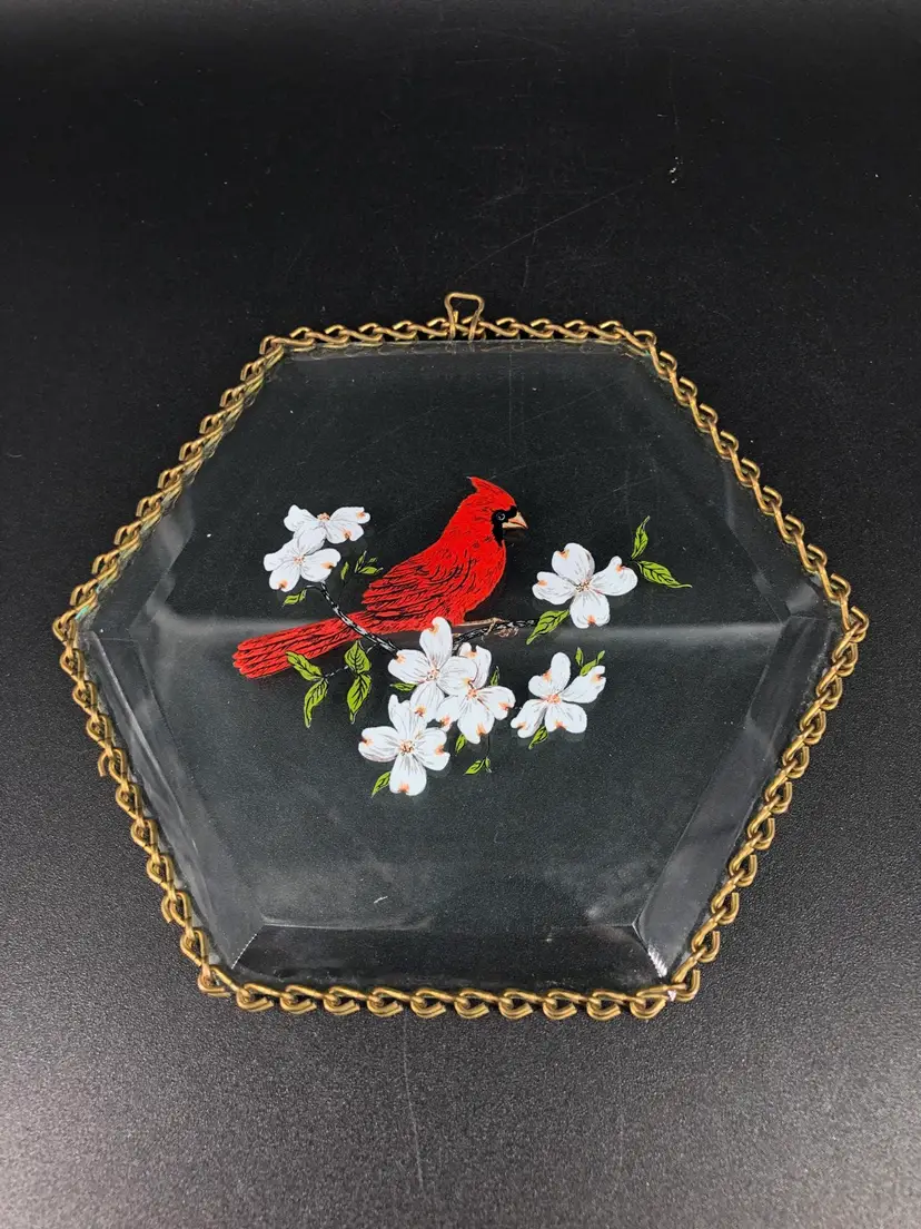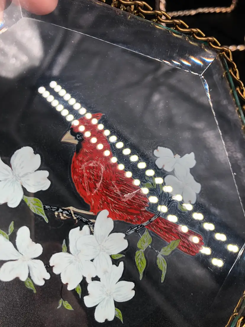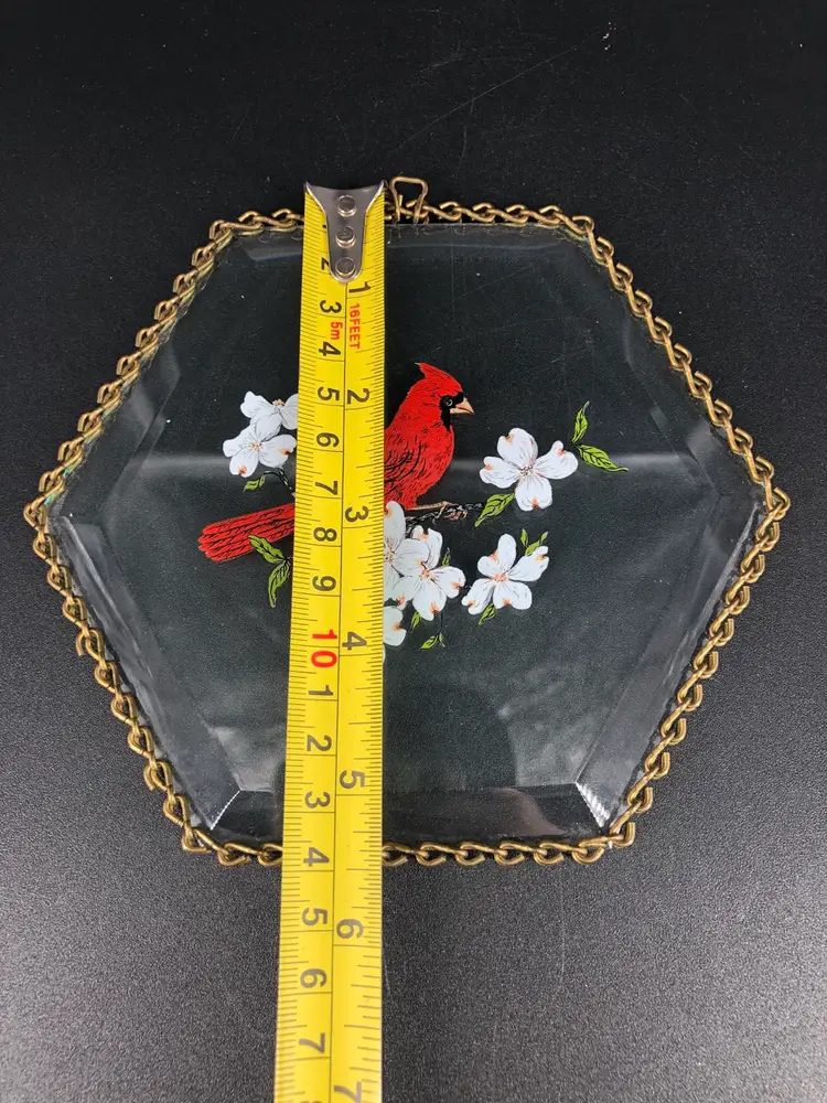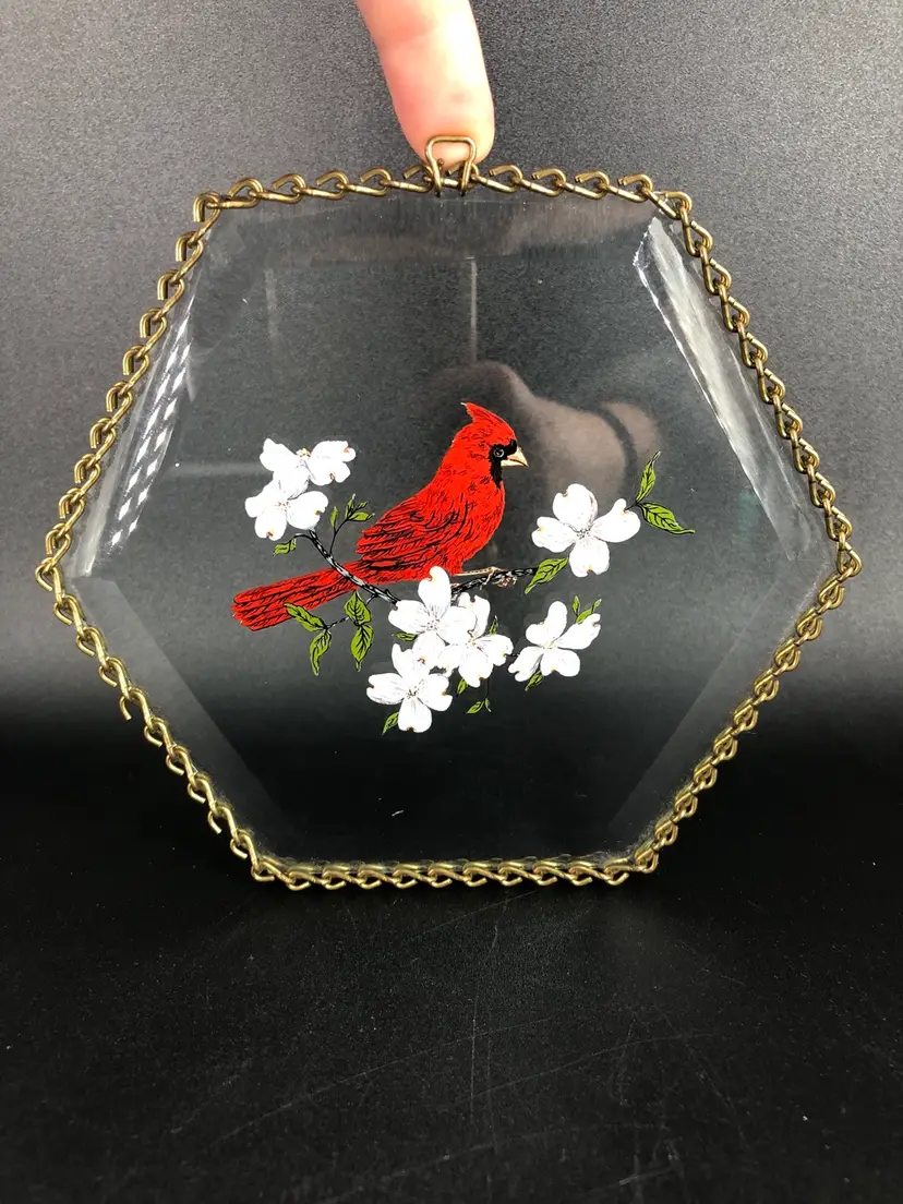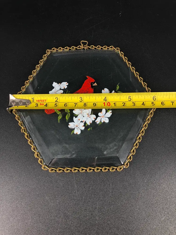 Has a really neat border Someone has put their initials on the back scratches in the glass Does not come with stand Looks absolutely stunning in a window About 5.5 inches tall