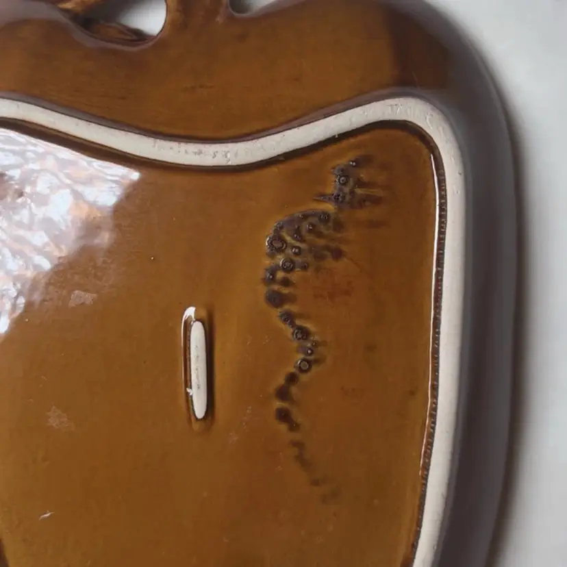 This vintage ceramic apple dish features a solid red color with 3-D applied leaves, reflecting a farmhouse style and mid-century modern aesthetic. The studio art pottery piece is 7.5" in length and 6" in width, with a glossy finish and a vintage original production style. With its unique shape and American theme, this serving dish is a charming addition to any home decor, adding a touch of nostalgia and artistry to your kitchen or dining table. Please note the kiln stilt marks on the back of the dish as seen in last photo.