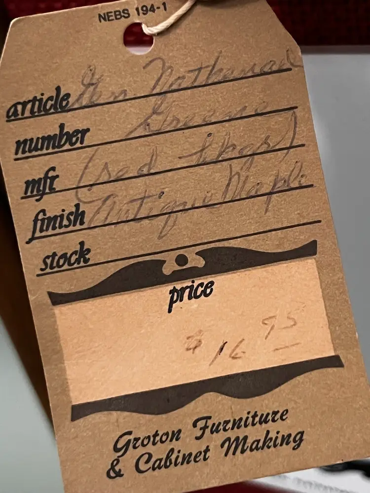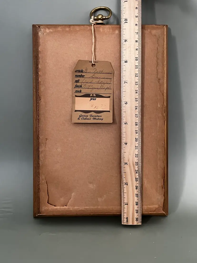 From the “Washington’s Bodyguard Series” a beautifully framed tile of General Nathaneal Greene mounted on fabric and framed in antique maple. This mid century piece still bears the original price tag and provenance from Groton Cabinet and Furniture Makers, in Groton CT. In excellent vintage condition. Perfect for the history buff and New England decor alike.