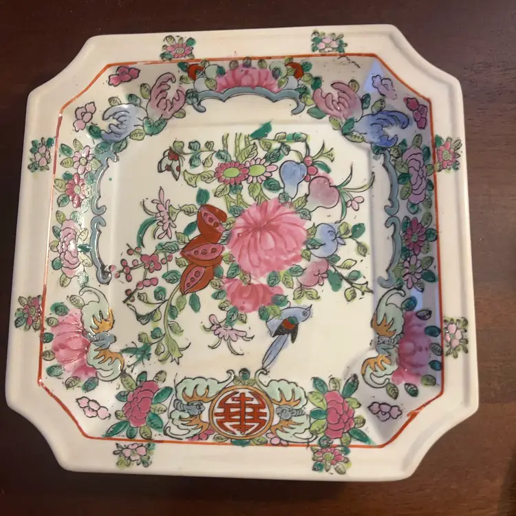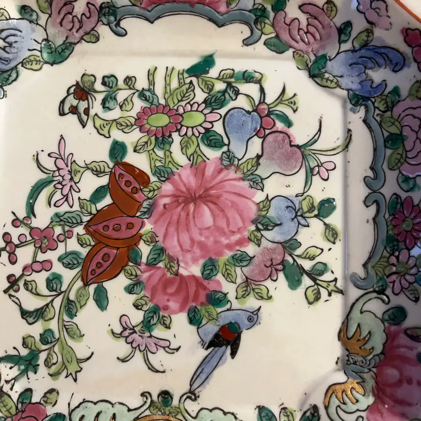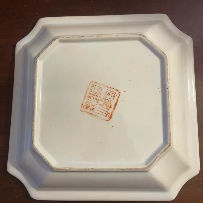 Vintage Chinese octagonal decorative porcelain plate with red seal mark. 8”x8”