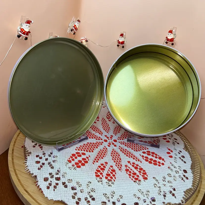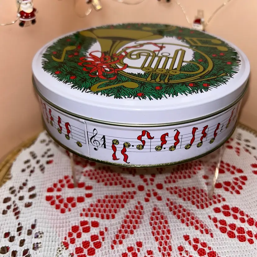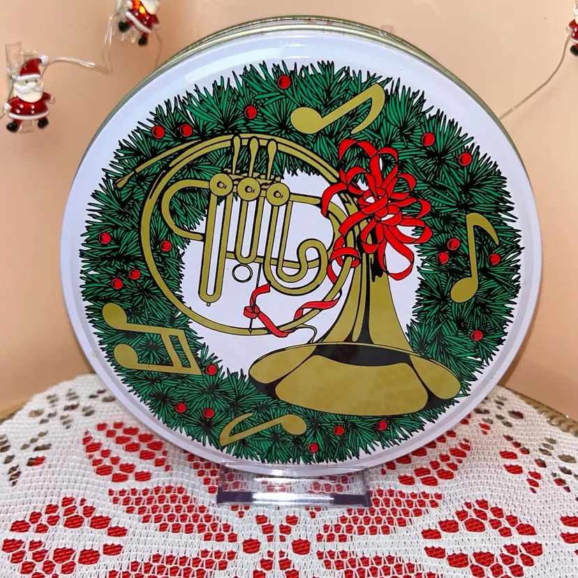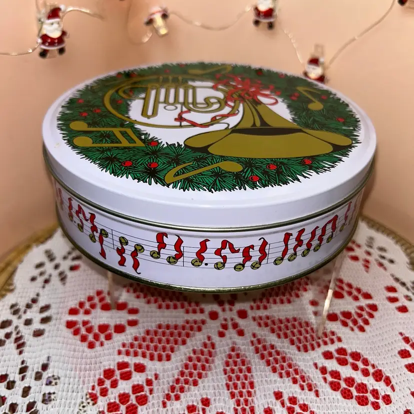 Tin is 6.5” in diameter across top, 1.75” tall. French horn on a wreath, with music notes are printed on lid. Around outside rim are printed bells on red ribbons arranged like notes on a musical scale. Inside and out are in excellent condition.