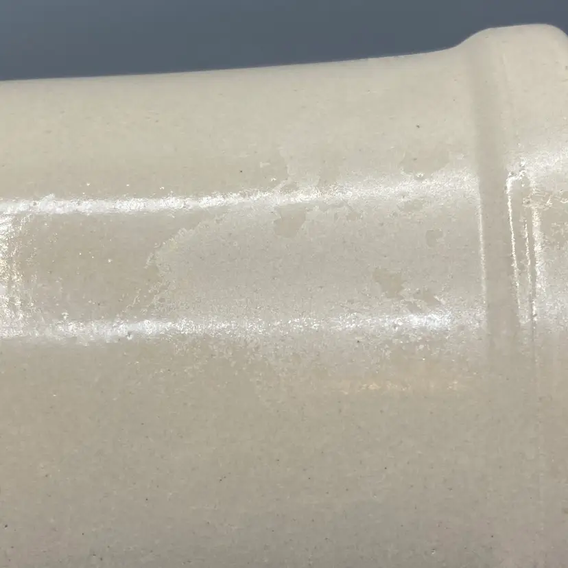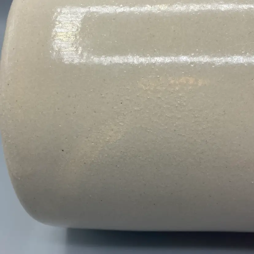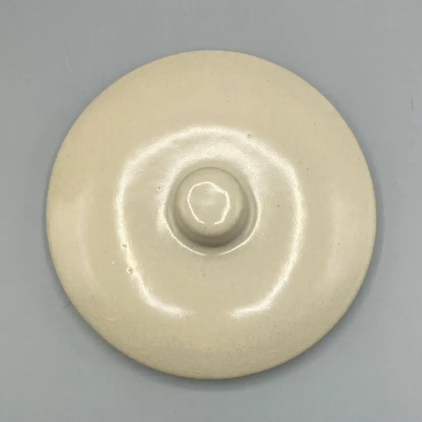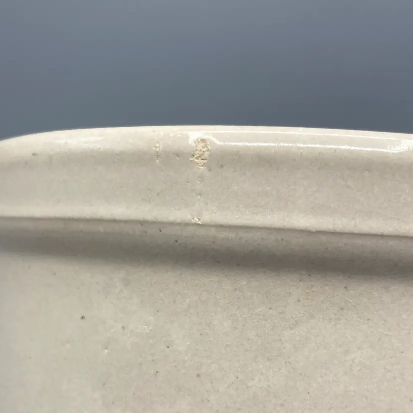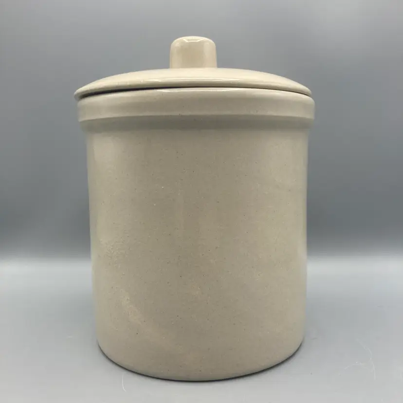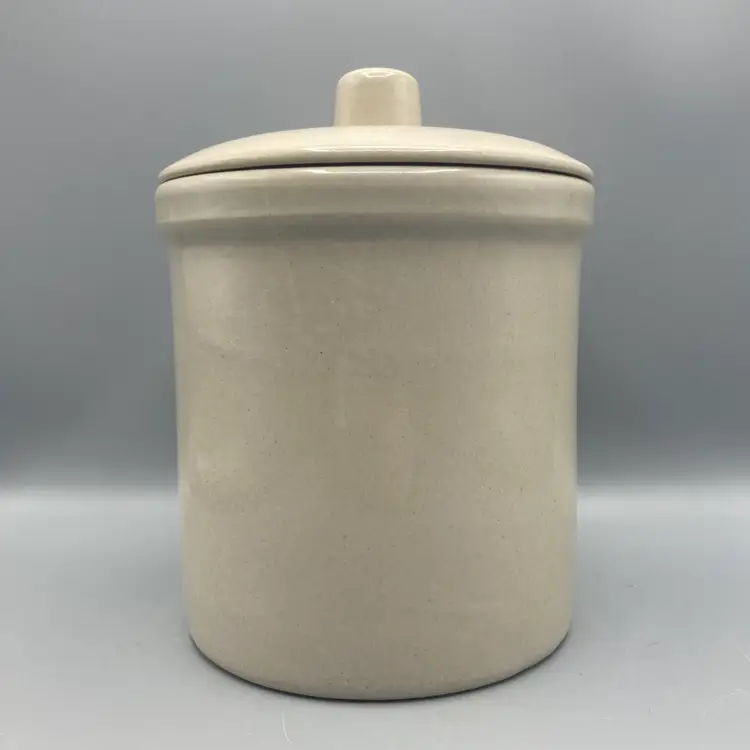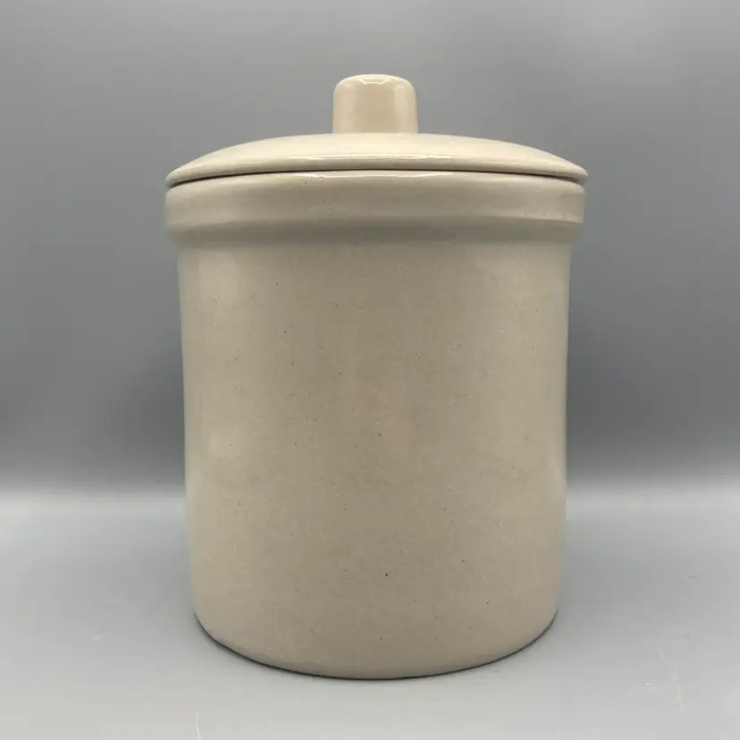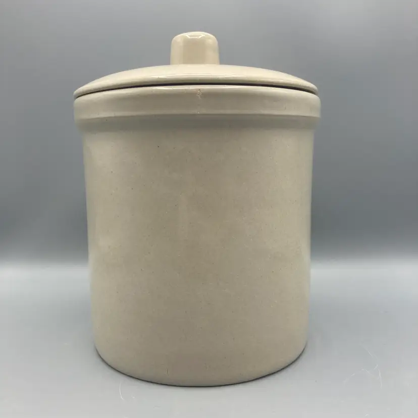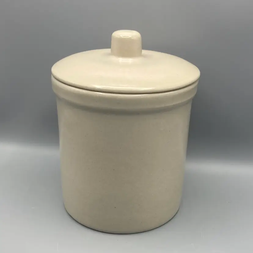 This crock is in good overall condition. There is one area where the glaze isn't as glossy as the rest, an area where the pottery is a bit rough, and one small flea bite chip on the edge of the crock, all clearly seen in the pictures. It measures approximately 8" tall with the lid on x 6 1/4" across.