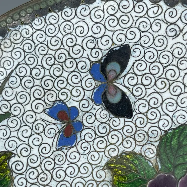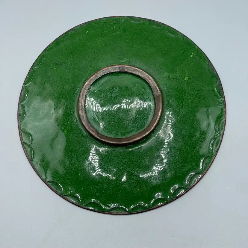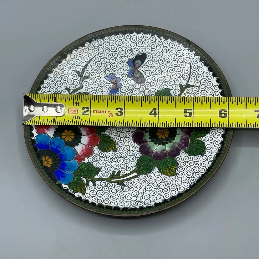 No chips or cracks. About 6-1/8 inches across. Some wear and scratches due to age and use.
