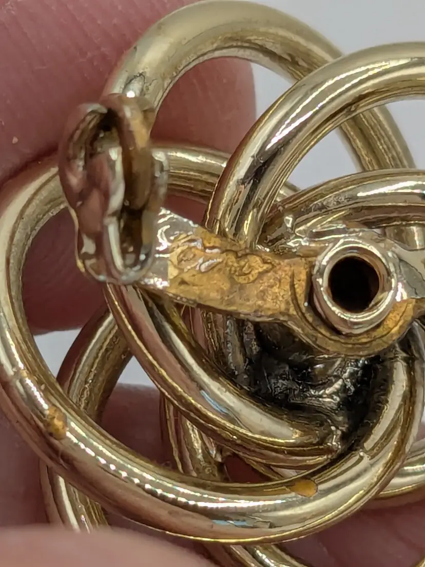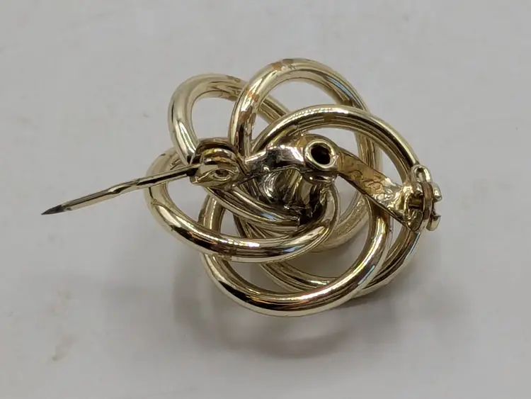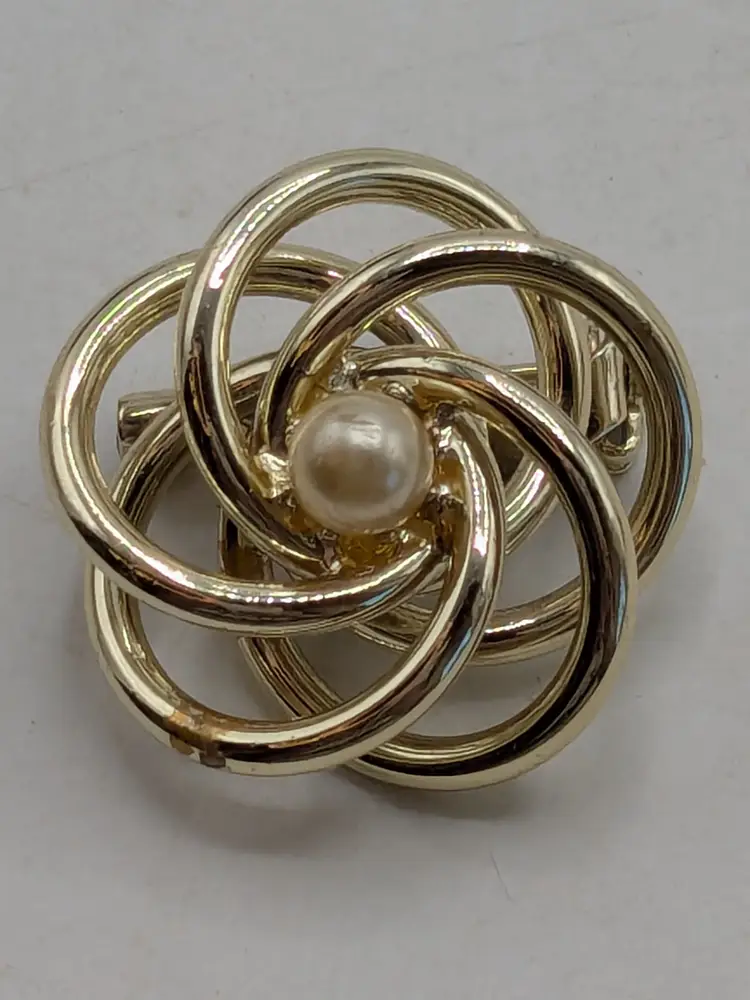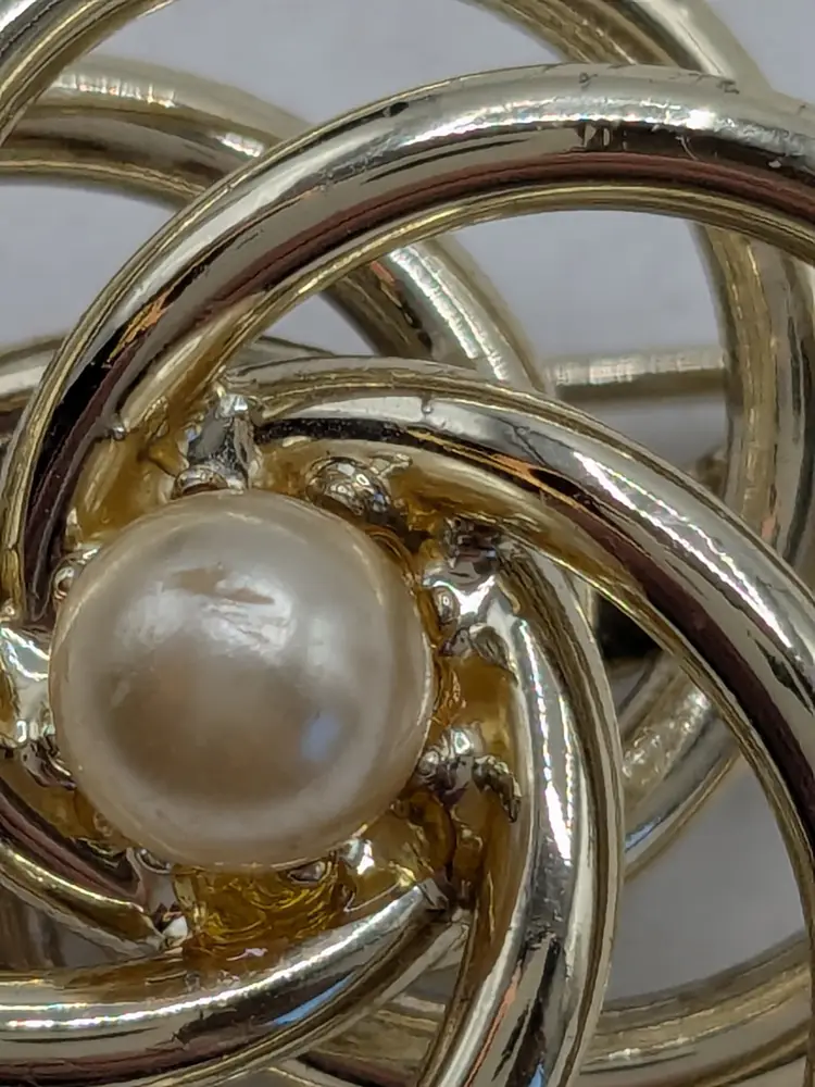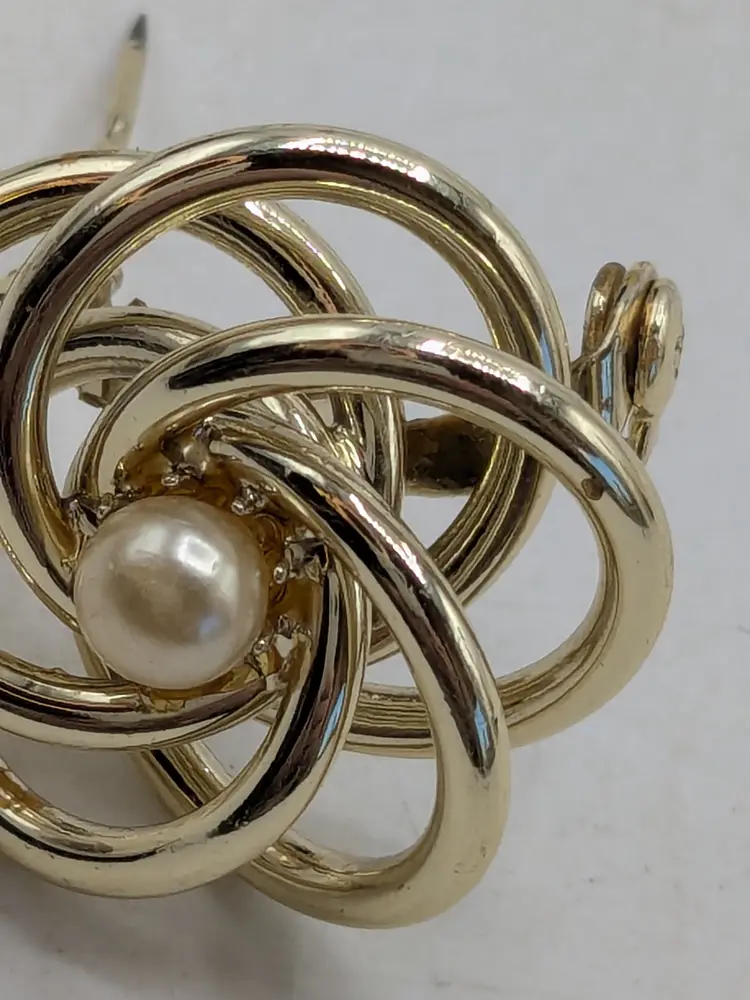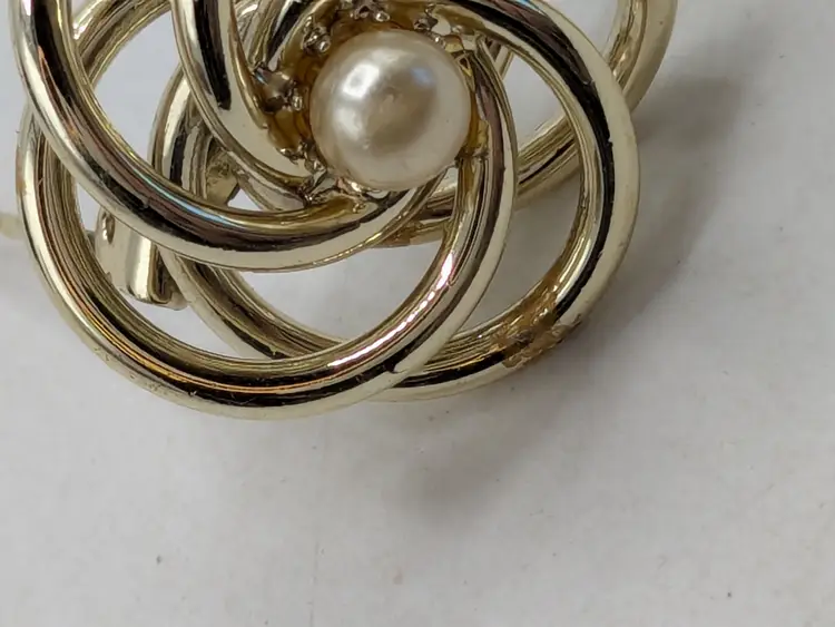 Good condition. Signed Coro. Gold tone is bright and shiny with no color loss. Features a gold tone knot design with a classic faux pearl center. Measures 1". wen
