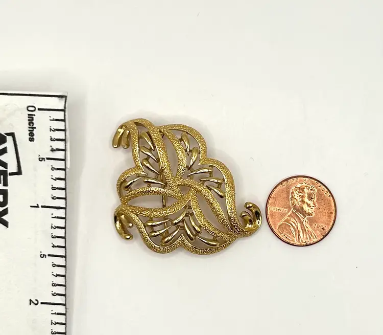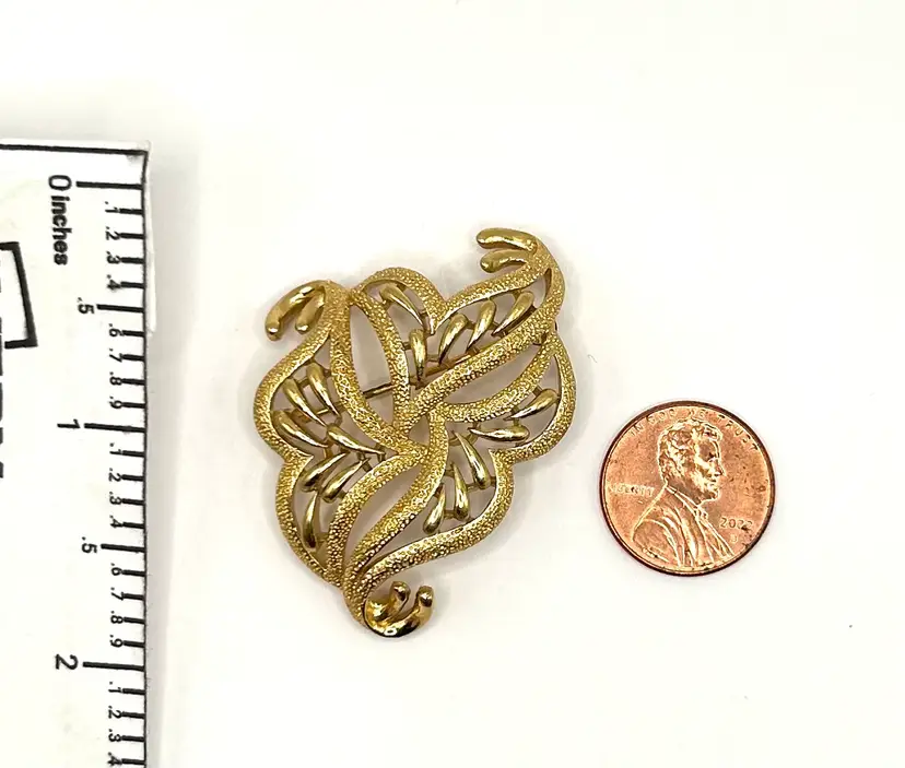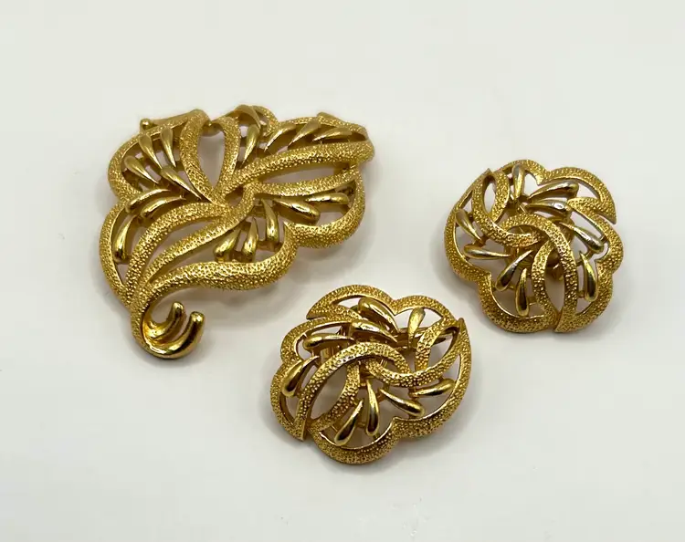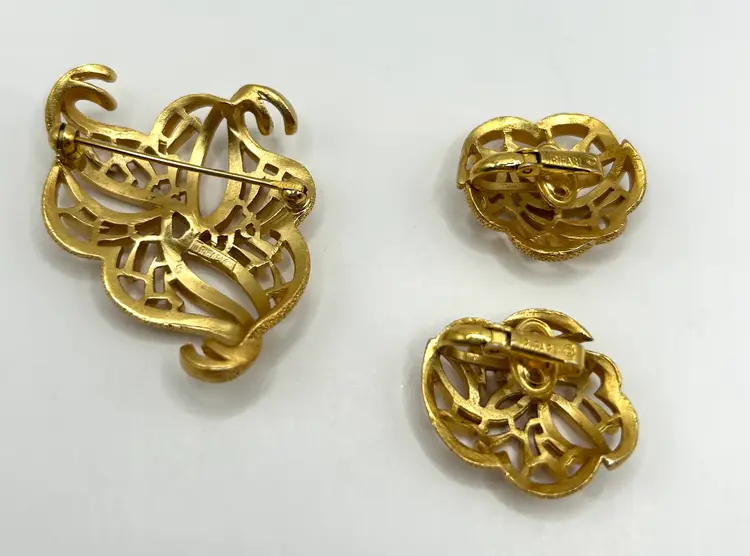 Vintage Signed Crown Trifari Gold Tone Brooch and Clip-on Earring Set
