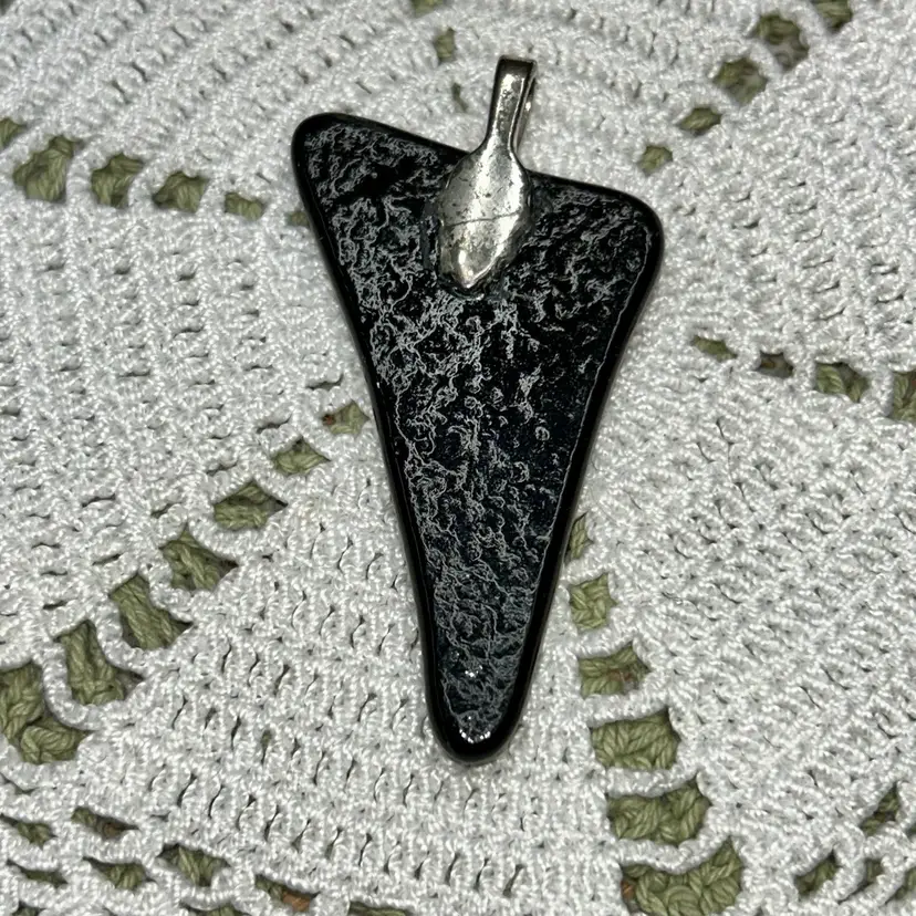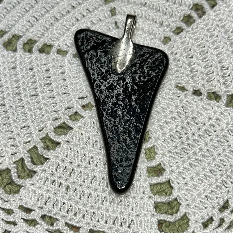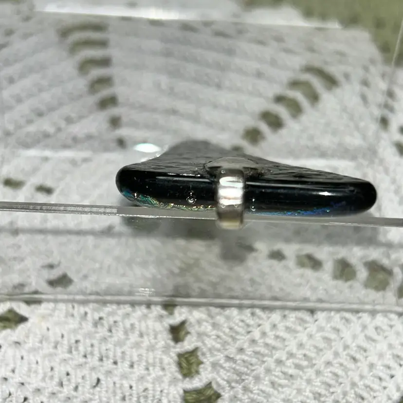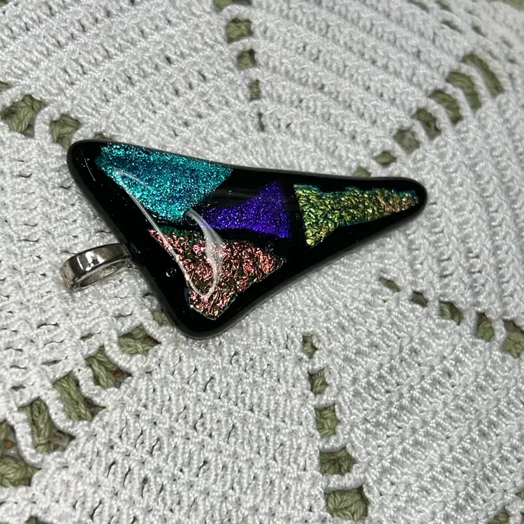 ORIGINAL PRICE: $23. Triangle with sides of 2.25”x 3.5” x 1.5”, 0.25”. Feet ending for hanging is silver-tone. Black base glass withe purple, turquoise, copper, and gold dichroic colors. This type of glass contains multiple micro-layers of metal oxides, which cause it to reflect and transmit different wavelengths of light, resulting in a vibrant, shifting array of colors.