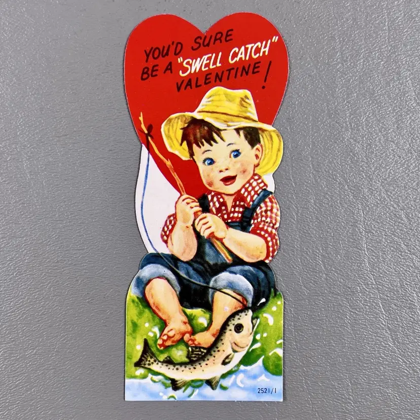 Vintage Die Cut Valentine Card Country Boy Fishing You'd Be A Swell Catch 5"
