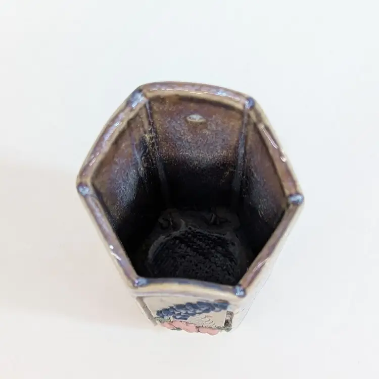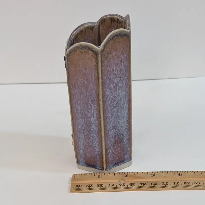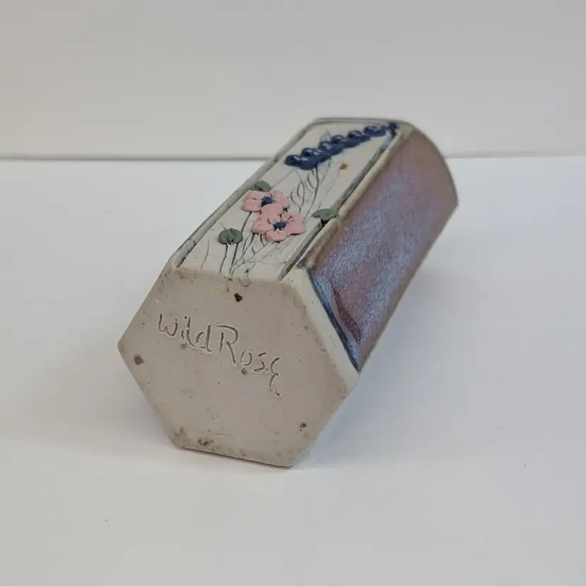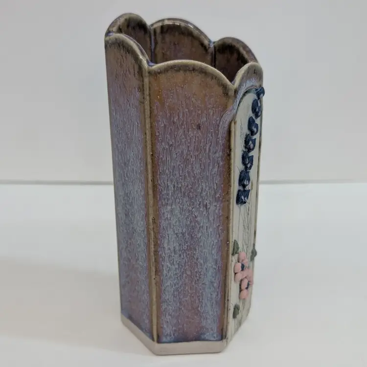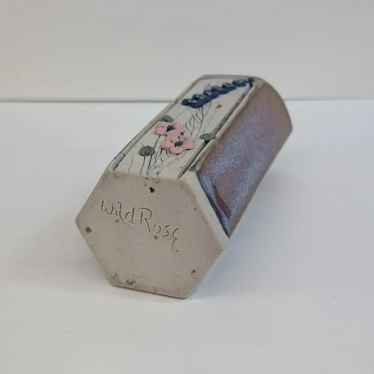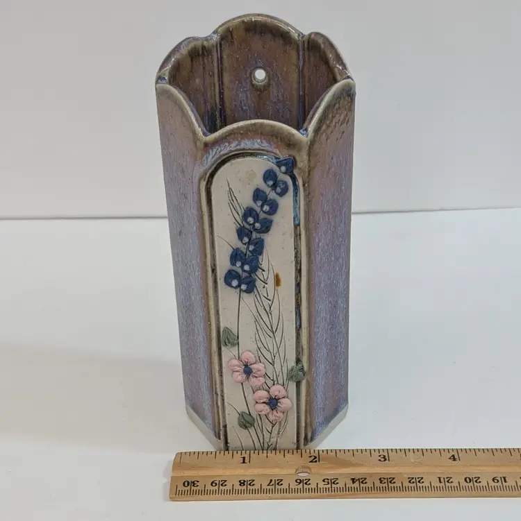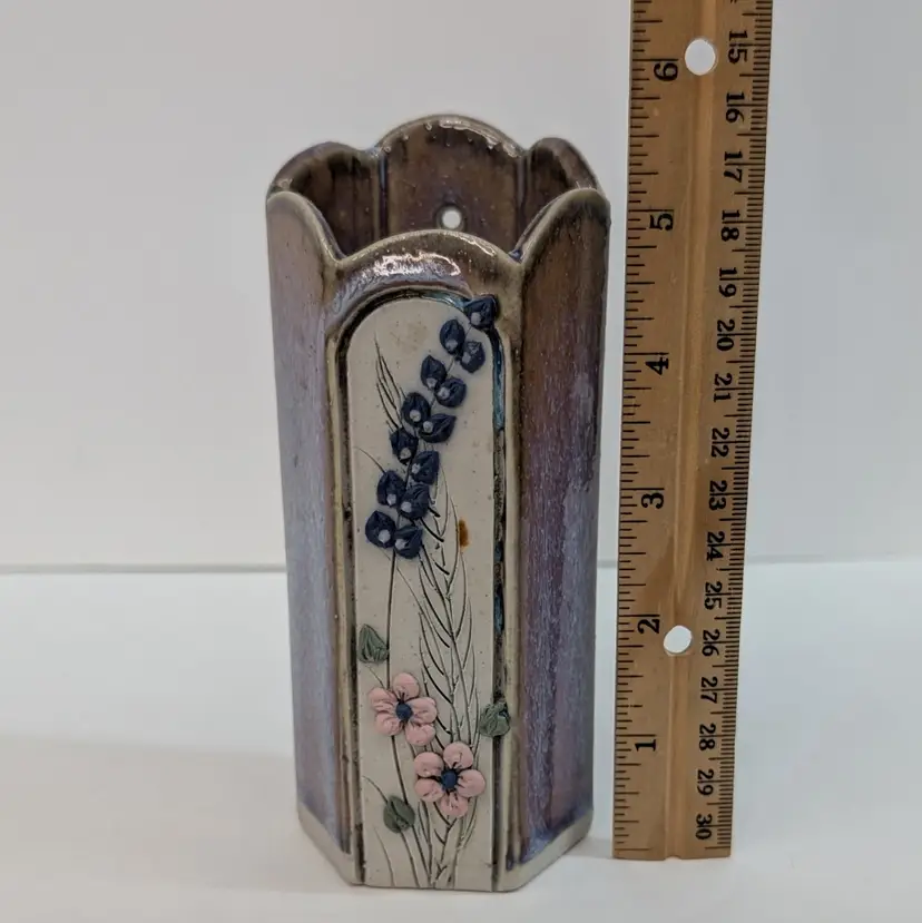 Beautiful studio pottery vase with a hole so it can be used as a wall pocket. One panel has 3 dimensional flowers and the rest is a lovely purple/blue glaze. It is signed on the bottom "Wild Rose." In nice, used condition. Measurements ~ 2.5 x 2.25 x 5.5"
